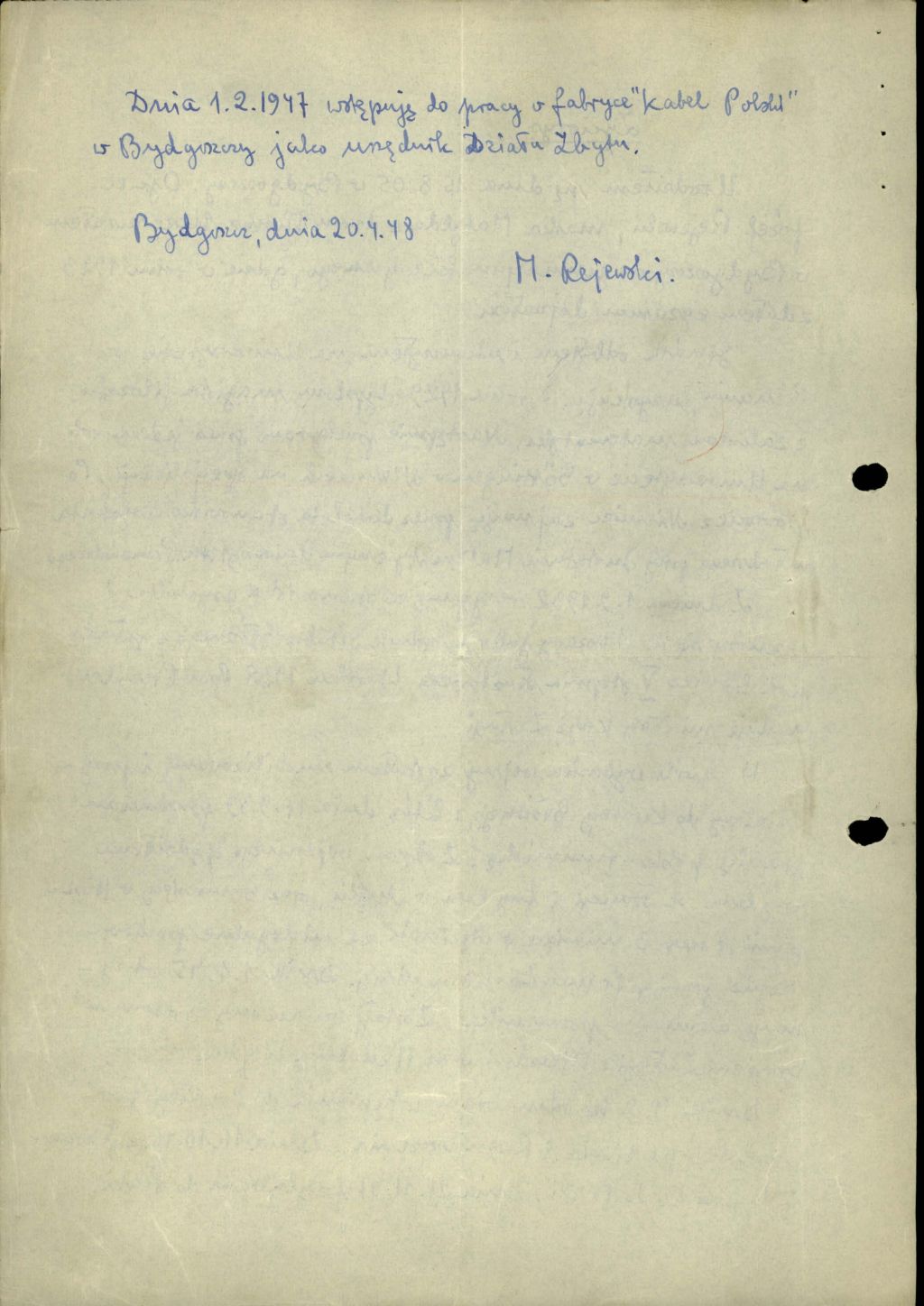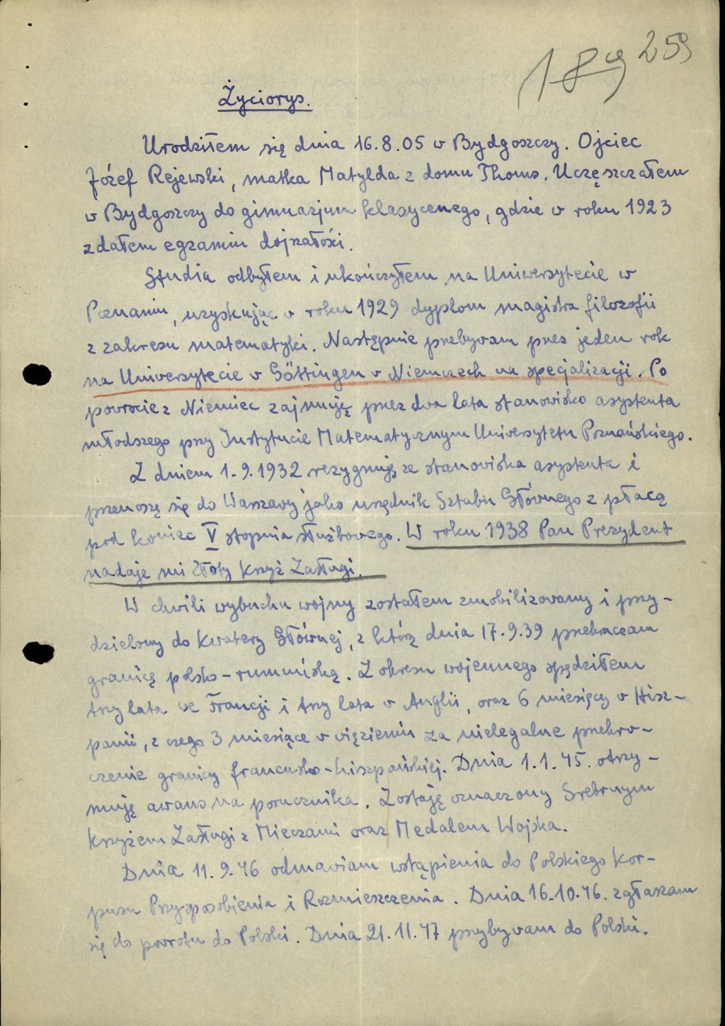 Życiorys własnoręcznie spisany przez Mariana Rejewskiego w dniu 20 kwietnia 1948 r. w Bydgoszczy z akt sprawy ewidencyjno-obserwacyjnej kryptonim „Kryptolog” sygn. 1726/II dotyczącej Mariana Rejewskiego, wybitnego polskiego matematyka i kryptologa, któremu udało się złamać szyfr Enigmy (IPN By 044/200).