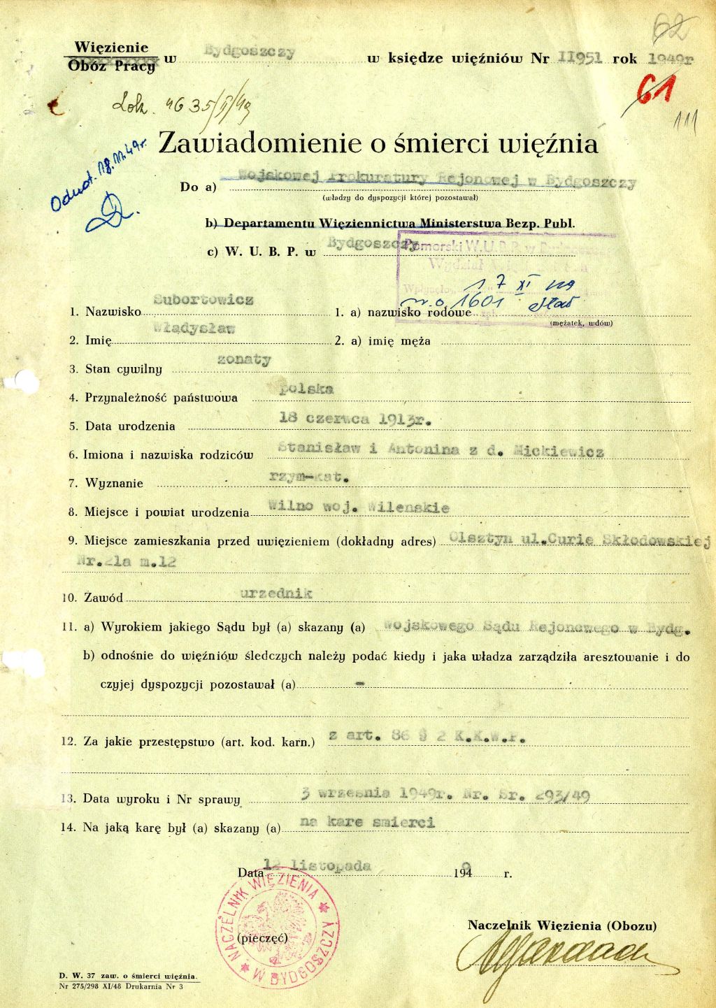Protokoły wykonania wyroku śmierci m.in. na Witoldzie Milwidzie, Jerzym Łozińskim i Władysławie Subortowiczu – członkach Ośrodka Mobilizacyjnego Okręgu Wileńskiego Armii Krajowej, skazanych z tzw. Dekretu Sierpniowego na najwyższy wymiar kary po przeprowadzonym w Bydgoszczy pokazowym procesie, w którym zarzucano im m.in. współpracę z niemieckim okupantem na terenie miasta Wilna. Zwłoki rozstrzelanych żołnierzy podziemia niepodległościowego chowano na Cmentarzu Komunalnym przy ulicy Kcyńskiej w Bydgoszczy. Materiały archiwalne Wydziału Więziennictwa i Obozów Wojewódzkiego Urzędu Bezpieczeństwa Publicznego w Bydgoszczy sygn. OOP-471 (IPN By 159/1).