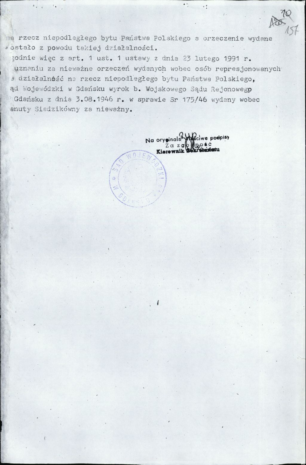 10 czerwca 1991 r. Sąd Wojewódzki w Gdańsku wydał postanowienie o uznaniu wyroku Wojskowego Sądu Rejonowego za nieważny.