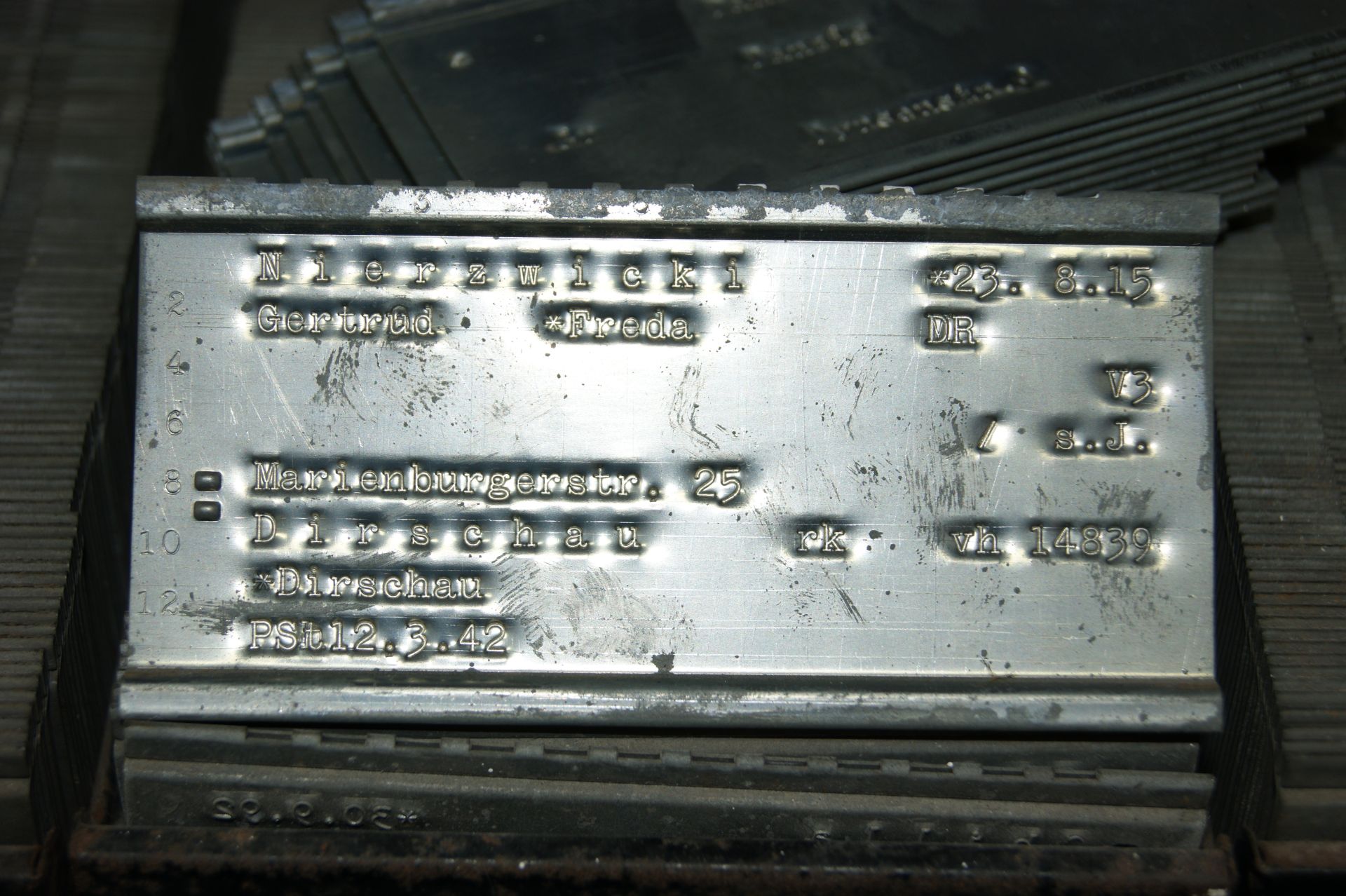 Kartoteka adresowa mieszkańców Tczewa z lat 1939-1945 mająca postać metalowych blaszek stanowi unikatowy materiał ewidencyjny (IPN Gd 40).