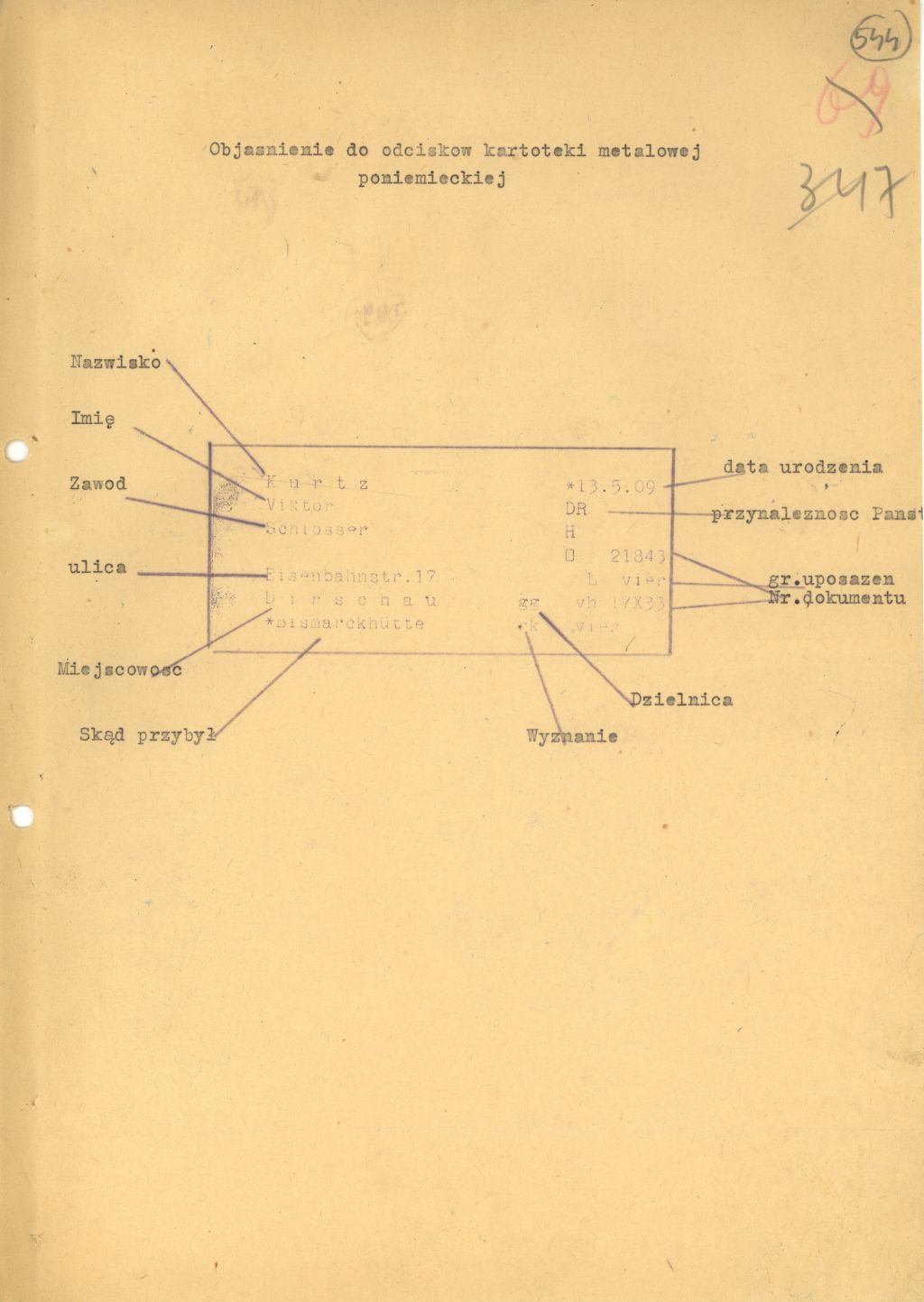 W aktach jednej ze spraw karnych prowadzonych przez Sąd Okręgowy w Gdańsku znajdują się dokumenty wyjaśniające skróty i symbole stosowane w niemieckiej kartotece ewidencyjnej. Informacje, wybite na blaszce zawierają: imię, nazwisko, datę urodzenia, ulicę, miejscowość, dzielnicę, zawód, przynależność państwową, wyznanie, grupę uposażenia, numer dokumentu, informacje skąd przybyła dana osoba (IPN Gd 607/129).