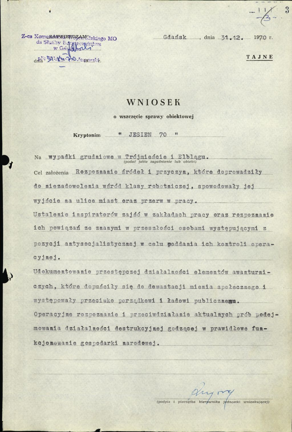 Wniosek o wszczęcie sprawy obiektowej „Jesień 70”. Gdańsk 31 grudnia 1970 r. (IPN Gd 003/14 t. 4, k. 3) -