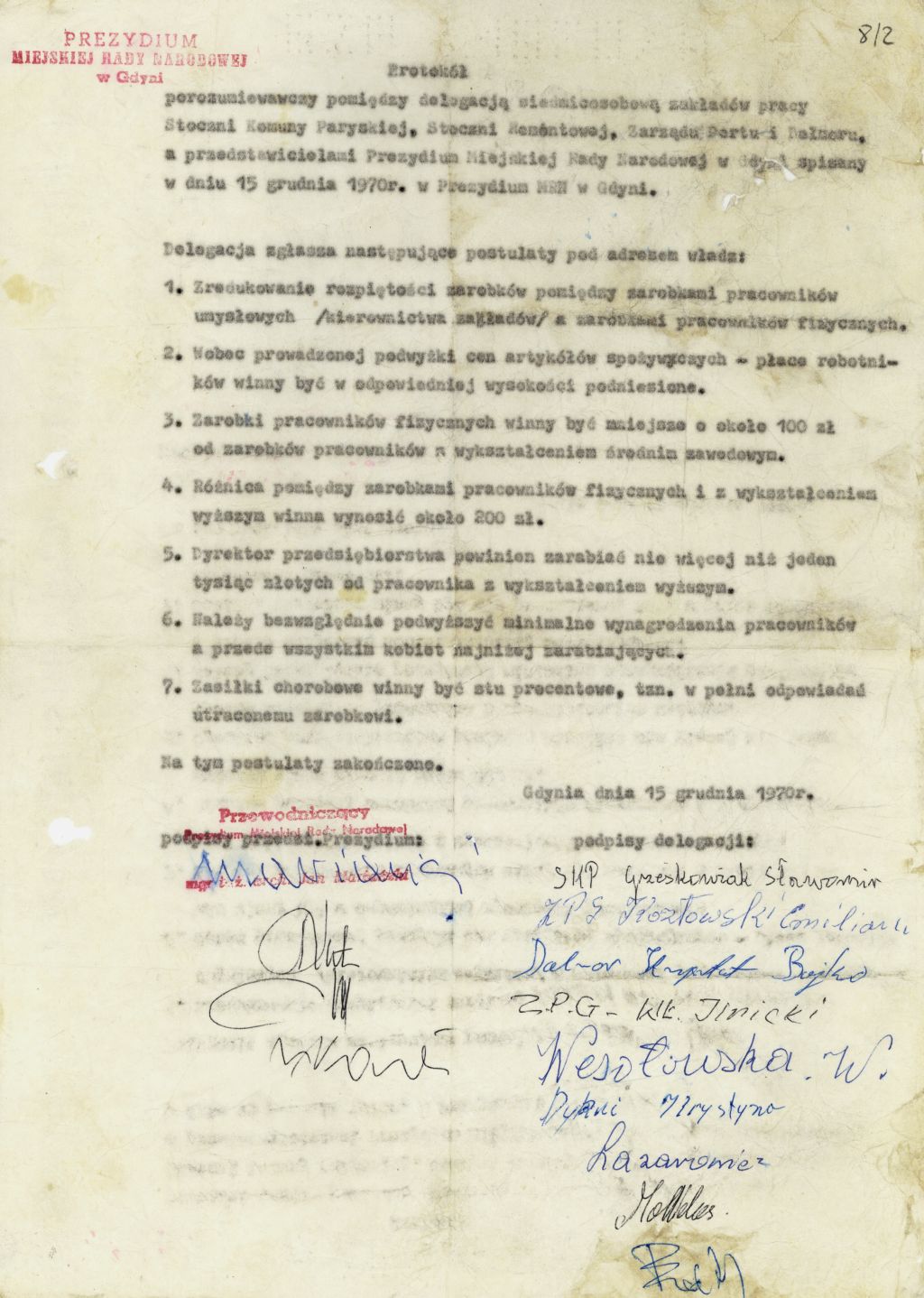 Protokół porozumiewawczy między przedstawicielami strajkujących zakładów pracy a władzami miasta Gdyni, 15 grudnia 1970 r. -