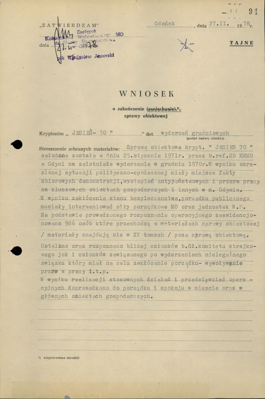 Wniosek o zakończenie sprawy obiektowej „Jesień 70”. Gdańsk 27 lutego 1978 r.