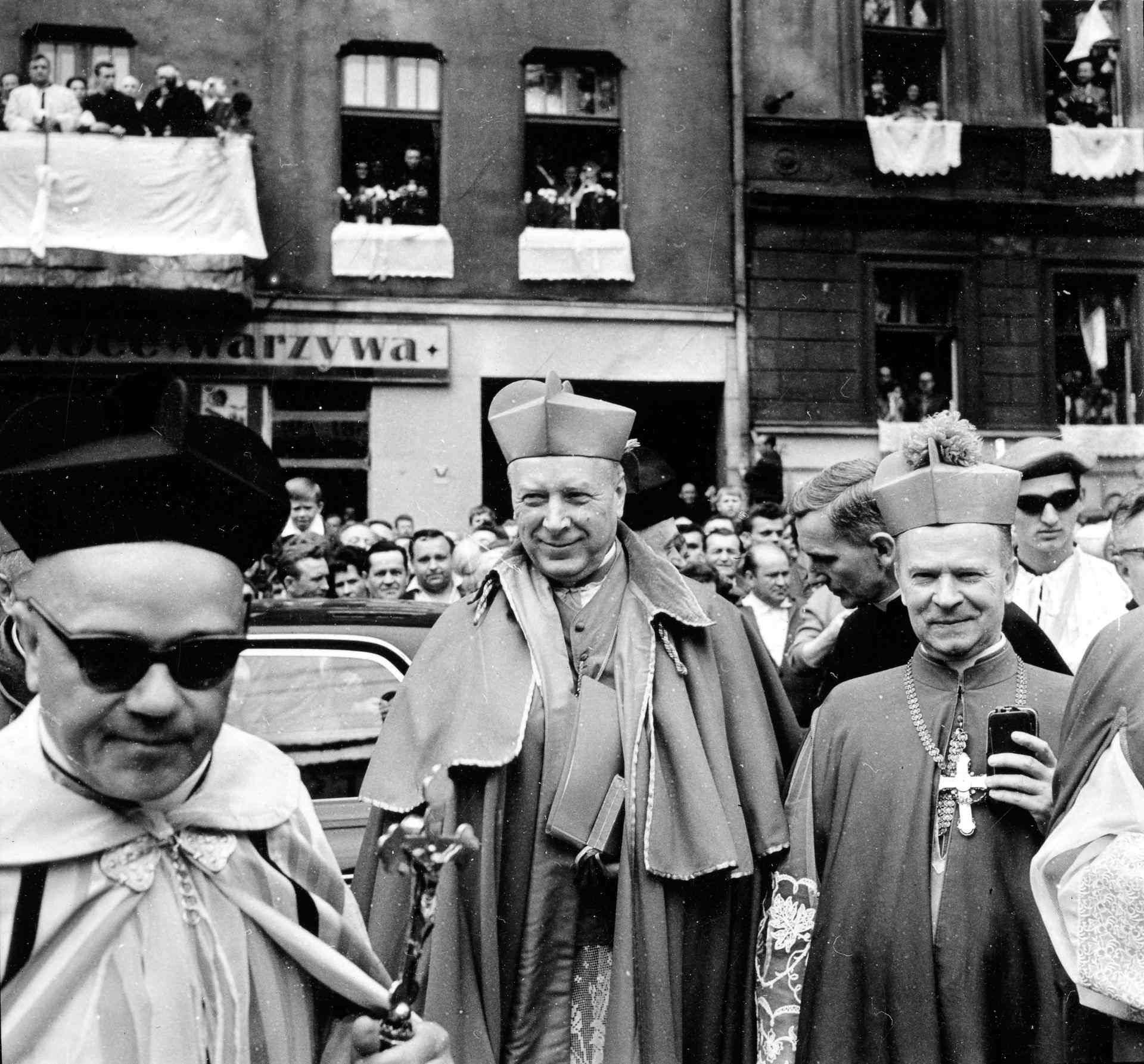 Obchody milenijne w Piekarach Śląskich 22 maja 1966 r.; na zdjęciu m.in. kard. Stefan Wyszyński i bp Herbert Bednorz -