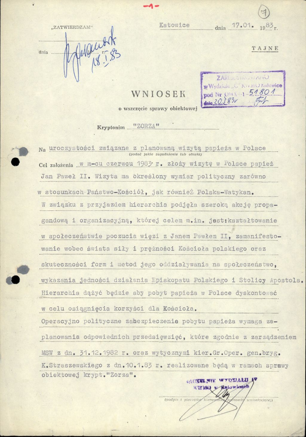 Wniosek Naczelnika Wydz. IV SB KWMO w Katowicach, ppłk. Jerzego Birnbacha, o wszczęcie sprawy obiektowej kryptonim „Zorza” z 17 stycznia 1983 r. (AIPN Ka 030/177, t. 1, k. 7) -