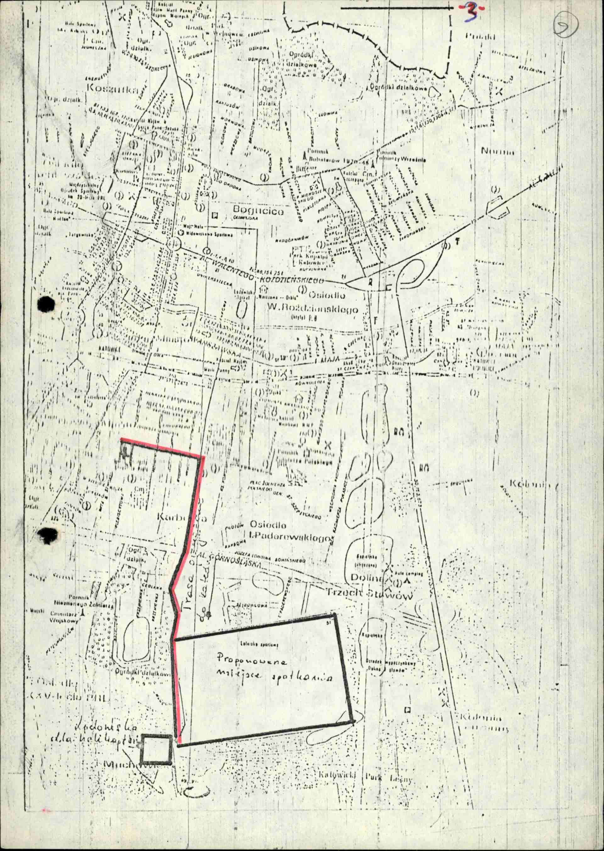 Mapka z planowanym miejscem spotkania i trasą przejazdu kolumny z papieżem z lotniska na Muchowcu do Katedry (AIPN Ka 030/177, t. 1, k. 9) -