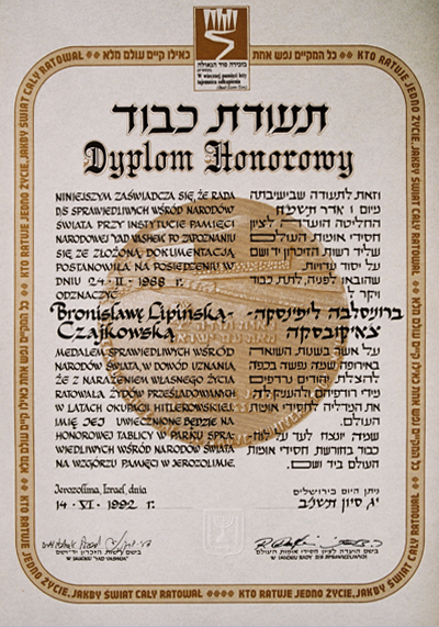 Dyplom honorowy zaświadczajacy przyznanie medalu „Sprawiedliwych wśród Narodów Świata” Bronisławie Lipińskiej-Czajkowskiej (żonie Andrzeja). Ze zbiorów rodziny Lipińskich. -