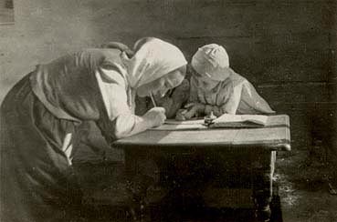Wiktoria Ulma uczy jedno ze swoich dzieci. -