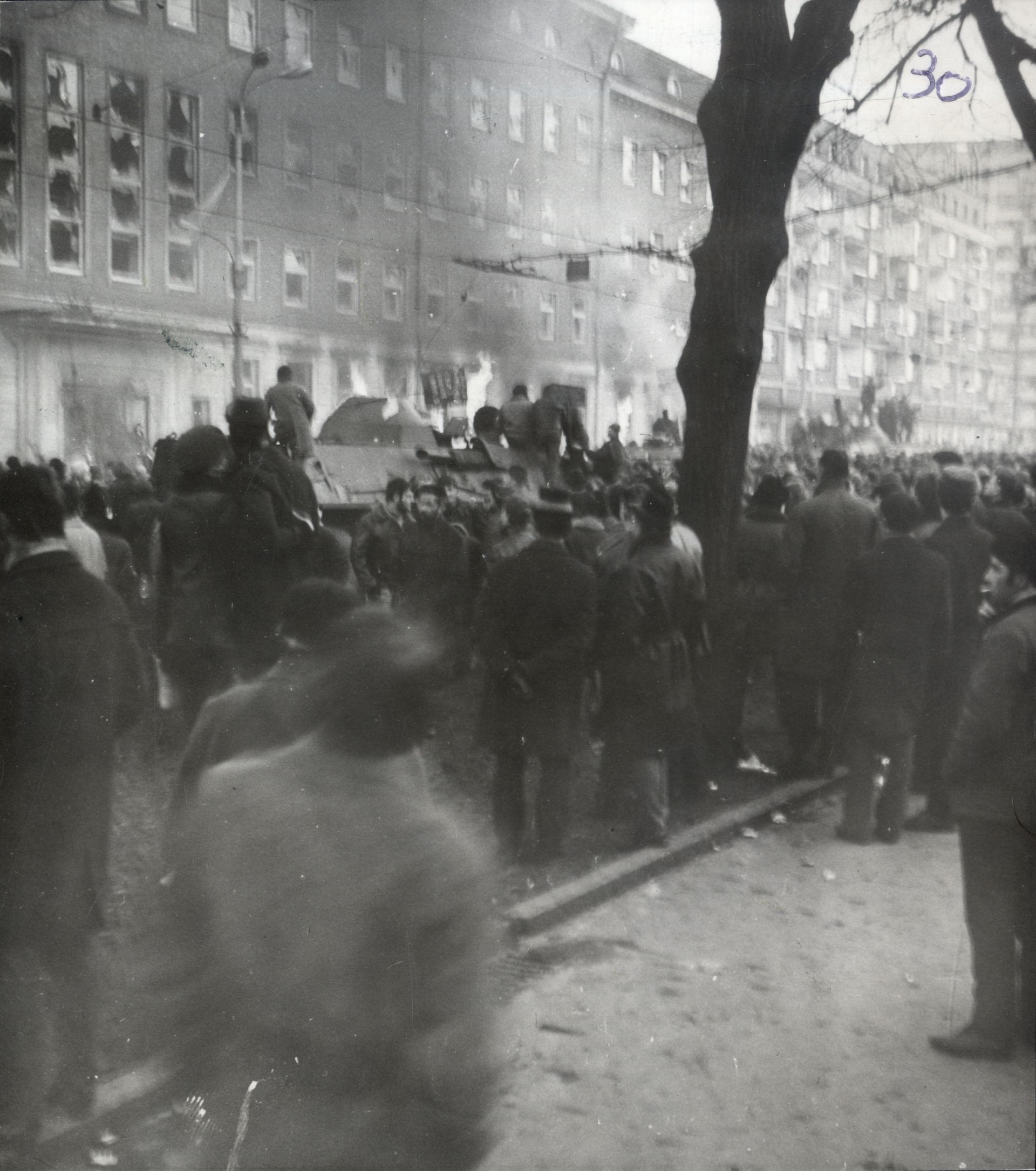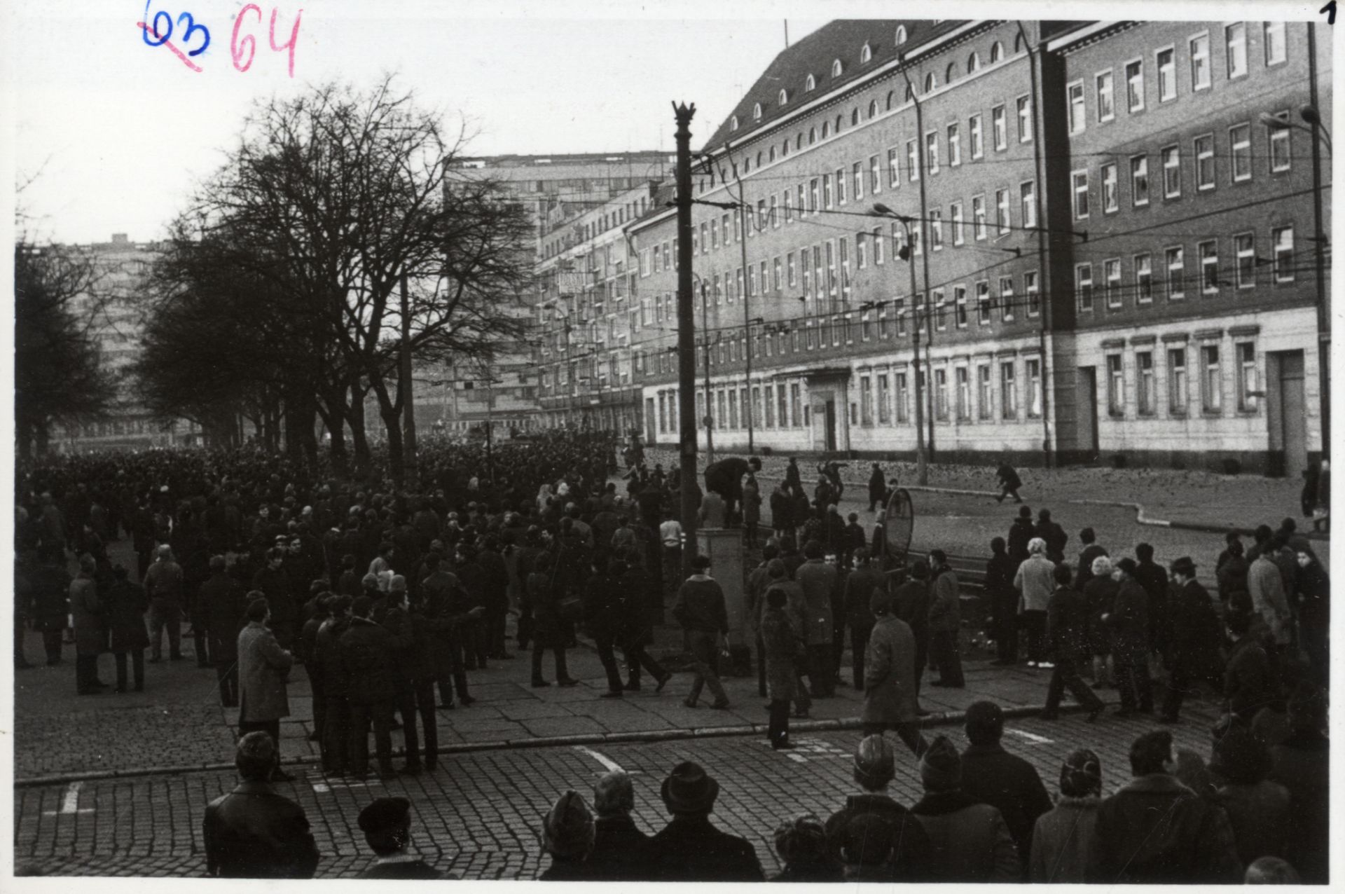 Demonstranci i wojsko przed budynkiem KW PZPR w Szczecinie. (IPN Sz 0012/323 t. 1) -
