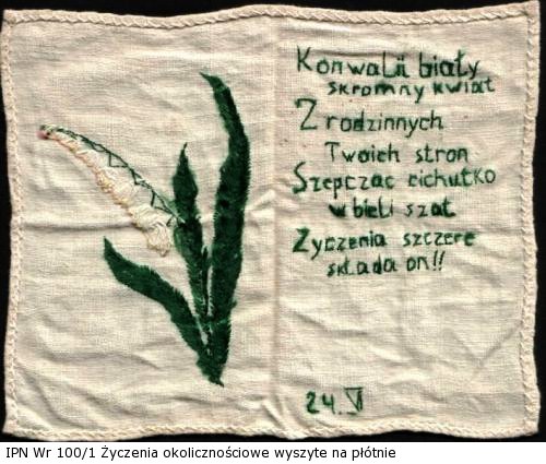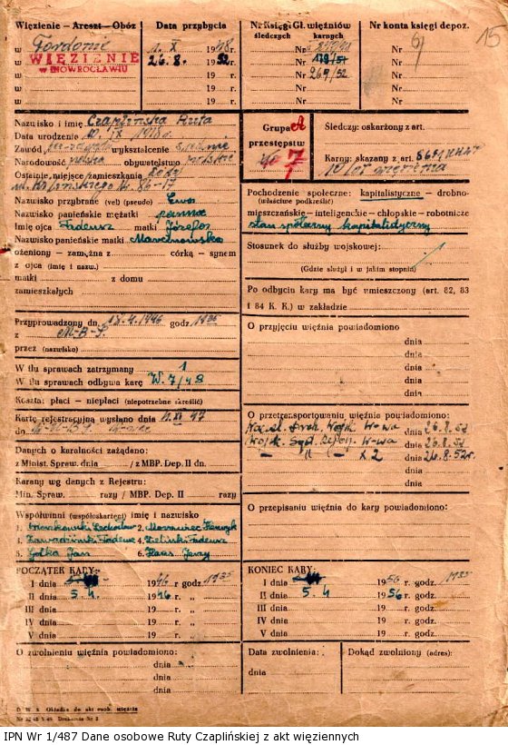 Okładka akt osobowych więźniarki Ruty Czaplińskiej Dane osobowe Ruty Czaplińskiej z akt więziennych Opis więźnia z akt Ruty Czaplińskiej Zawiadomienie o nieuwzględnieniu prośby Ruty Czaplińskiej w sprawie przedterminowego zwolnienia z więzienia , 31.08.1955 r. Kartka pocztowa adresowana do Józefy Czaplińskiej, 14.12.1947 Kartka pocztowa adresowana do Józefy Czaplińskiej, 14.12.1947 Życzenia okolicznościowe wyszyte na płótnie Tekst pisany wierszem sporządzony na płótnie Tekst pisany wierszem sporządzony na płótnie