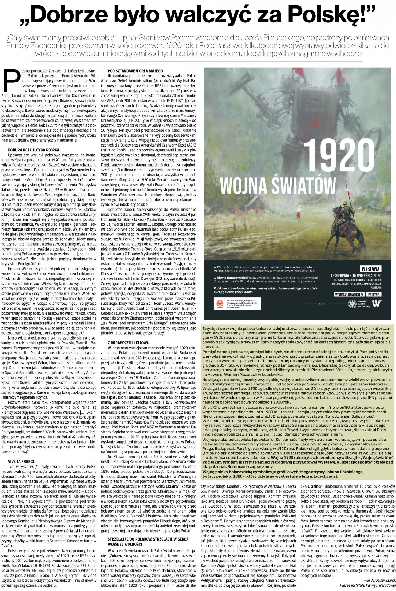 Jarosław Szarek: „Dobrze było walczyć za Polskę!”, „Rzeczpospolita” z 14 sierpnia 2020