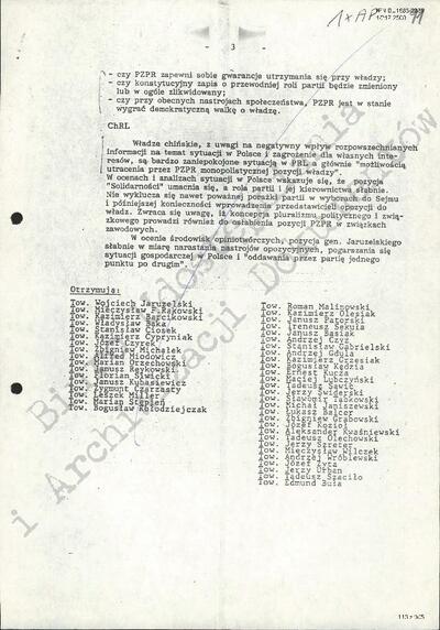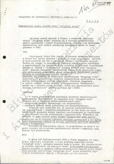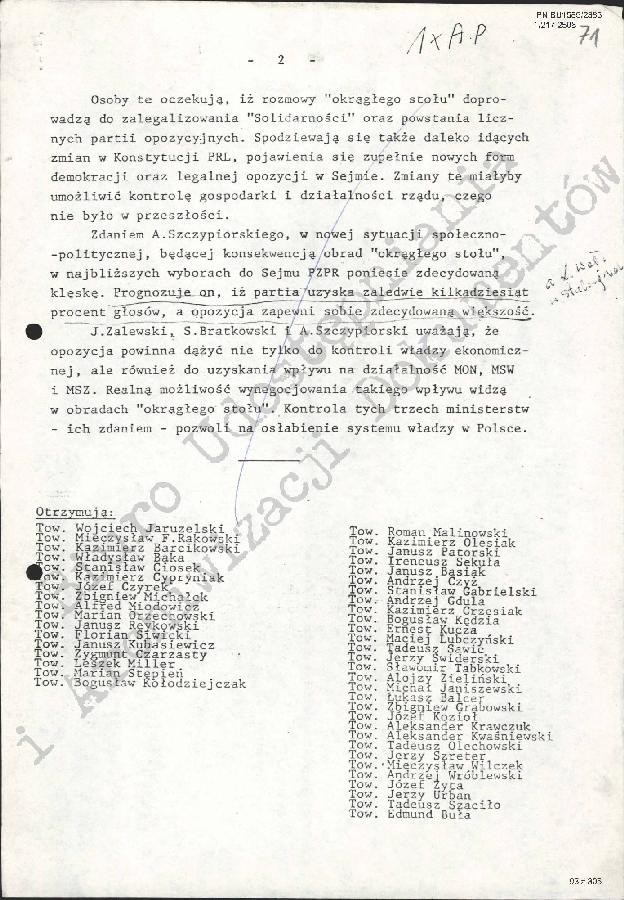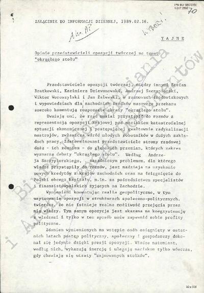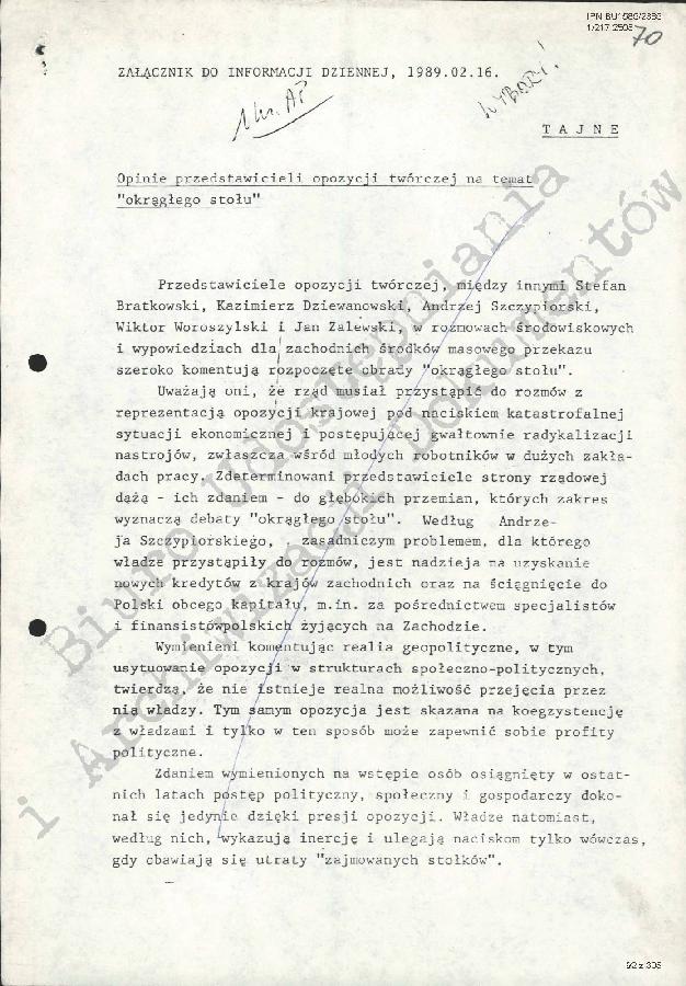W okresie trwania obrad okrągłego stołu gen. Jaruzelski i jego najbliżsi współpracownicy byli doskonale zorientowani w przebiegu dyskusji oraz sporach toczonych wewnątrz “Solidarności”. Dla przykładu w dwa dni po posiedzeniu Krajowej Komisji Wykonawczej NSZZ “Solidarność” 28 marca 1989 r. dyrektor Departamentu III MSW gen. Krzysztof Majchrowski skierował do Jaruzelskiego oraz ścisłego kierownictwa MSW (Cz. Kiszczak, W. Pożoga, H. Dankowski) sześciostronicową notatkę zawierającą sprawozdanie z przebiegu obrad. Kończyła ją adnotacja: ”ze względu na konieczną ochronę cennego źródła, informacja jest przeznaczona tylko dla I sekretarza KC PZPR”. Zwracając otrzymany do lektury egzemplarz notatki gen. Kiszczak napisał: “Dziękuję, kiedy uznacie za możliwe to przekazać również tow. Cioskowi”.