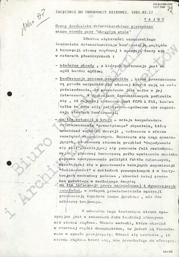 W trakcie dwumiesięcznych obrad niezwykle istotną rolę odgrywały kontrolowane przez władze media, które poświęciły okrągłemu stołowi - zgodnie z instrukcją kierownictwa PZPR - bardzo dużo miejsca. Od sposobu w jaki relacjonowano spory negocjujących stron, w dużym stopniu zależał wszak społeczny odbiór okrągłego stołu. Dla władz możliwość propagandowego zdyskontowania tego wydarzenia w celu uspokojenia nastrojów społecznych była jednym z najistotniejszych motywów przystąpienia do rozmów. Celu tego nie zdołano osiągnąć i to nie tylko dlatego, że zainteresowanie społeczne obradami okrągłego stołu okazało się mniejsze niż oczekiwano. Równie istotny okazał się ujawniony wówczas kryzys w zarządzaniu przez aparat Komitetu Centralnego i kierownictwo Radiokomitetu mediami elektronicznymi. Zachowała się przygotowana w kwietniu 1989 r. dla gen. Jaruzelskiego obszerna analiza sytuacji w środowisku dziennikarzy radia i telewizji, której autorzy - funkcjonariusze Departamentu III MSW - szukali odpowiedzi na pytanie o przyczyny licznych “rażących potknięć” na antenie, “przynoszących władzom wyłącznie szkody propagandowe, powodujące dezorientację odbiorców”. Za najważniejszą uznano panujące wśród pracowników RTV “nastroje pesymizmu, zwątpienia i frustracji”. Najbardziej zasłużeni w walce propagandowej dziennikarze mieli być “zaskoczeni, a często i przygnębieni nerwowymi reakcjami władz polityczno-administracyjnych (...) zbyt drobiazgowo oceniającymi poszczególne programy”. Źródłem frustracji miała być też obawa przed “ewentualnym niekontrolowanym rozpadem PZPR i następującym po nim okresie destabilizacji”. Tego rodzaju opiniom towarzyszyły też wypowiedzi “o konieczności zwołania XI Zjazdu PZPR, wymiany działaczy sprawujących władzę”.