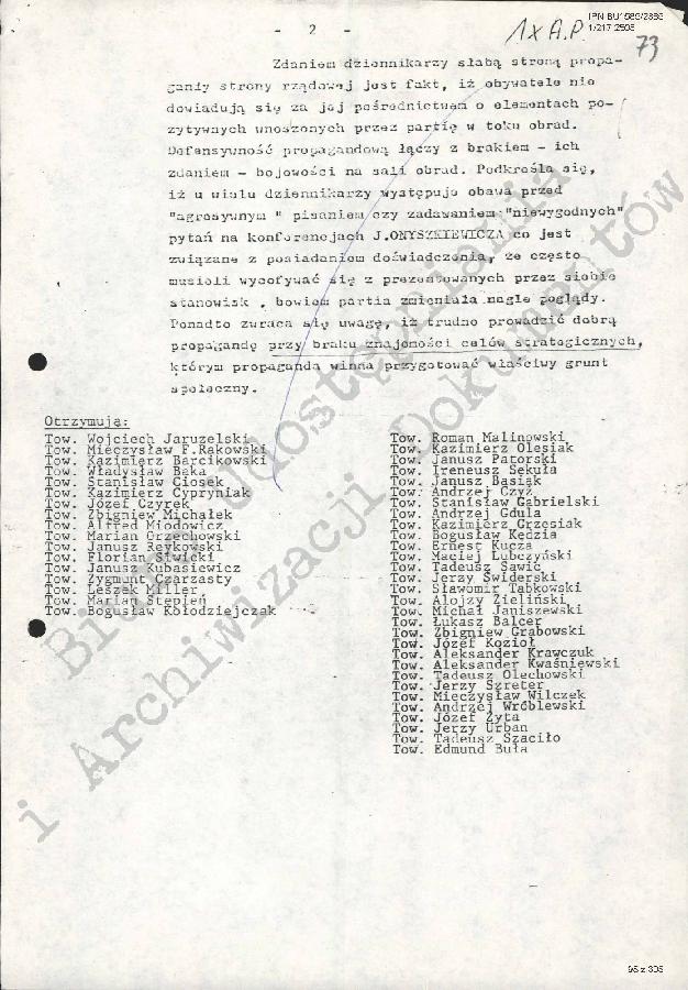 Fatalne nastroje w środowisku dziennikarzy RTV potęgować miał “brak w tak trudnym dla tej instytucji okresie prężnego kierownictwa”. Podpisany pod informacją MSW dla Jaruzelskiego dyrektor Departamentu III gen. Krzysztof Majchrowski oskarżał prezesa Radiokomitetu Janusza Roszkowskiego o doprowadzenie do sytuacji w której “większość szefów redakcji pozbawiona >ręcznego sterowania< (nie odbywają się nawet posiedzenia kierownictwa Radiokomitetu) stała się bezradna”. Majchrowski nie ograniczył się do sugestii o konieczności szybkiej zmiany prezesa, ale też - w oględnej formie relacjonowania “dyskusji wokół jego następcy” - przedstawił swoich faworytów (m. in. Bogdana Jachacza i Jerzego Ambroziewicza), deprecjonując równocześnie innych. W tej ostatniej grupie – obok Krzysztofa Teodora Toeplitza – najbardziej krytycznie oceniony został ówczesny szef Dyrekcji Programów Informacyjnych Andrzej Bilik, który miał być “zainteresowany budowaniem własnej kariery, najchętniej dyplomatycznej” i uznawać pracę w Radiokomitecie za “za okres przejściowy przed nowym wyjazdem na placówkę zagraniczną”. Tym razem Jaruzelski nie skorzystał z propozycji personalnych gen. Majchrowskiego i nowym prezesem Radiokomitetu został jeszcze w kwietniu nie wymieniony nawet w piśmie MSW Jerzy Urban. [...]