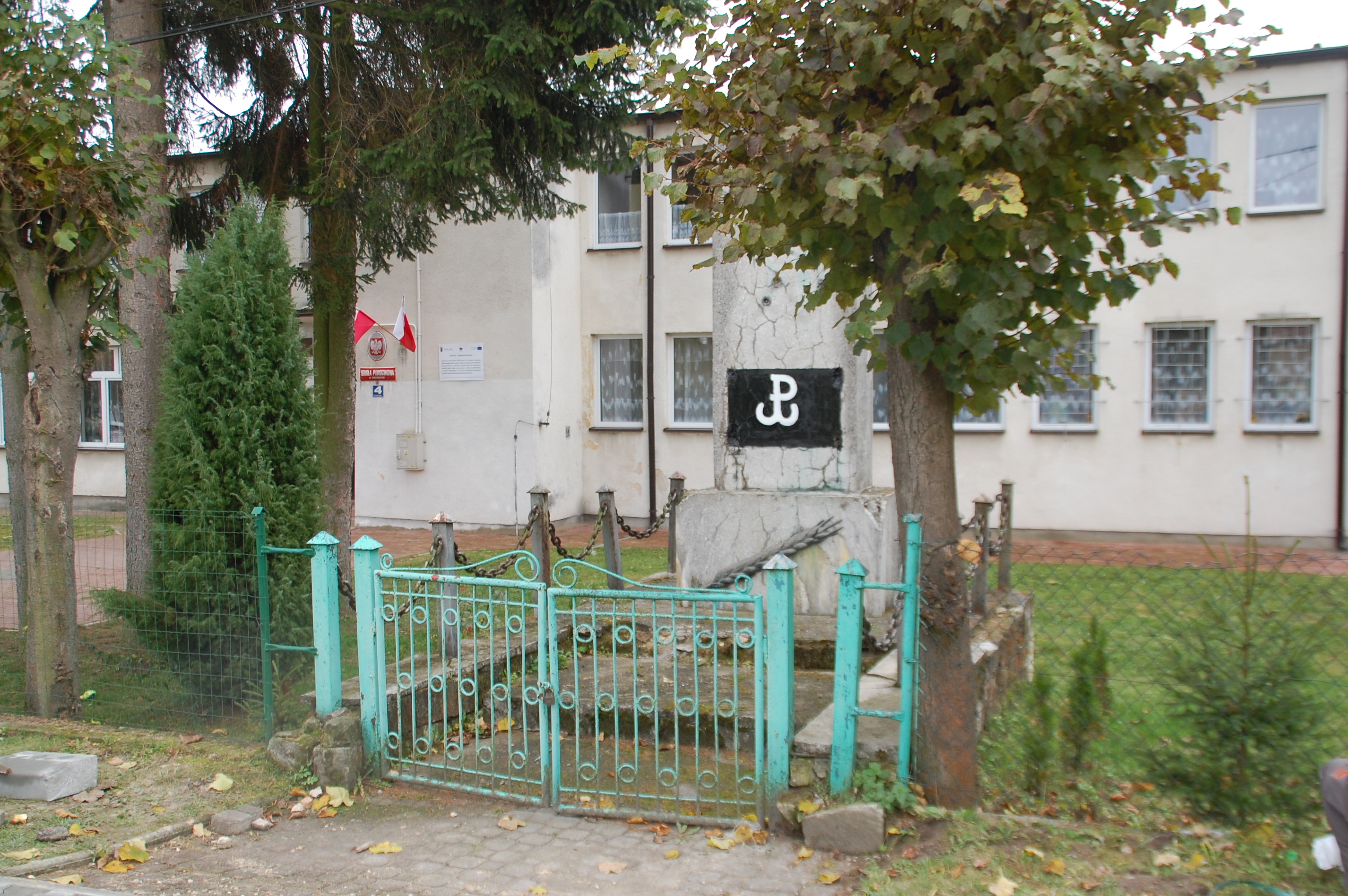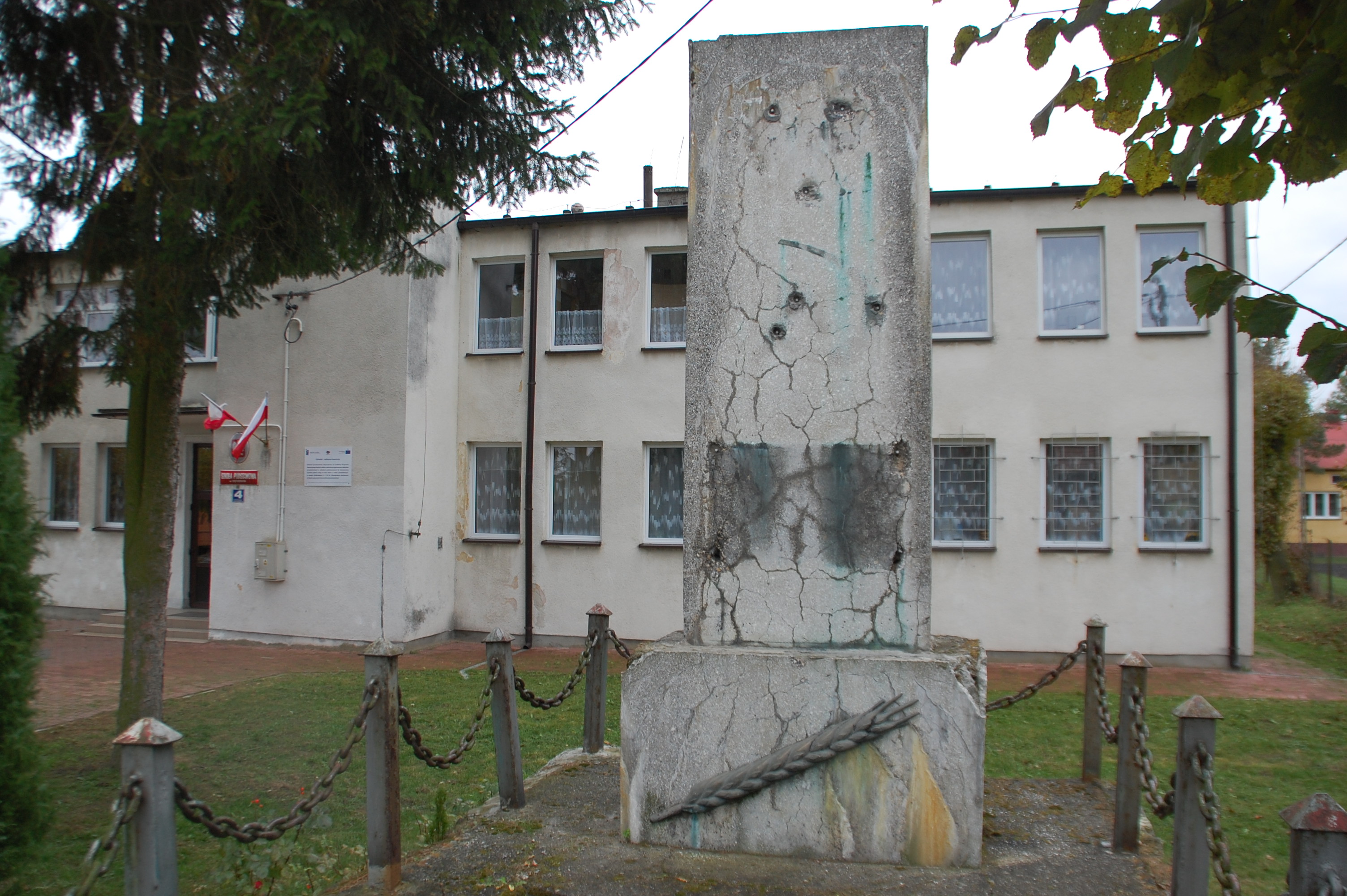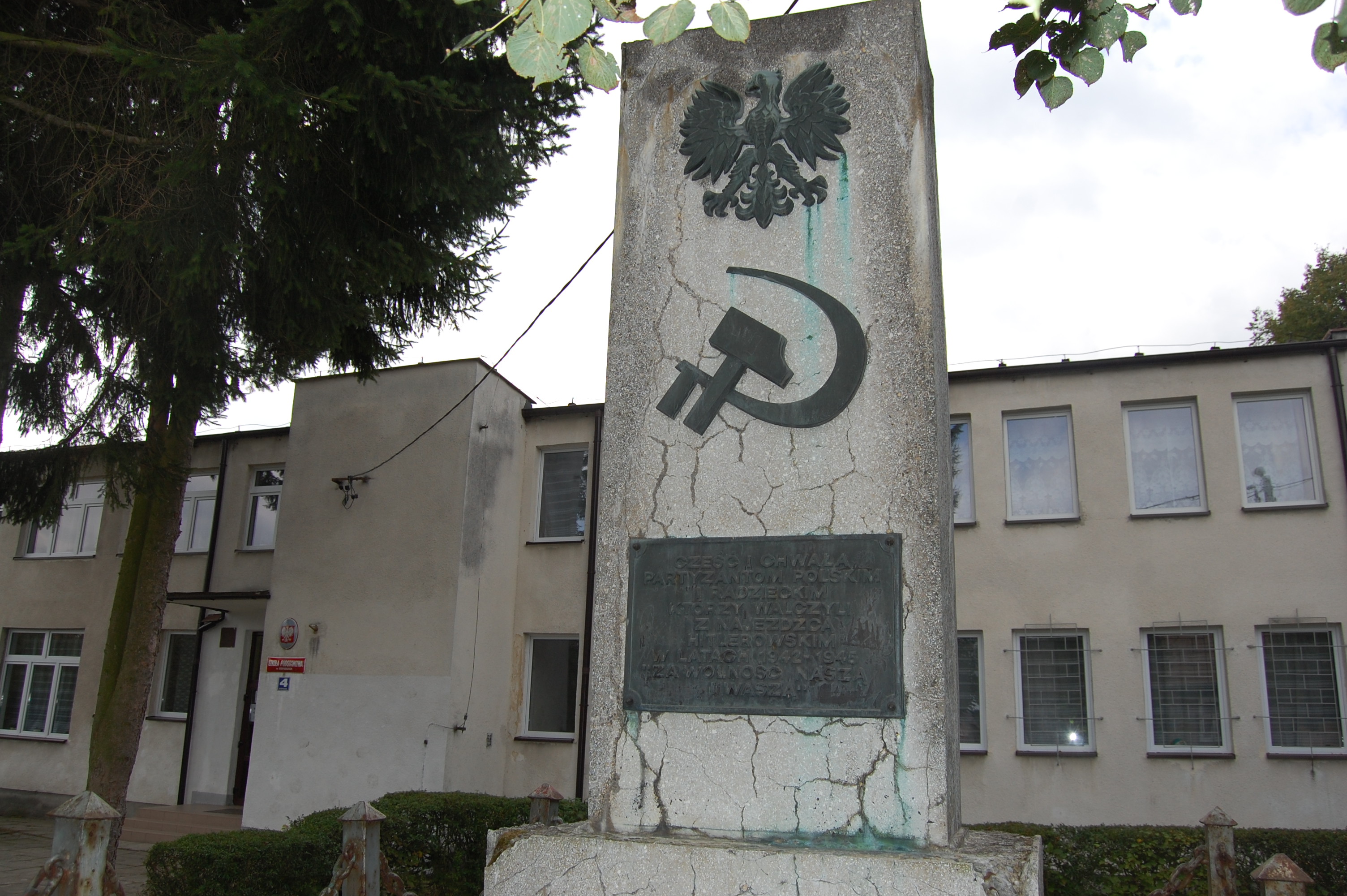 Obiekt został wybudowany w latach 70.Umieszczono na nim dużych rozmiarów symbol ideologii komunistycznej w postaciskrzyżowanego sierpa i młota oraz godło PRL. Inskrypcja na tablicy głosiła „cześći chwałę” partyzantów sowieckich i komunistycznych (co zgodnie z ówczesnąpraktyką podkreślono datami 1942-1945, odnoszącymi się do okresu funkcjonowaniakomunistycznej PPR i jej formacji zbrojnych pod okupacją niemiecką).