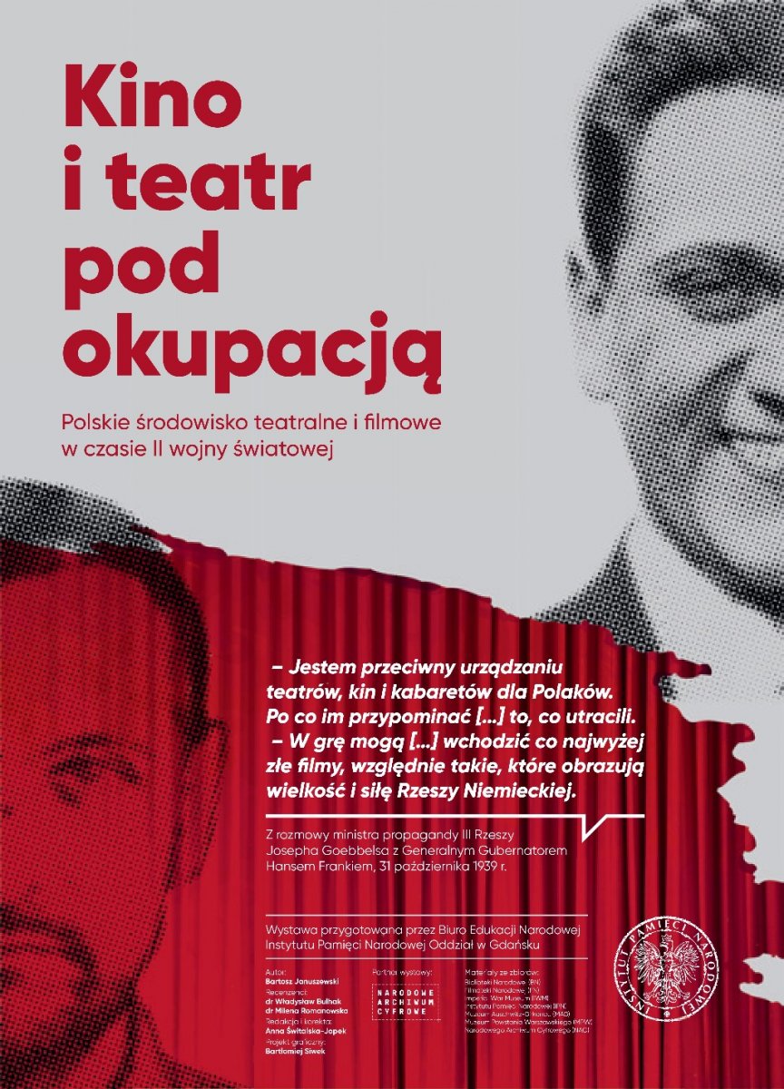 W 2017 r. Instytut Pamięci Narodowej Oddział w Gdańsku przygotował wystawę pt. „Kino i teatr pod okupacją. Polskie środowisko filmowe i teatralne w czasie II wojny światowej”. Wystawa prezentuje początki kina na ziemiach polskich oraz najważniejsze zjawiska i trendy w kinematografii II RP. Następnie przenosi w ponury czas II wojny światowej, przedstawiając sytuację, w jakiej znalazły się kino i teatr pod okupacją niemiecką, sowiecką oraz na uchodźstwie, a także uświadamia, jaka była skala represji wobec polskich artystów filmowych i scenicznych ze strony obu okupantów. Autorem wystawy jest Bartosz Januszewski, pracownik Oddziałowego Biura Edukacji Narodowej IPN w Gdańsku.