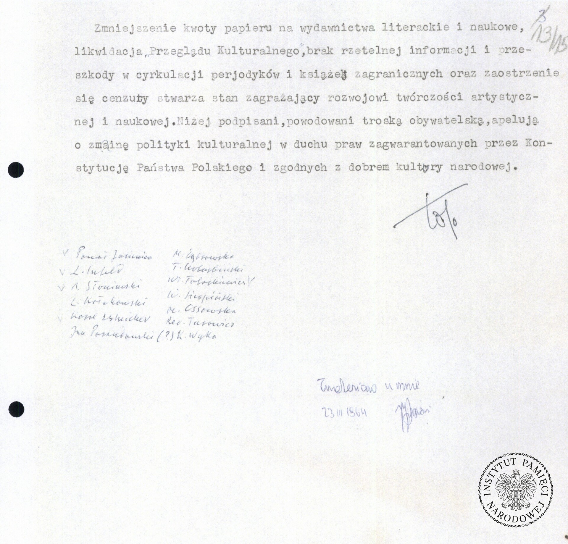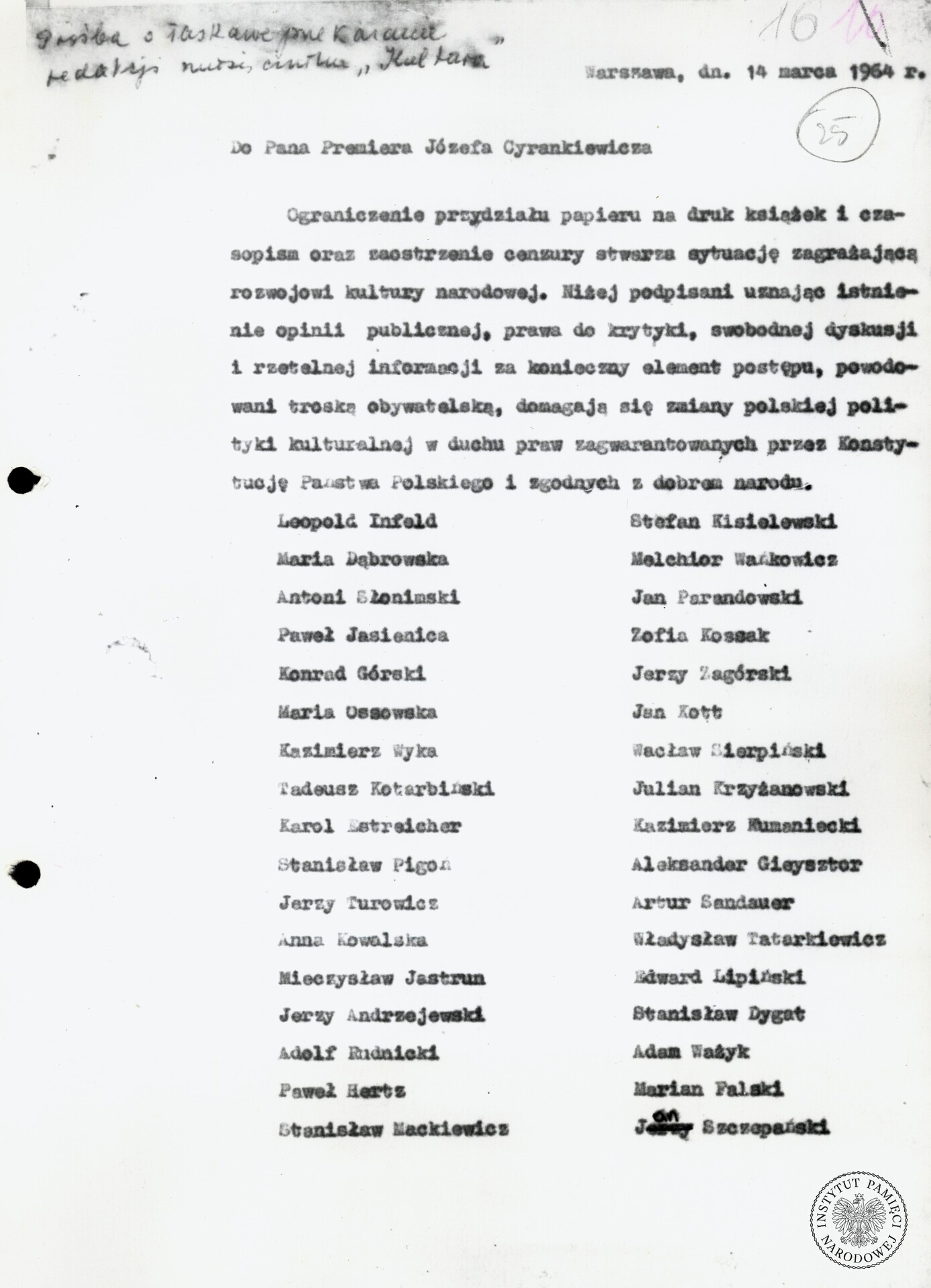 „Ograniczenia przydziału papieru na druk książek i czasopism oraz zaostrzenie cenzury prasowej stwarza sytuację zagrażającą rozwojowi kultury narodowej. Niżej podpisani, uznając istnienie opinii publicznej, prawa do krytyki, swobodnej dyskusji i rzetelnej informacji za konieczny element postępu, powodowani troską obywatelską, domagają się zmiany polskiej polityki kulturalnej w duchu praw zagwarantowanych przez konstytucję państwa polskiego i zgodnych z dobrem narodu.”