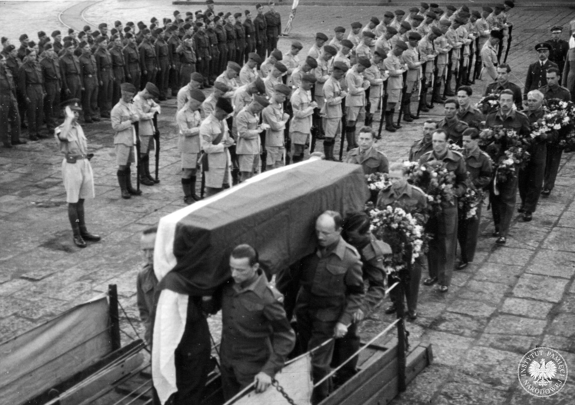 Wnoszenie trumny z ciałem premiera Rządu RP i Naczelnego Wodza Polskich Sił Zbrojnych gen. broni Władysława Sikorskiego na pokład niszczyciela ORP "Orkan" - widok z pokładu. Trumna nakryta biało-czerwoną flagą. Za trumną idą dwuszeregiem oficerowie z wieńcami. Obok kompanie reprezentacyjne armii brytyjskiej (w mundurach tropikalnych) i Królewskich Sił Powietrznych (w głębi) – fot. źródło AIPN.