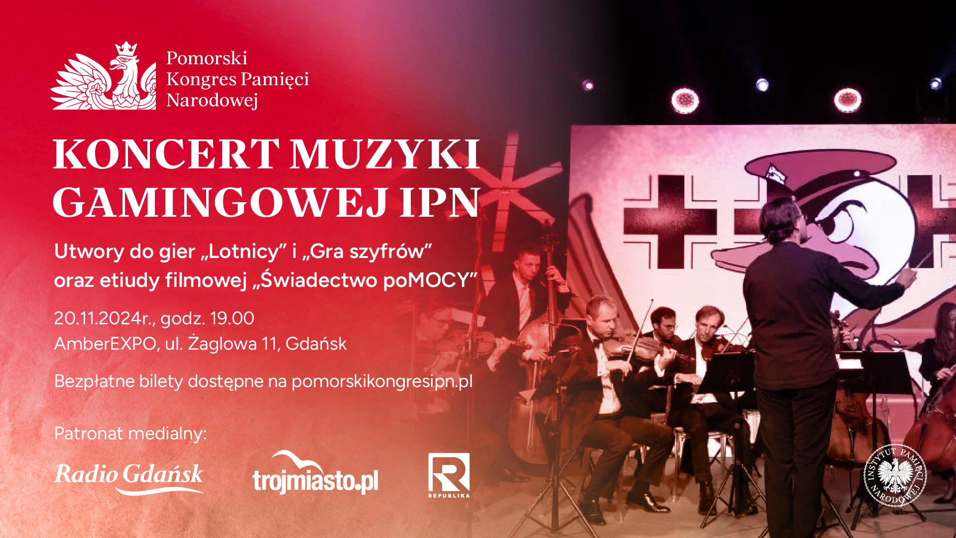 Pierwszego dnia Pomorskiego Kongresu Pamięci Narodowej o godzinie 19.00 odbędzie się koncert muzyki gamingowej. Będzie to ekscytująca podróż przez utwory skomponowane do projektów Biura Nowych Technologii: „Gry Szyfrów”, „Lotników” oraz „Świadectwa poMOCY” .