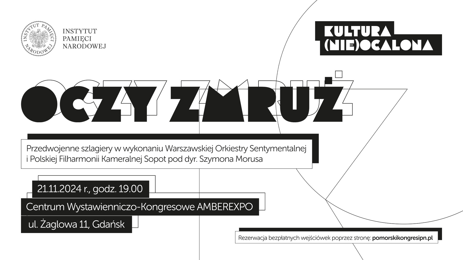 „Oczy zmruż” to jedyny i niepowtarzalny projekt będący próbą zaimplementowania muzyki typowej przedwojennej orkiestry podwórkowej do sfery klasycznej, czego efektem będą oryginalne brzmienia wykraczając poza utarte schematy stylistyczne. Podczas koncertu sięgniemy do utworów z przedwojennych rewii i kabaretów Warszawy, by przedstawić je na nowo, łącząc styl retro ze współczesnymi aranżacjami orkiestrowymi. Usłyszymy m.in. Ja bez przerwy śmieję się, Nikodem, Kiedy będziesz zakochany, Abram, ja ci zagram!, To ostatnia niedziela. Przedwojenne szlagiery w wykonaniu Warszawskiej Orkiestry Sentymentalnej i Polskiej Filharmonii Kameralnej Sopot pod dyr. Szymona Morusa.