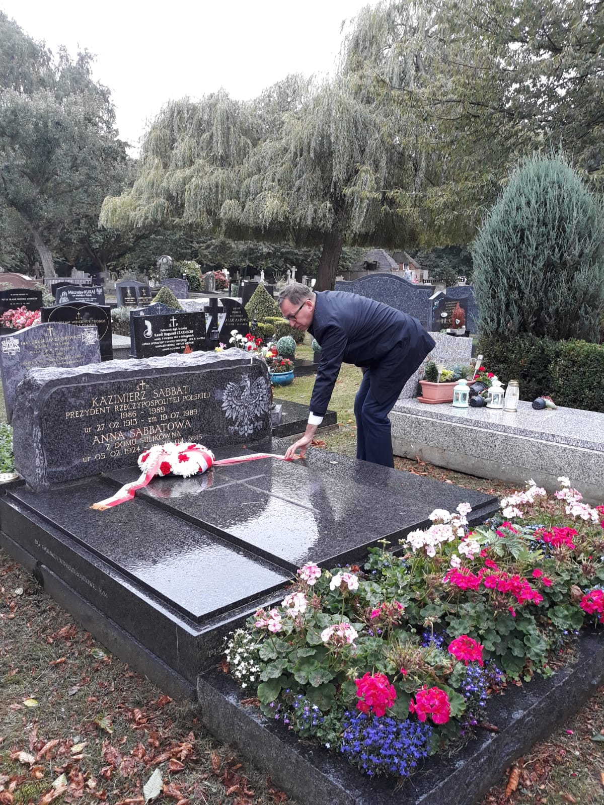 Następnie prezes IPN oraz złożył kwiaty na Cmentarzu Gunnersbury pod Pomnikiem Katyńskim (pierwszy w Europie Zachodniej pomnik upamiętniający ofiary zbrodni katyńskiej) oraz na grobie Kazimierza Sabbata, prezydenta RP na uchodźstwie (1986–1989), zmarłego na atak serca 19 lipca 1989 r. na wieść o wyborze tego dnia Wojciecha Jaruzelskiego na prezydenta.