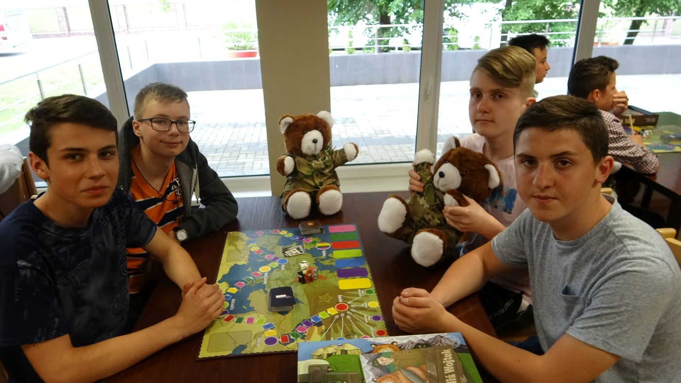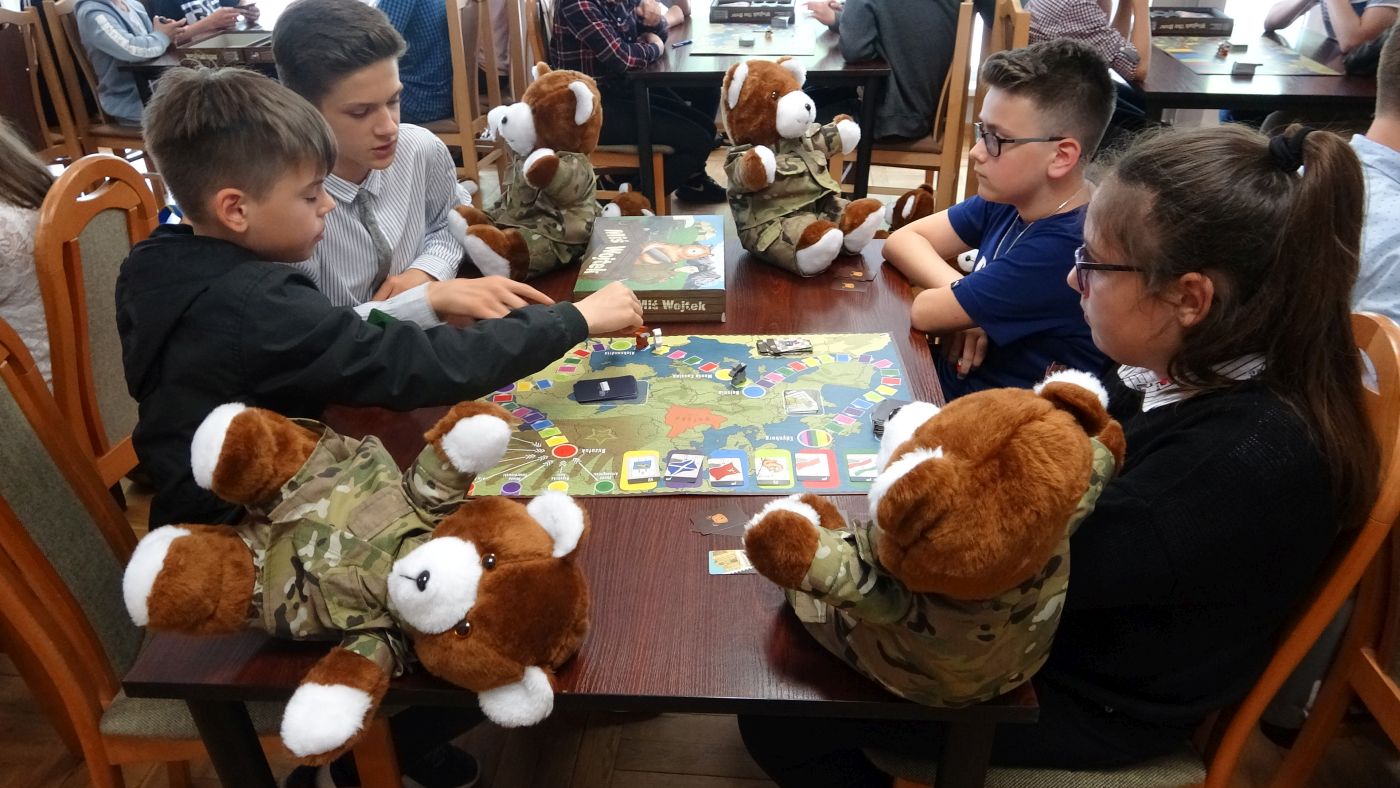 Pierwszy dzień zmagań o złote ordery w Turnieju Misia Wojtka za nami. Emocji było sporo. Szczególnie na widok armii niedźwiadków, która została uzbrojona w czekoladowe bomby. Na szczęście najpierw był obiad. Gości i uczestników powitali pracownicy Biura Edukacji Narodowej, po czym sprawnie rozpoczęły się rozgrywki. Każda drużyna składa się z 4 niedźwiadków, które pracują na wspólny wynik. Walka był zacięta i czasem w ruch szły pluszowe misie.
