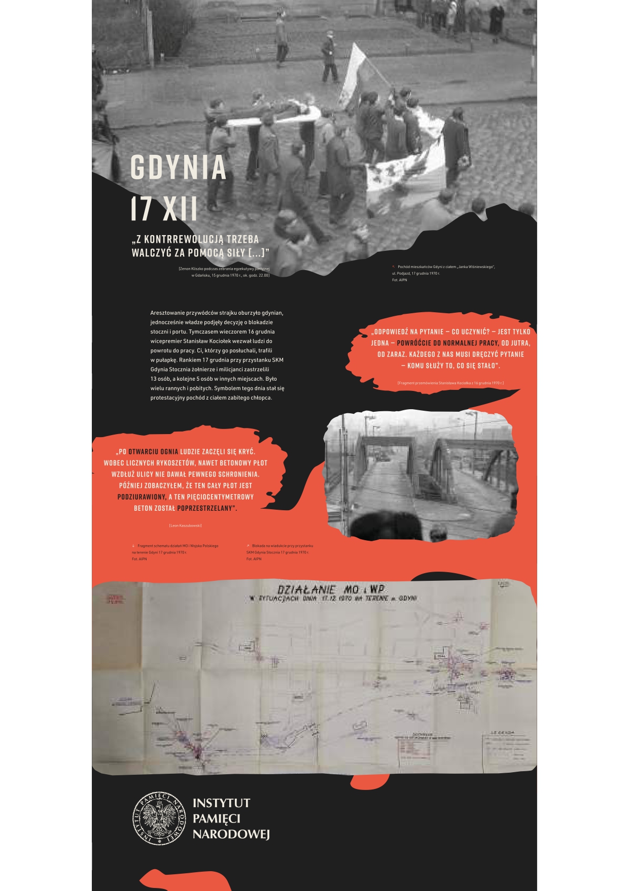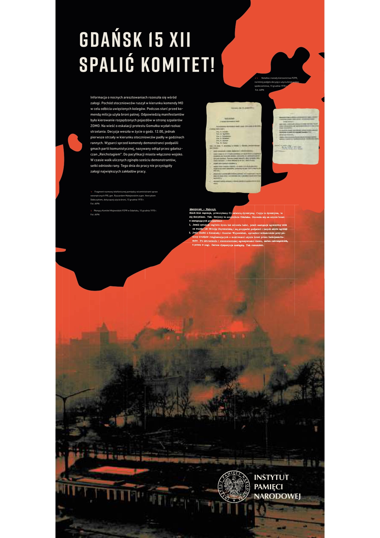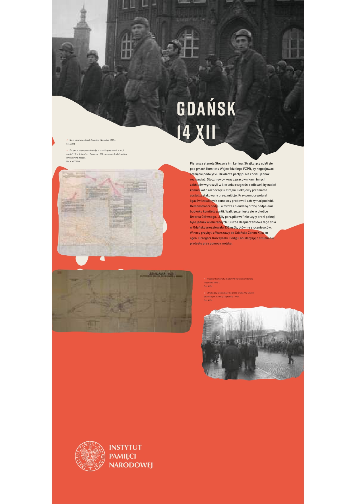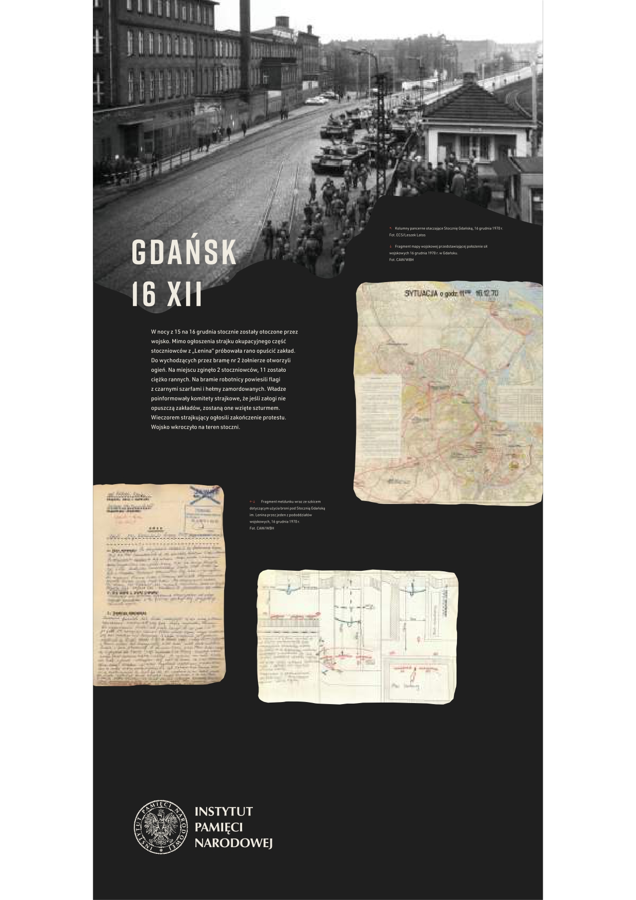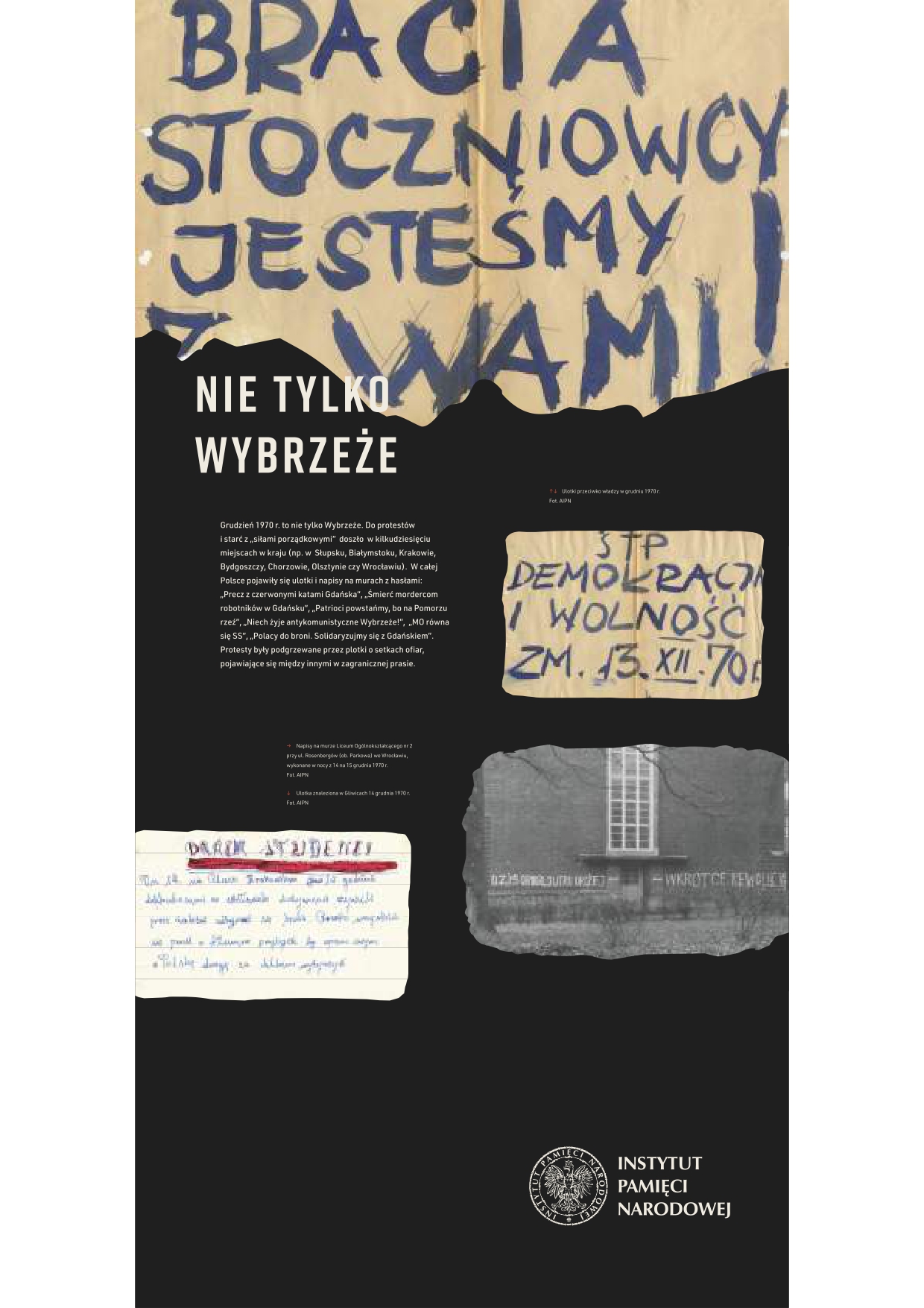 Wystawa prezentuje historię robotniczego protestu w grudniu 1970 roku. Według oficjalnych danych zginęło wówczas 45 osób, a setki zostało rannych. Wydarzenie, które w istotny sposób wpłynęło na historię PRL, przedstawione zostało w ujęciu ogólnokrajowym; ukazuje strajki w Gdańsku, Szczecinie i pozostałych miejscach. Jedna z plansz poświęcona została na reakcje świata wobec protestu, w tym przez pryzmat nie publikowanych dotąd w Polsce artykułów.