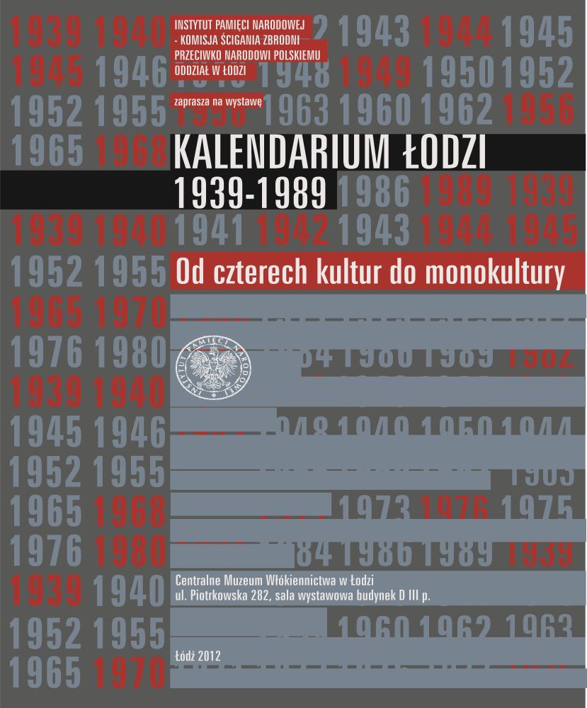 Serdecznie zapraszamy na wystawę przygotowaną przez pracowników Oddziałowego Biura Edukacji Publicznej IPN w Łodzi. Ekspozycja pt. „Kalendarium Łodzi 1939–1989. Od czterech kultur do monokultury” prezentowana jest od połowy listopada do 16 grudnia 2012 r. w Centralnym Muzeum Włókiennictwa w Łodzi (ul. Piotrkowska 282). Uroczyste otwarcie wystawy nastąpiło w dniu 15 listopada o godz. 14.00.
