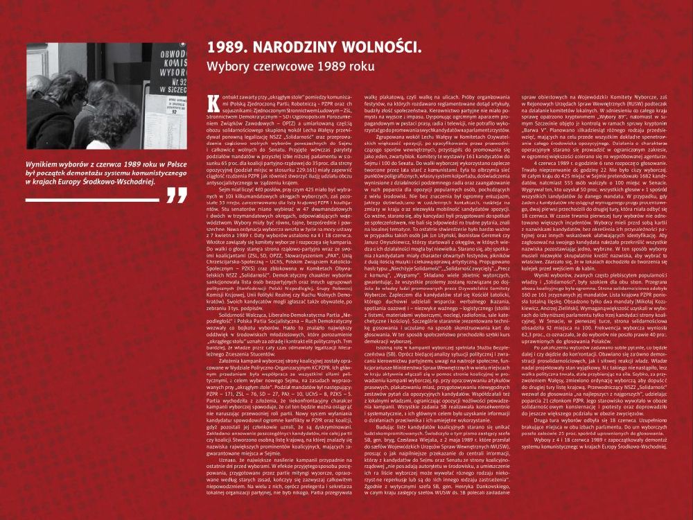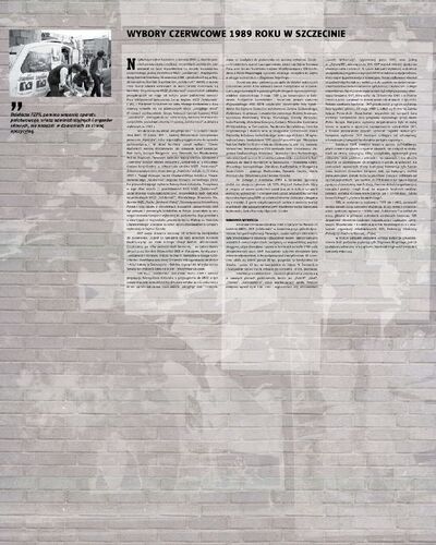 Wystawa plenerowa „1989. Narodziny wolności. Wybory czerwcowe 1989 roku w Szczecinie” jest częścią obchodów rocznicy tego przełomowego wydarzenia w historii Polski. Ekspozycja podzielona jest na dwie części: ogólnopolską i regionalną. Założeniem autorów było pokazanie dwóch form ekspresji: plakatów oraz zdjęć, które najlepiej oddawały nastroje panujące w obu obozach. „Walka na murach” od początku istnienia „Solidarności” była jednym z głównych narzędzi walki politycznej. Władze państwowo-partyjne szybko podjęły rękawicę, lecz skutek okazała się mizerny. Wielkie zwycięstwo obozu solidarnościowego stało się faktem, a demontaż systemu komunistycznego w Polsce nabierał rozmachu.