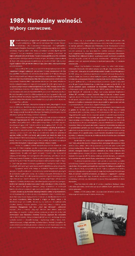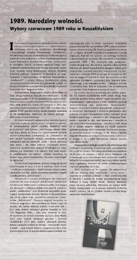 Wystawa „1989. Narodziny wolności. Wybory czerwcowe 1989 roku w Koszalińskiem” jest częścią obchodów rocznicy tego przełomowego wydarzenia w historii Polski. Ekspozycja podzielona jest na dwie części: ogólnopolską i regionalną. Założeniem autorów było pokazanie dwóch form ekspresji: plakatów oraz zdjęć, które najlepiej oddawały nastroje panujące w obu obozach. „Walka na murach” od początku istnienia „Solidarności” była jednym z głównych narzędzi walki politycznej. Władze państwowo-partyjne szybko podjęły rękawicę, lecz skutek okazała się mizerny. Wielkie zwycięstwo obozu solidarnościowego stało się faktem, a demontaż systemu komunistycznego w Polsce nabierał rozmachu.