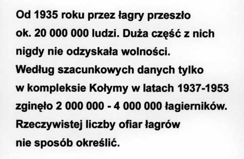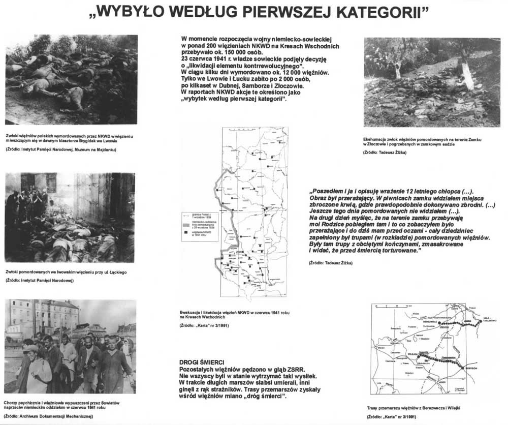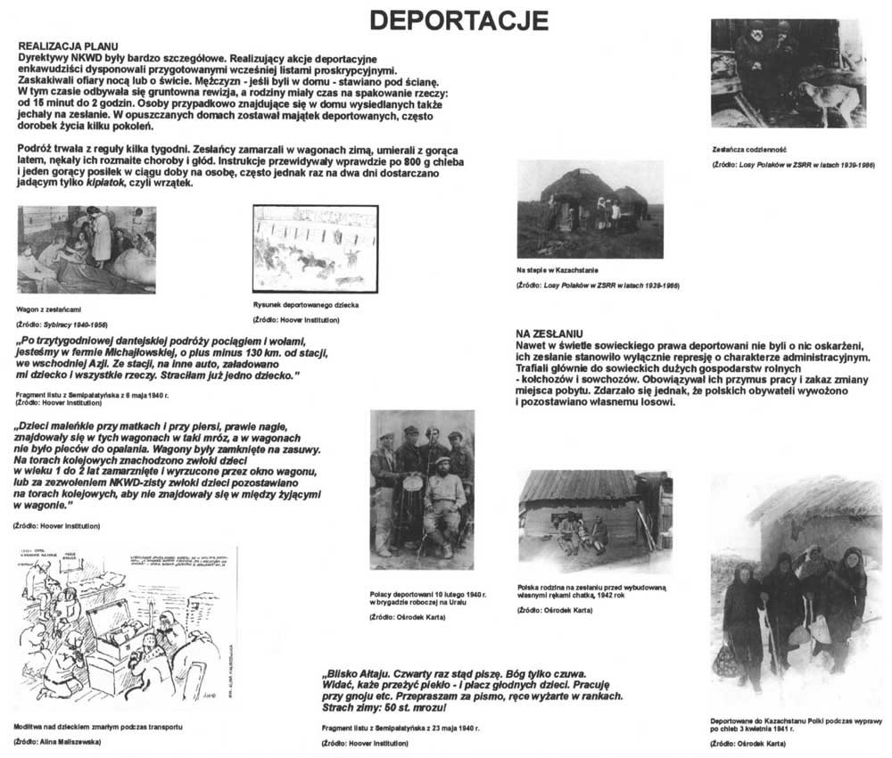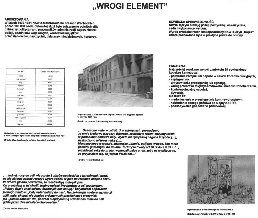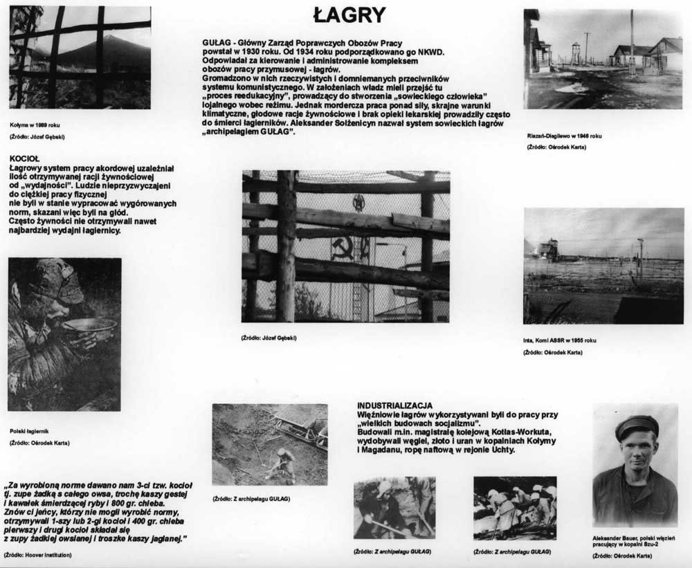 Ekspozycja ma niejako dwie warstwy. Na pierwszą składają się ogólne komentarze historyków, na drugą – wstrząsające relacje osób przeżywających sowieckie piekło. Materiały prezentowane na wystawie pochodzą m.in. z amerykańskiego Instytutu Hoovera. Tam właśnie trafiły ankiety rozprowadzane wśród polskich zesłańców po podpisaniu układu Sikorski-Majski. W ZSRR zaczęła się formować armia Andersa, w chwilę potem odkryto zbrodnię katyńską. Pomiędzy tymi wydarzeniami był krótki czas odwilży, wówczas mogły powstać te unikatowe dokumenty. Na wystawie przeważają materiały poświęcone łagrom. Autorzy nie ograniczyli się jednak do prezentacji wyłącznie tego obszaru sowieckiego piekła. Wystawa ma dwa zasadnicze wątki: katyński, czyli dotyczący losów polskich oficerów wojska i policji, pomordowanych przez Sowietów oraz obozowy, dotyczący setek tysięcy obywateli naszego kraju, deportowanych w latach 1940–41. Od inwazji ZSRR na Polskę, przechodzimy do wywózek i wydarzeń roku 1956, kiedy to do Polski zaczęli wracać zesłańcy. Ekspozycja to historia mordów, wysiedleń, zsyłek, łagrów. Przejmujące są zdjęcia sierot, więźniów, zesłańców. Tablice z reprodukcjami fotografii, plakatów i dokumentów opatrzone są nie tylko podpisami informacyjnymi na temat obozów Archipelagu Gułag i losów Polaków, którzy do nich trafili, ale też cytatami z przepojonych bólem listów do bliskich. Blisko Ałtaju. Czwarty raz stąd piszę. Bóg tylko czuwa. Widać każe przeżyć piekło – i płacz głodnych dzieci. Pracuję przy gnoju etc. Przepraszam za pismo, ręce wyżarte w rankach. Strach zimy – 50 stopni mrozu – to fragment listu, który w 1940 roku wysłał z łagru w Semipałatyńsku jeden z polskich więźniów. Takich świadectw pełna jest wystawa IPN. Dramatyczne zestawienie sowieckich instrukcji i rzeczowych informacji z portretowymi zdjęciami przestraszonych rodzin wzrusza nie tylko zwiedzających wystawę Sybiraków, ale także młodych ludzi.