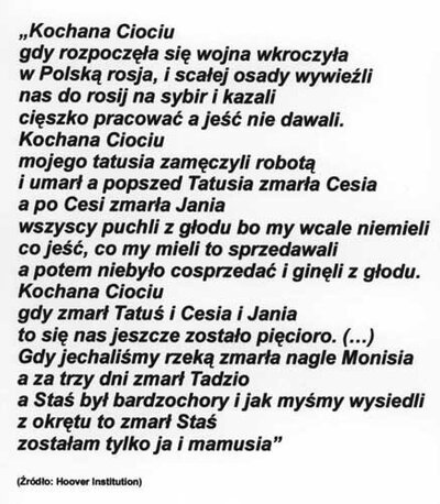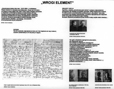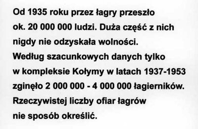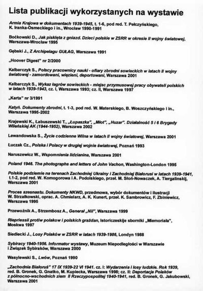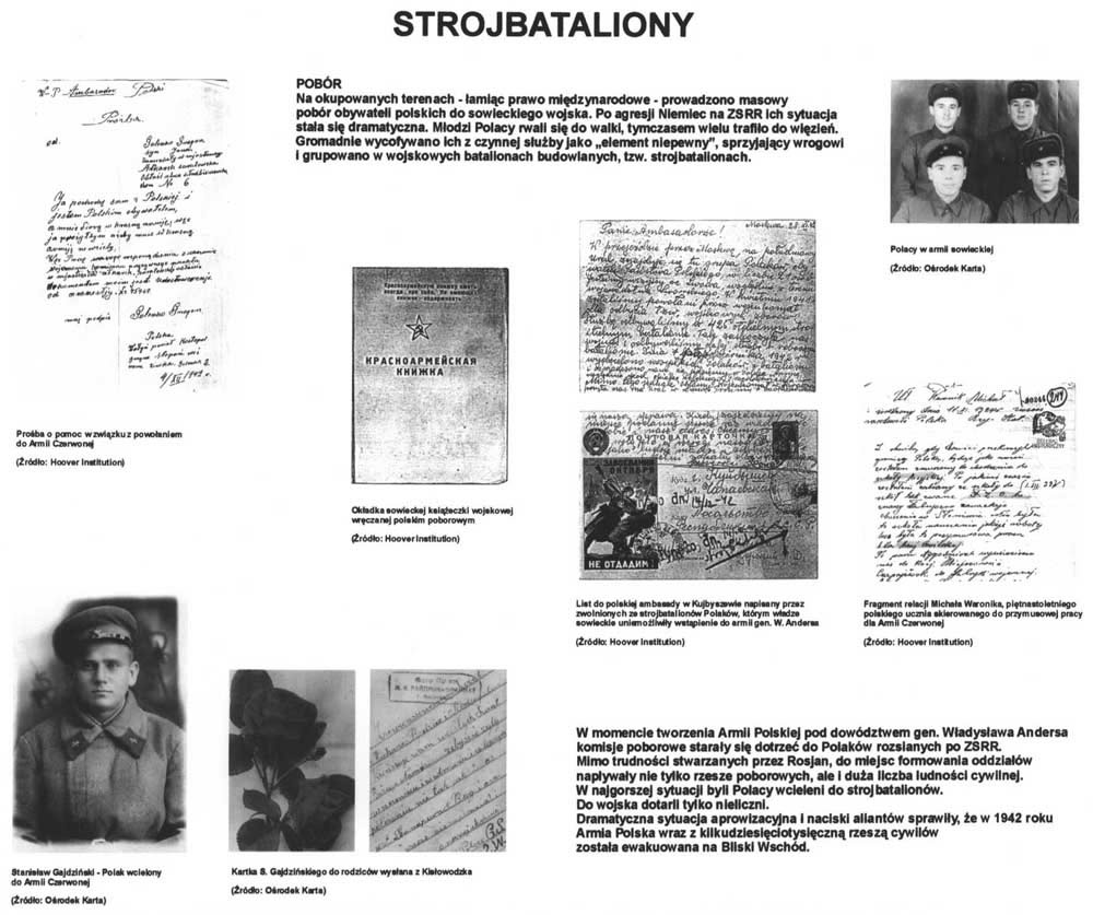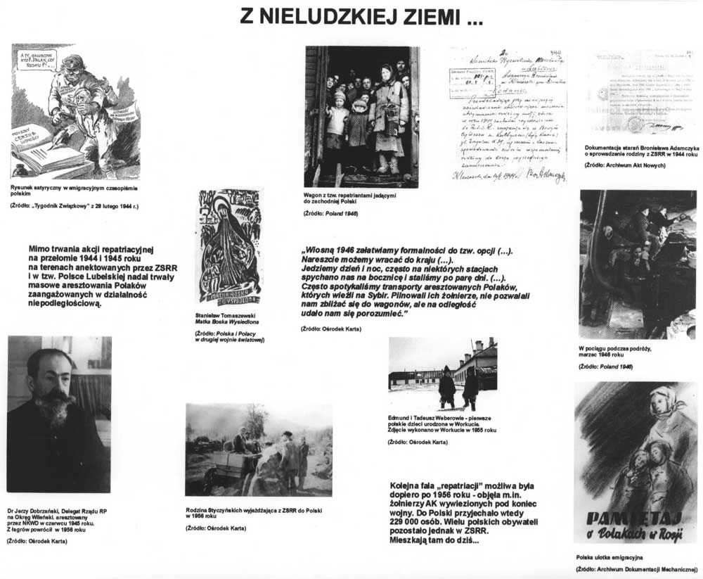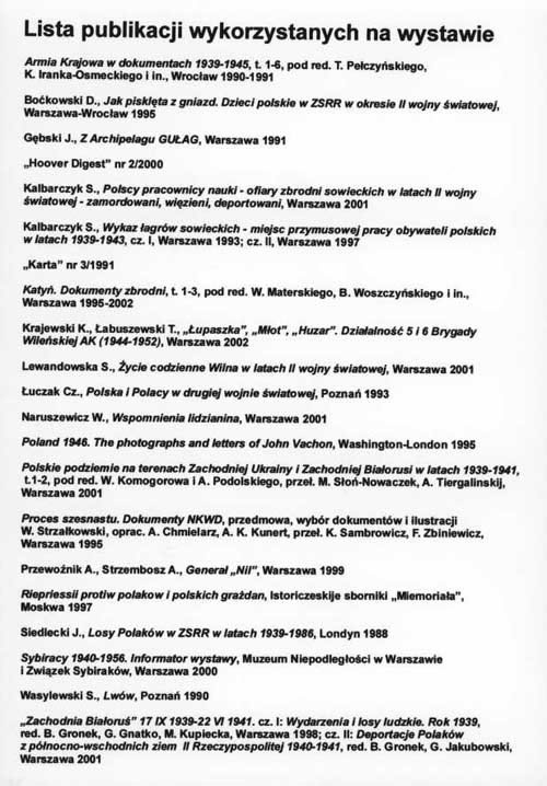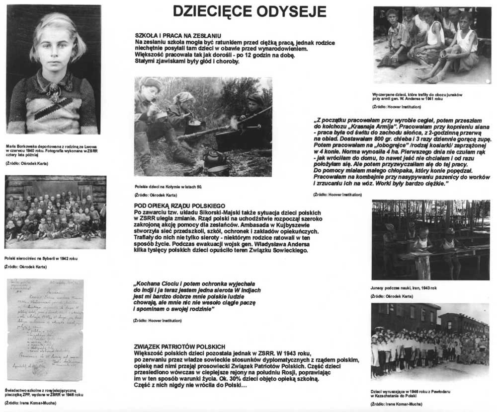 Ekspozycja ma niejako dwie warstwy. Na pierwszą składają się ogólne komentarze historyków, na drugą – wstrząsające relacje osób przeżywających sowieckie piekło. Materiały prezentowane na wystawie pochodzą m.in. z amerykańskiego Instytutu Hoovera. Tam właśnie trafiły ankiety rozprowadzane wśród polskich zesłańców po podpisaniu układu Sikorski-Majski. W ZSRR zaczęła się formować armia Andersa, w chwilę potem odkryto zbrodnię katyńską. Pomiędzy tymi wydarzeniami był krótki czas odwilży, wówczas mogły powstać te unikatowe dokumenty. Na wystawie przeważają materiały poświęcone łagrom. Autorzy nie ograniczyli się jednak do prezentacji wyłącznie tego obszaru sowieckiego piekła. Wystawa ma dwa zasadnicze wątki: katyński, czyli dotyczący losów polskich oficerów wojska i policji, pomordowanych przez Sowietów oraz obozowy, dotyczący setek tysięcy obywateli naszego kraju, deportowanych w latach 1940–41. Od inwazji ZSRR na Polskę, przechodzimy do wywózek i wydarzeń roku 1956, kiedy to do Polski zaczęli wracać zesłańcy. Ekspozycja to historia mordów, wysiedleń, zsyłek, łagrów. Przejmujące są zdjęcia sierot, więźniów, zesłańców. Tablice z reprodukcjami fotografii, plakatów i dokumentów opatrzone są nie tylko podpisami informacyjnymi na temat obozów Archipelagu Gułag i losów Polaków, którzy do nich trafili, ale też cytatami z przepojonych bólem listów do bliskich. Blisko Ałtaju. Czwarty raz stąd piszę. Bóg tylko czuwa. Widać każe przeżyć piekło – i płacz głodnych dzieci. Pracuję przy gnoju etc. Przepraszam za pismo, ręce wyżarte w rankach. Strach zimy – 50 stopni mrozu – to fragment listu, który w 1940 roku wysłał z łagru w Semipałatyńsku jeden z polskich więźniów. Takich świadectw pełna jest wystawa IPN. Dramatyczne zestawienie sowieckich instrukcji i rzeczowych informacji z portretowymi zdjęciami przestraszonych rodzin wzrusza nie tylko zwiedzających wystawę Sybiraków, ale także młodych ludzi.