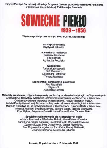 Wystawa „Sowieckie piekło 1939–1956” stanowi zwieńczenie dwuletniego projektu edukacyjnego Oddziałowego Biura Edukacji Publicznej IPN w Poznaniu, poświęconego tematyce sybirackiej. Dotyczy jednej z wielu „białych plam” naszych najnowszych dziejów – tragedii Polaków, którzy znaleźli się pod okupacją sowiecką w 1939 r. Przedstawia losy setek tysięcy obywateli więzionych, deportowanych i zamordowanych przez machinę systemu komunistycznego.
