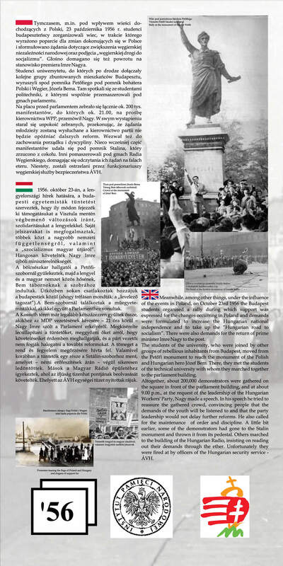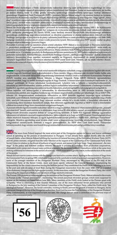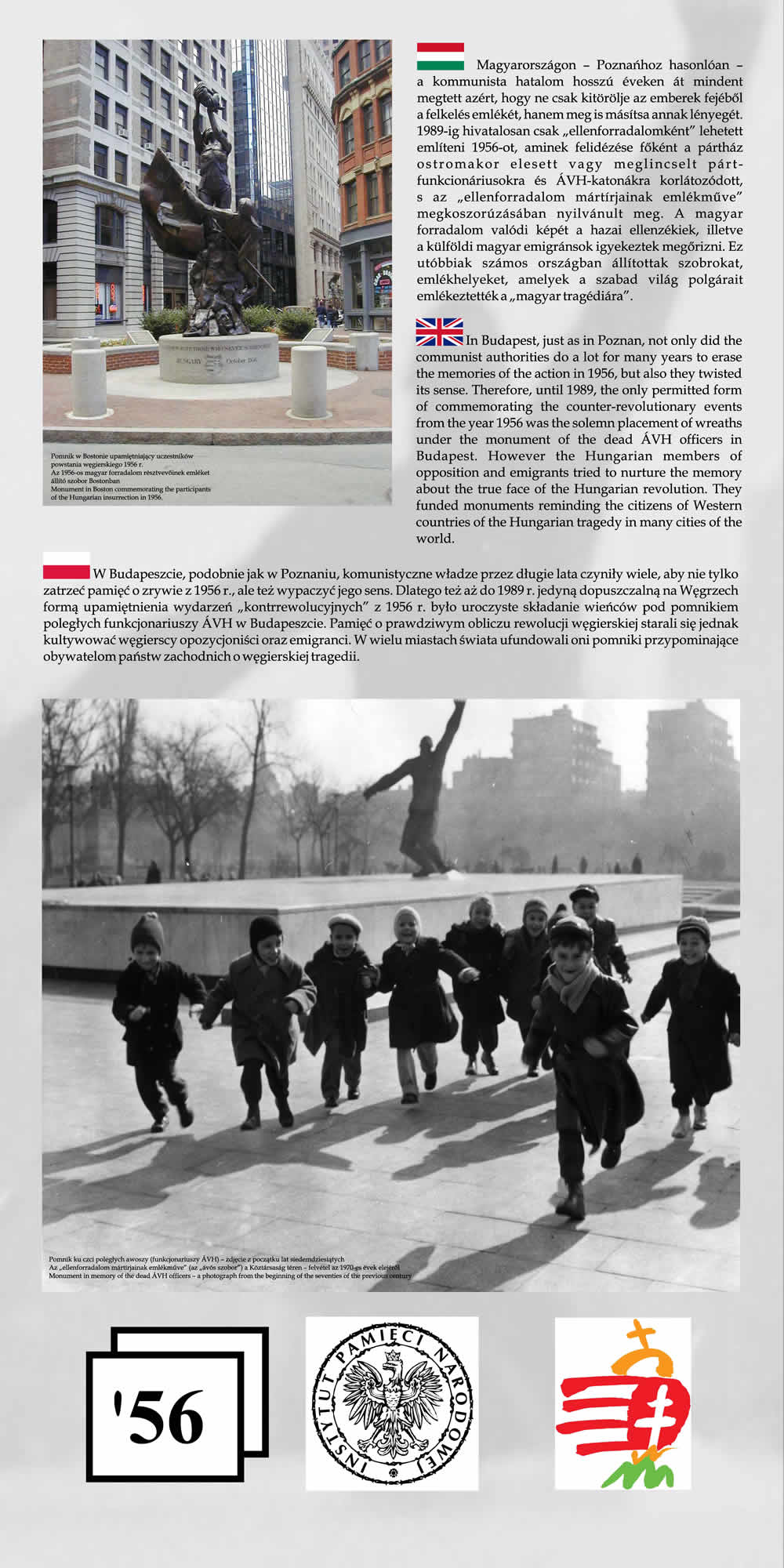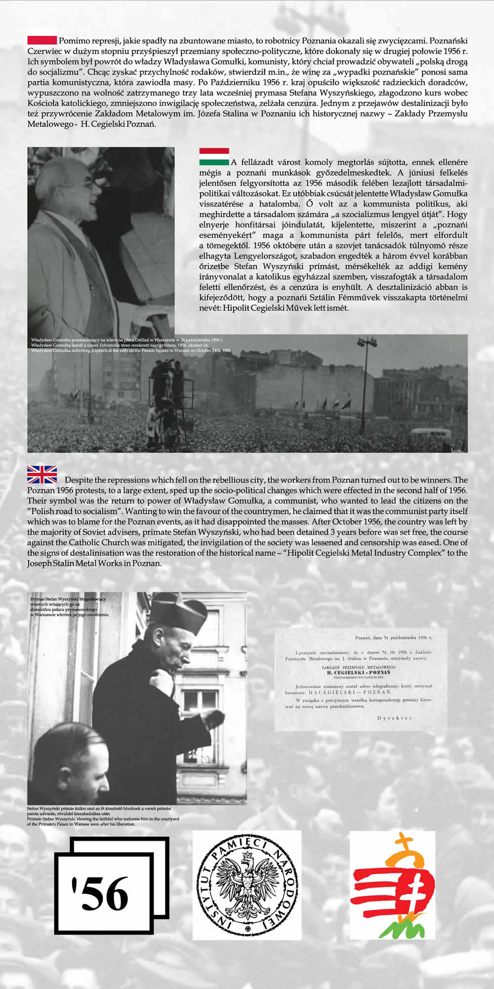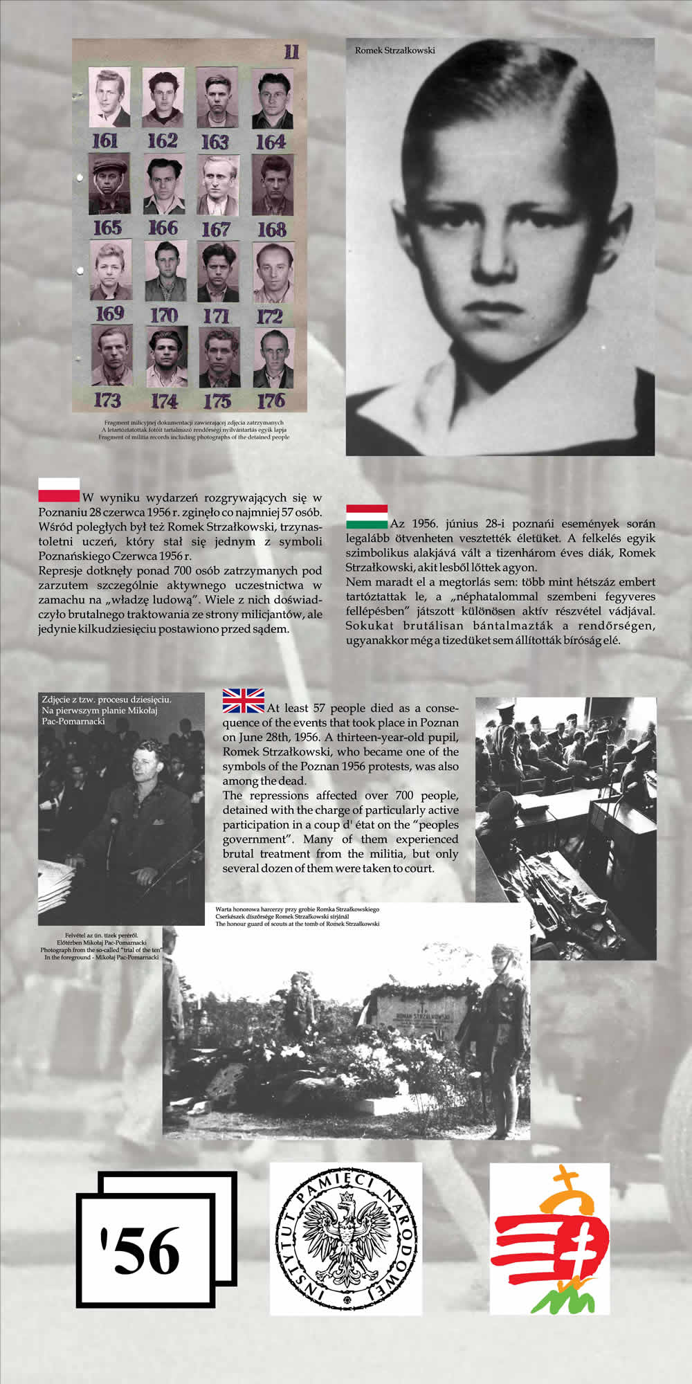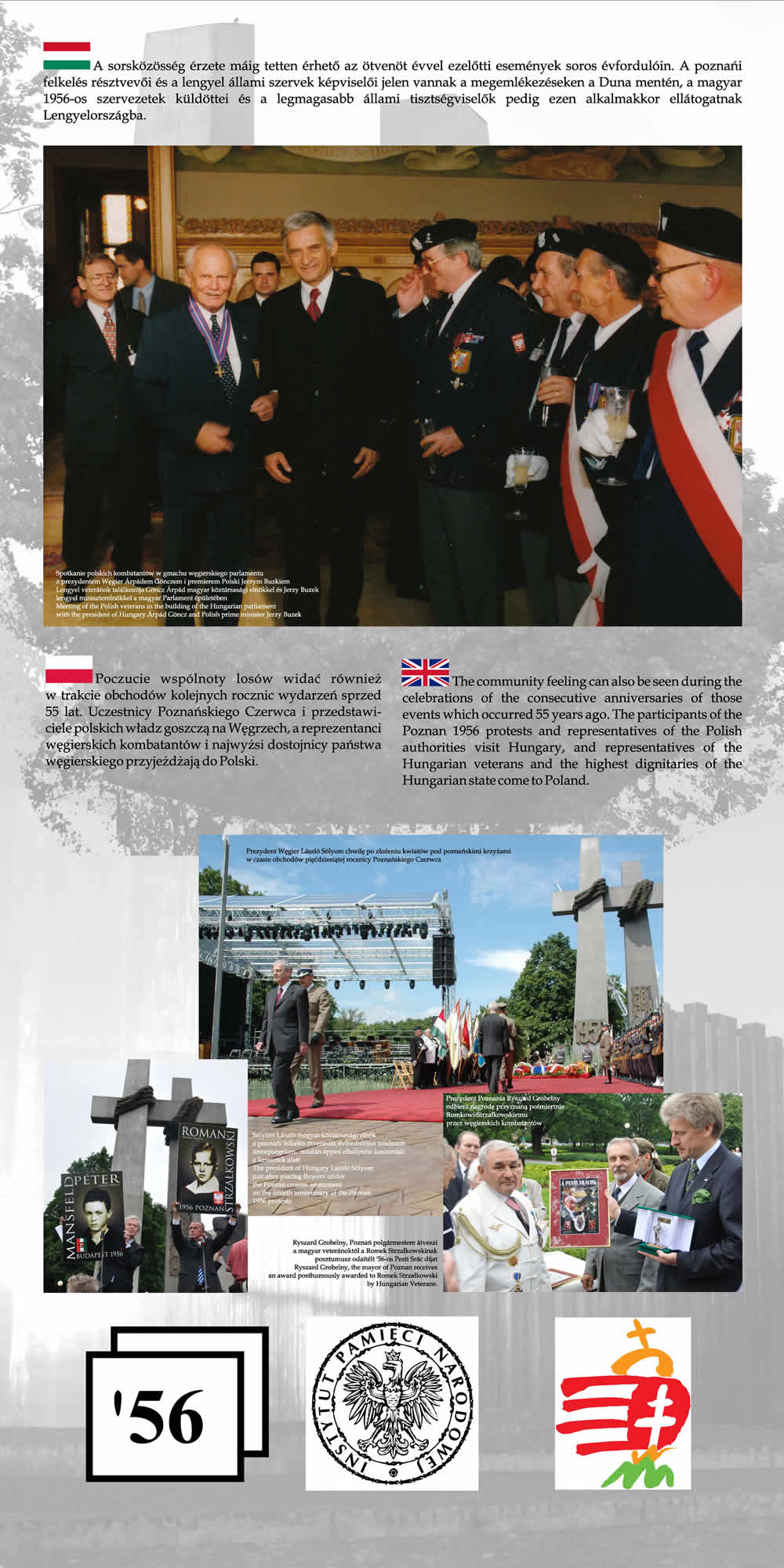Wystawa przypomina wspólne losy Polaków i Węgrów w okresie komunizmu na przykładzie wydarzeń z 1956 r. Przedstawione na wystawie fotografie wraz z obszernym komentarzem historycznym nie tylko przypominają wydarzenia Poznańskiego Czerwca i Rewolucji Węgierskiej z 1956 r., ale starają się także pokazać, na ile pamięć o wydarzeniach sprzed prawie 55 lat jest obecna w przestrzeni obu miast poprzez pomniki, pamiątkowe płyty, groby poległych.