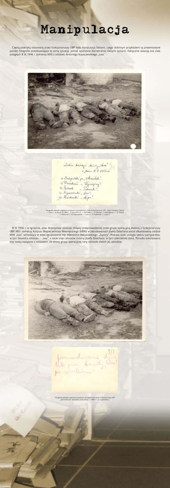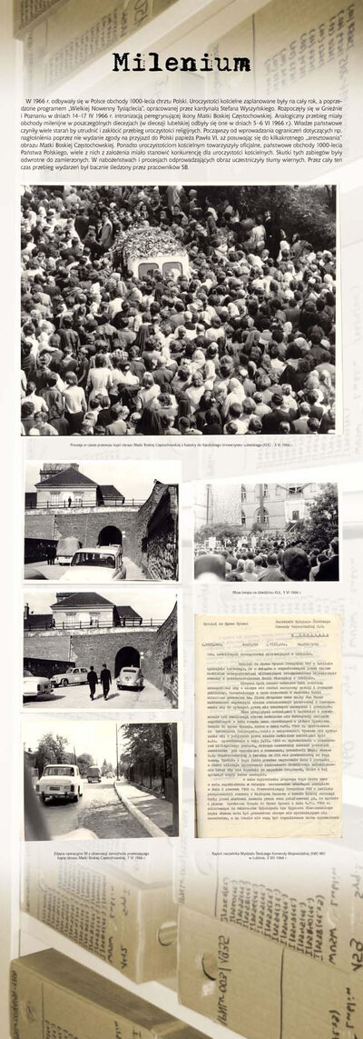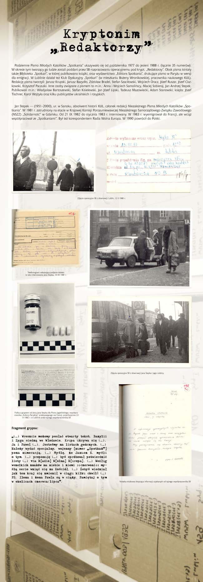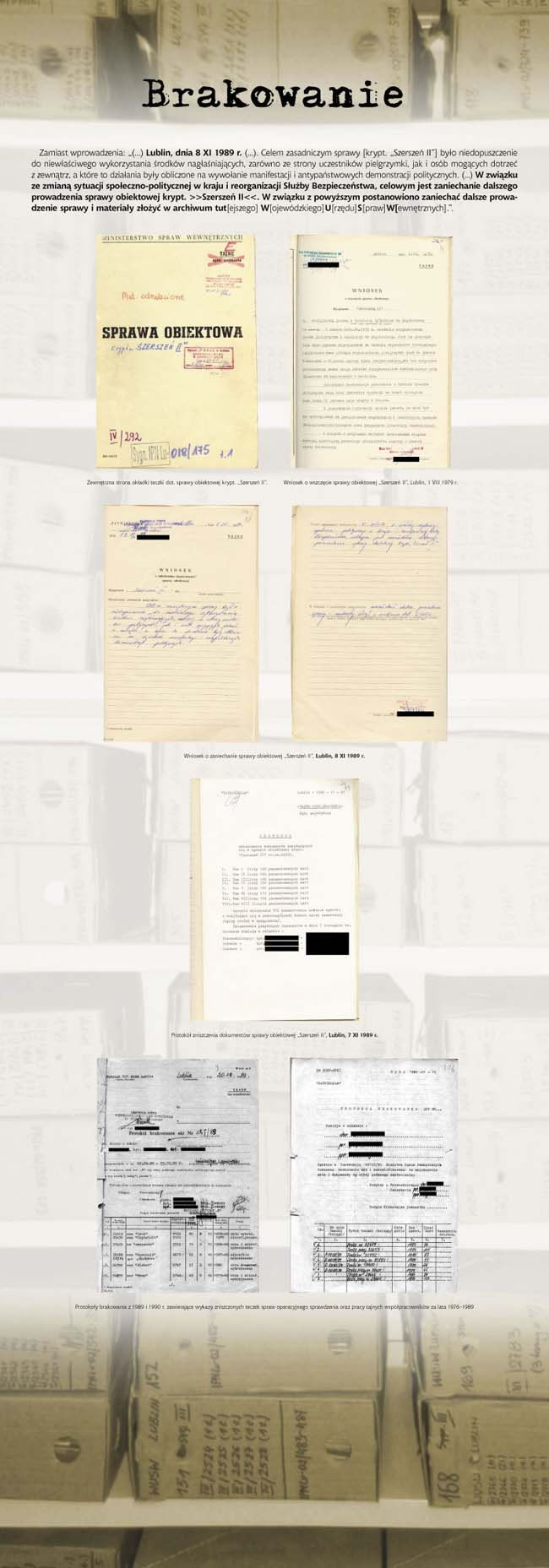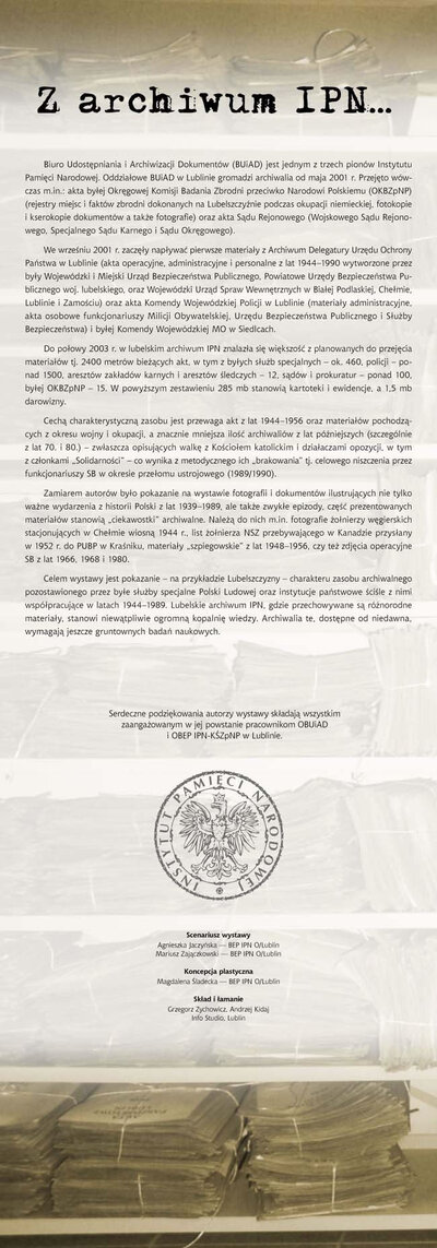 W świadomości społeczeństwa postrzegane są one przede wszystkim przez pryzmat tzw. teczek. Autorzy wystawy starali się pokazać – w miarę możliwości – rzeczywisty charakter zasobu archiwalnego IPN.