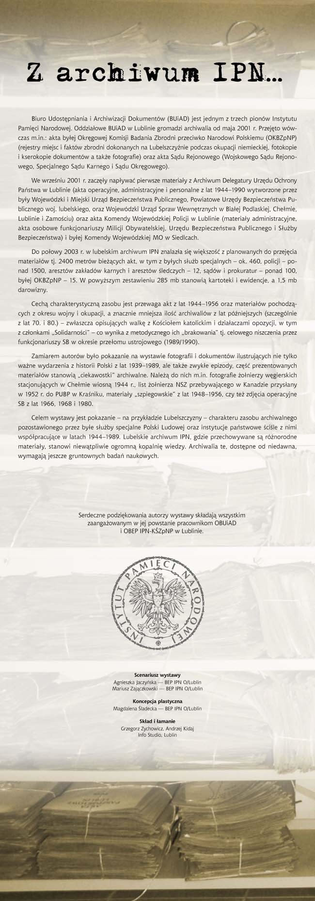 Celem wystawy jest pokazanie – na przykładzie Lubelszczyzny – charakteru zasobu archiwalnego pozostawionego przez byłe służby specjalne Polski Ludowej oraz instytucje państwowe ściśle z nimi współpracujące w latach 1944–1989. Lubelskie archiwum IPN, gdzie przechowywane są różnorodne materiały, stanowi niewątpliwie ogromną kopalnię wiedzy. Archiwalia te, dostępne od niedawna, wymagają jeszcze gruntownych badań naukowych.