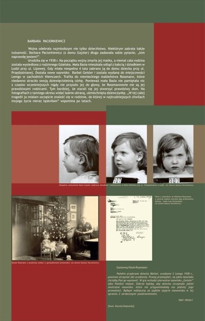 Za pomocą archiwalnych fotografii i dokumentów wyeksponowano niemiecką okupację w Łodzi, akcje wysiedleńcze na Zamojszczyźnie oraz indywidualne losy dzieci polskich, które padły ofiarą wynarodowienia.