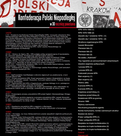 Wystawa przygotowana została przez Oddziałowe Biuro Edukacji Publicznej w Krakowie, w 30. rocznicę powstania Konfederacji Polski Niepodległej, pierwszej niezależnej partii politycznej w bloku sowieckim. Za pomocą zdjęć, dokumentów i ulotek przedstawiono wieloletnie zmagania działaczy KPN o niepodległą Polskę. Zdjęcia z manifestacji, z procesów politycznych czy dokumentacja inwigilacji działaczy Konfederacji oraz inne materiały ukazują wysiłek i ofiary znaczącego środowiska polskiej opozycji politycznej, które odegrało ważną rolę w historii najnowszej Polski.