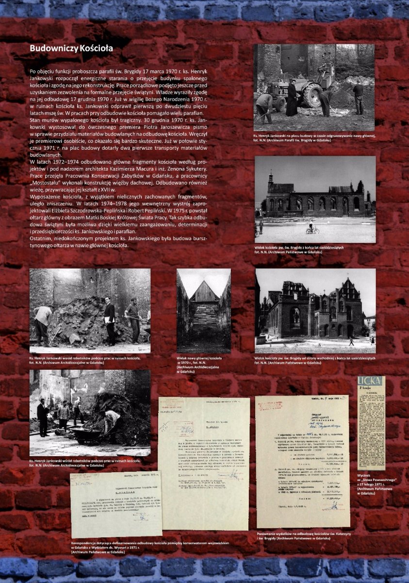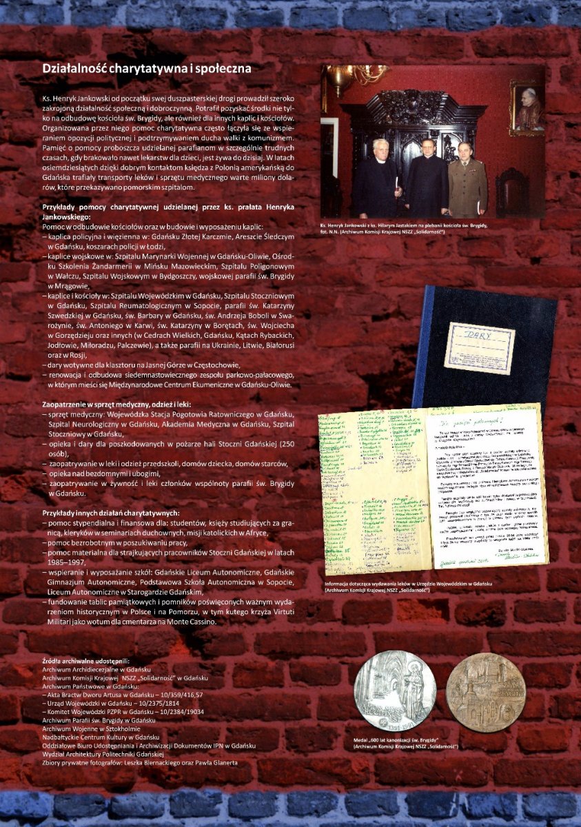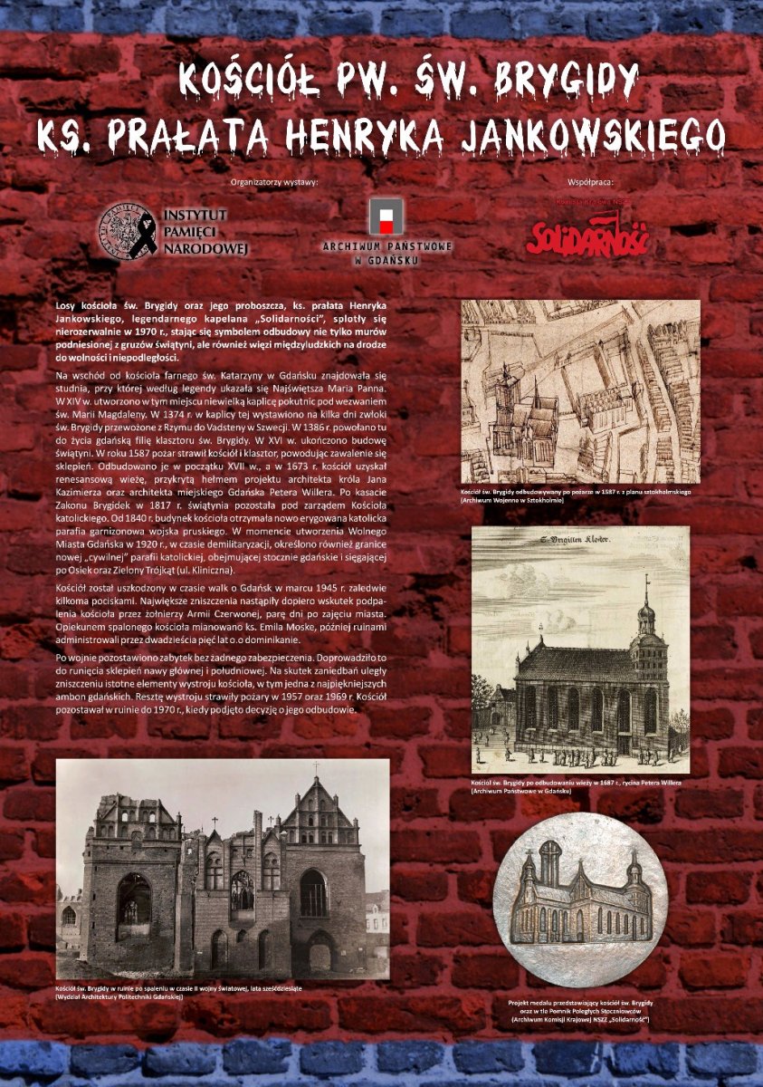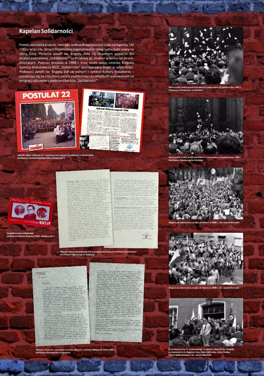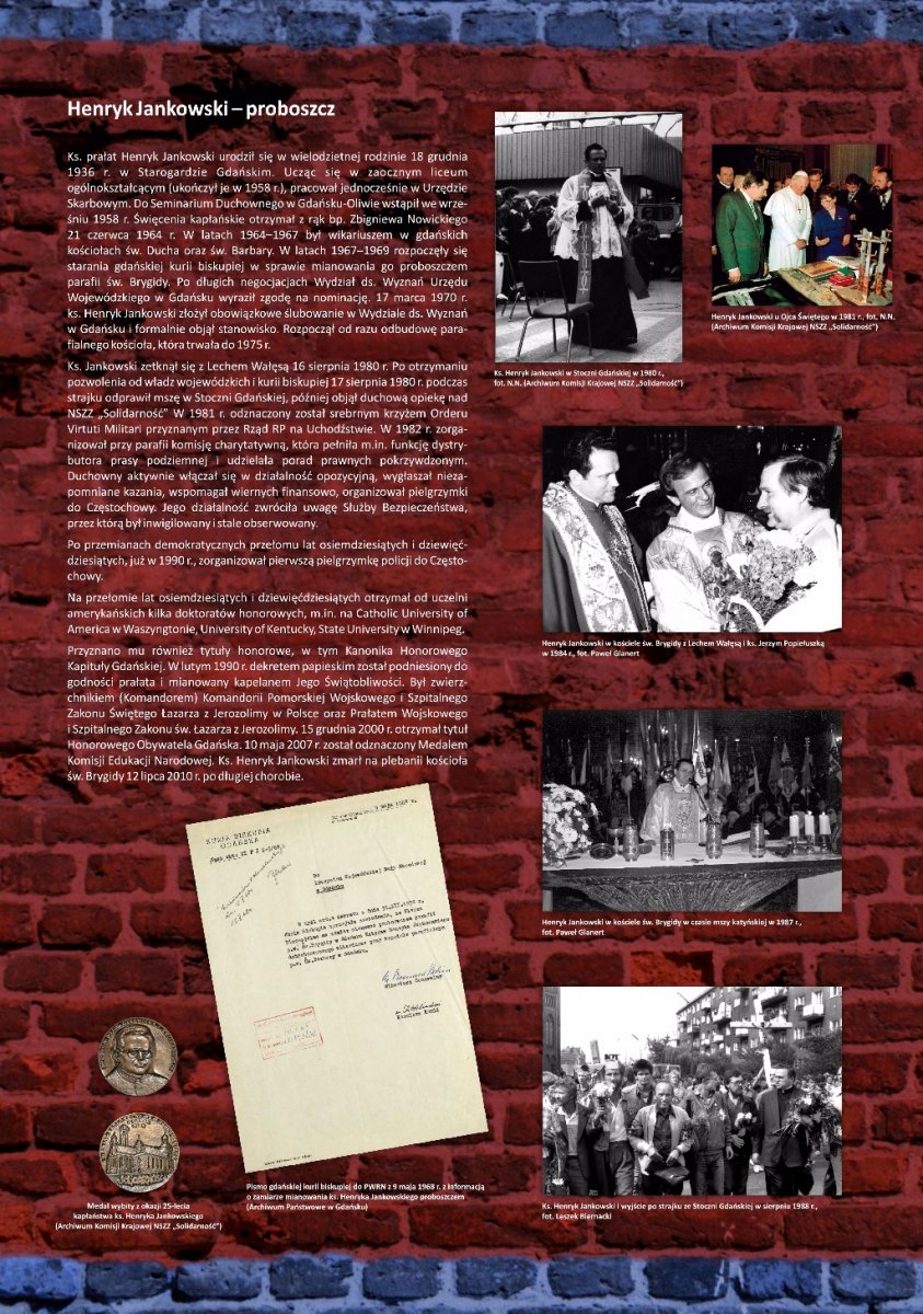 Wystawa została przygotowana w trzydziestą rocznicę powstania NSZZ „Solidarność”. Ukazuje ona dzieje kościoła, życiorys ks. prałata Henryka Jankowskiego, jego udział w wydarzeniach Sierpnia ’80 oraz rolę świątyni zarówno w tym okresie, jak i w czasie stanu wojennego. Część plansz poświęcono spotkaniom i rozmowom czołowych postaci ze świata polityki krajowej i zagranicznej, które odbywały się na plebanii kościoła pod koniec lat osiemdziesiątych XX w. Prezentowane zdjęcia pochodzą z zasobów Archiwum Komisji Krajowej „Solidarność”, zbiorów archiwalnych IPN oraz Archiwum Państwowego w Gdańsku, jak również kolekcji prywatnych.