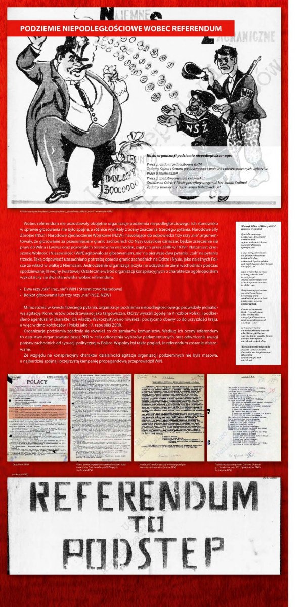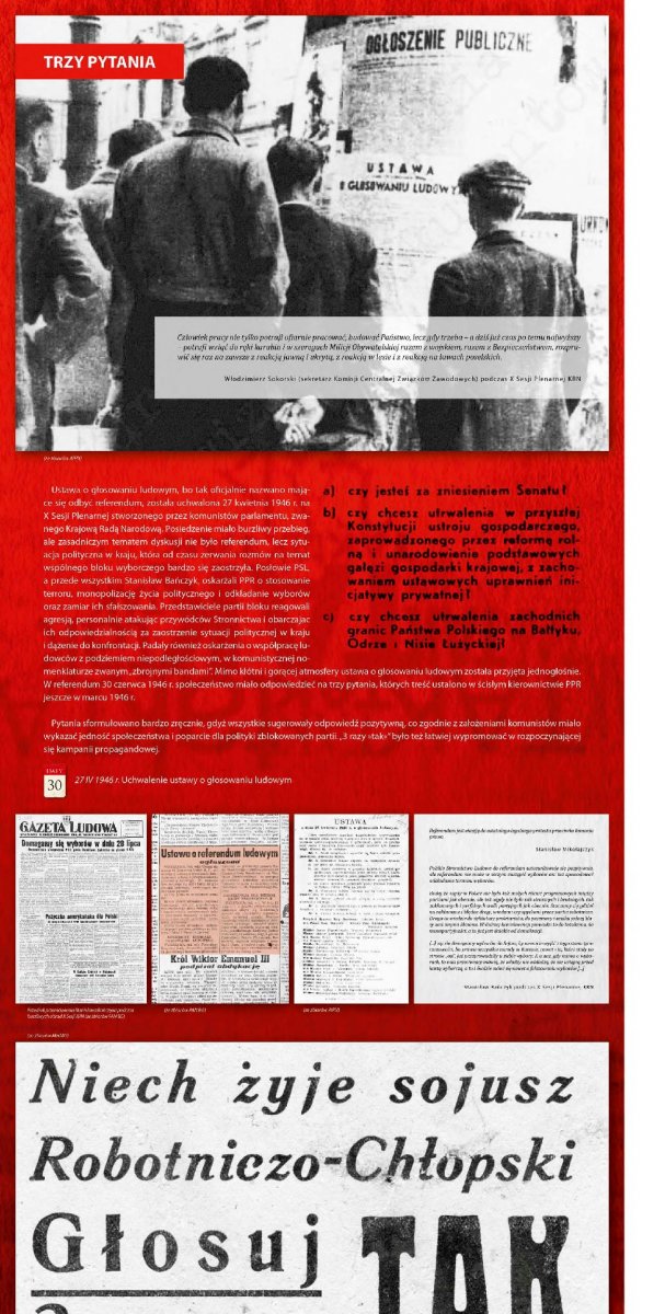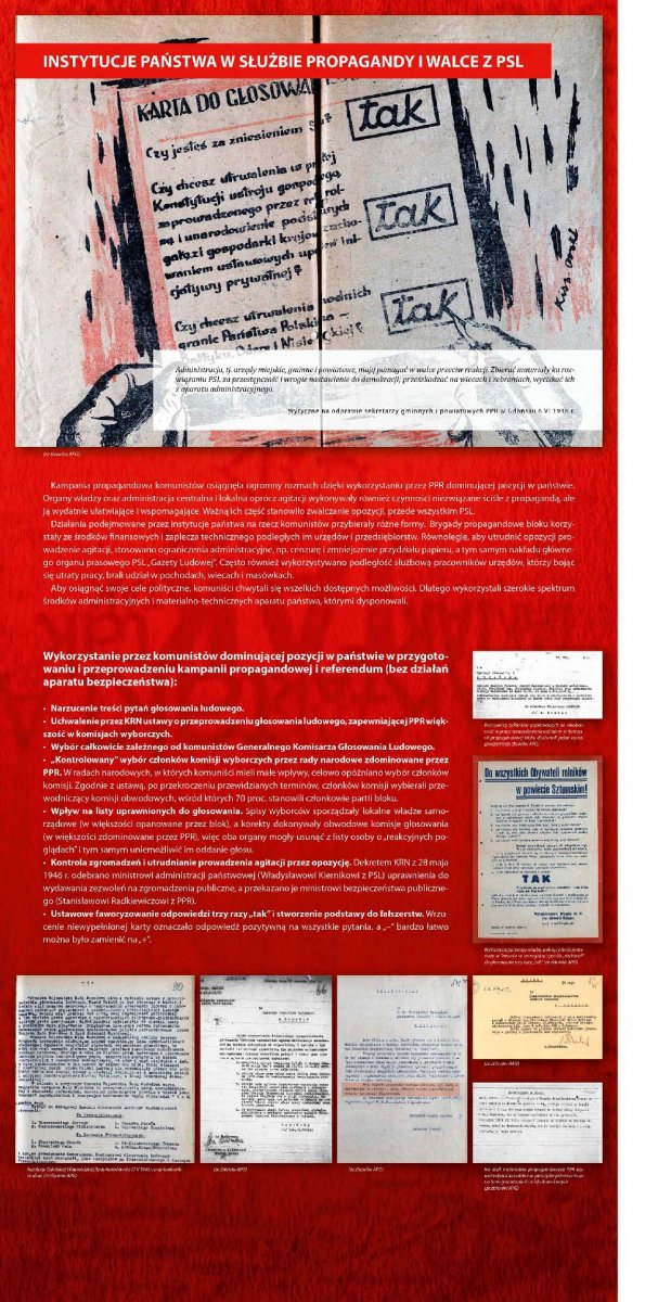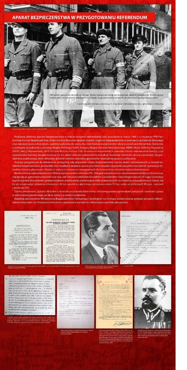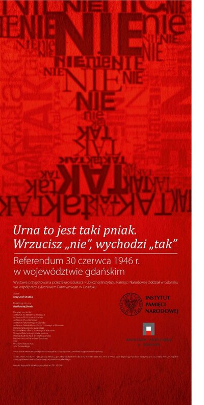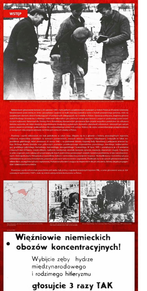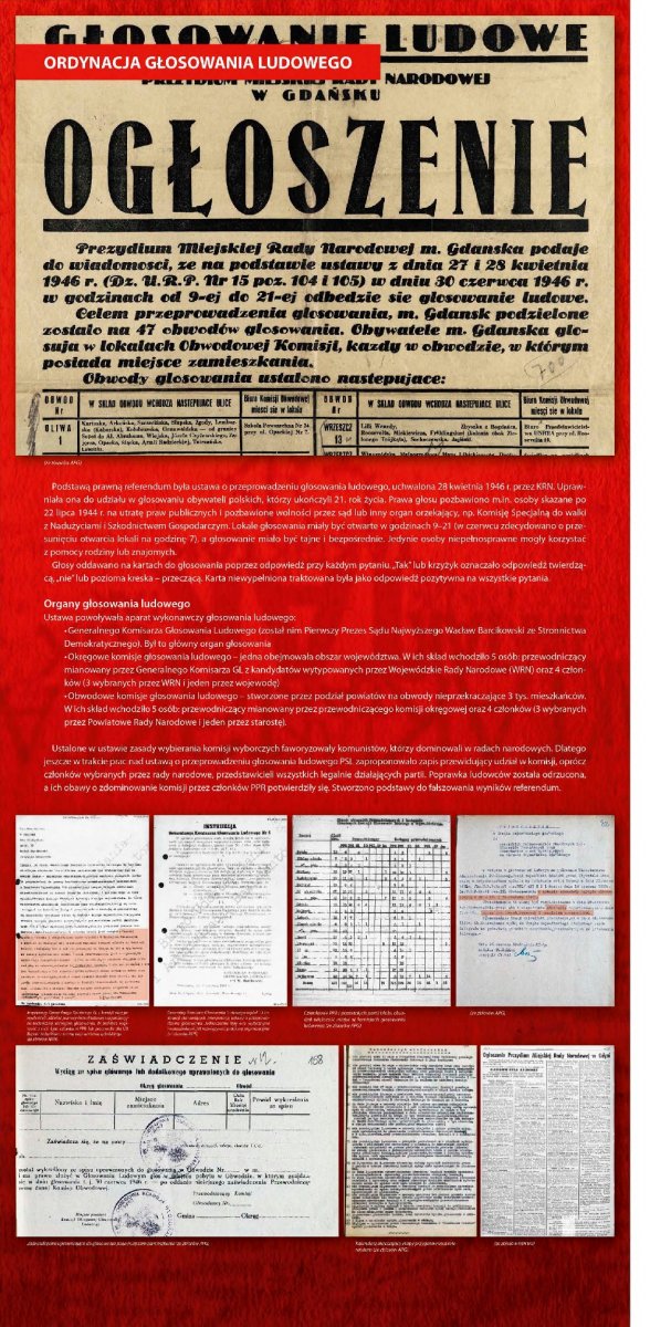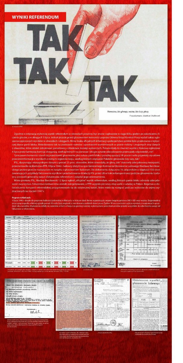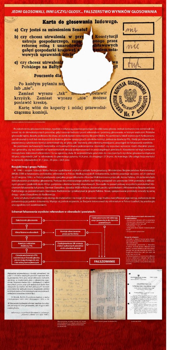 Wystawa została przygotowana 65 lat po referendum z 30 czerwca 1946 roku, które stało się mitem założycielskim komunizmu w Polsce. Ekspozycja odsłania kulisy i mechanizm fałszerstw wyborczych komunistów oraz wpływ propagandy na postawy wyborców. Przybliża również nastroje społeczeństwa oraz atmosferę życia w Polsce pierwszych lat powojennych na przykładzie ówczesnego województwa gdańskiego. Na wystawie zobaczyć można m.in. plakaty i hasła propagandowe z okresu tzw. kampanii przedreferendalnej, a także dowody fałszerstw dokonanych przez komunistów. Materiały do wystawy pochodzą z kilkunastu placówek naukowych i zbiorów prywatnych. Autorem wystawy jest Krzysztof Drażba, pracownik pionu edukacji Oddziału IPN w Gdańsku.