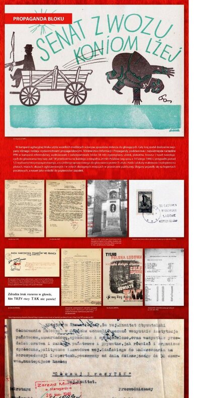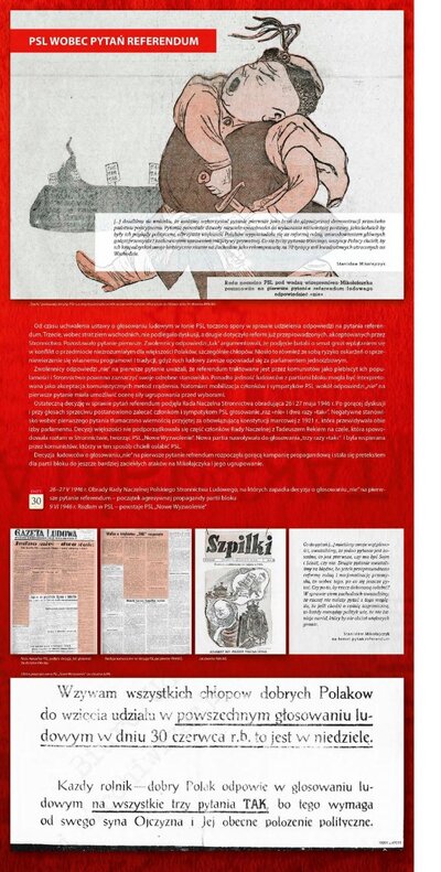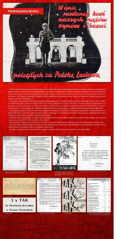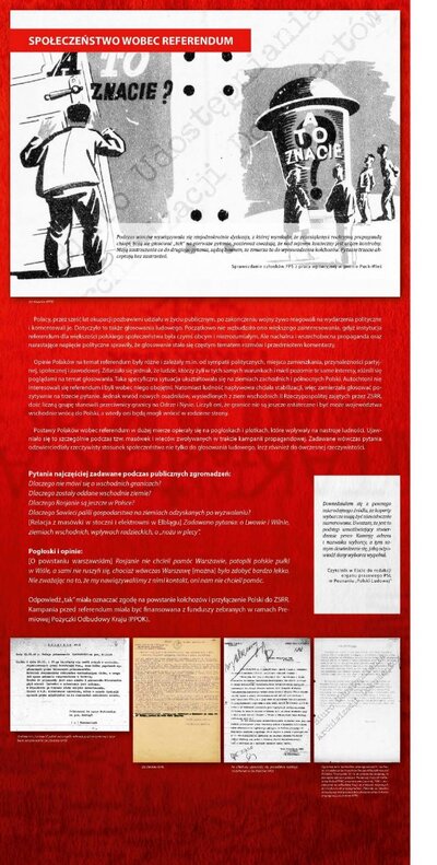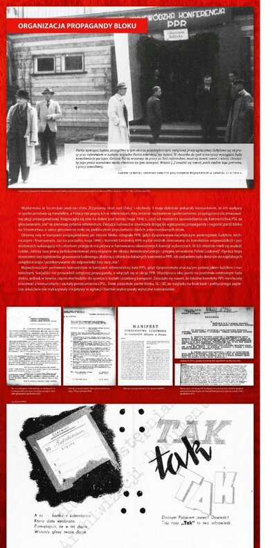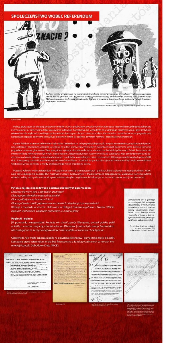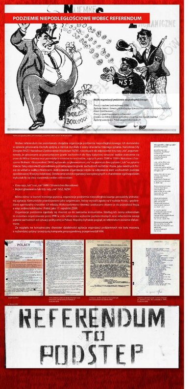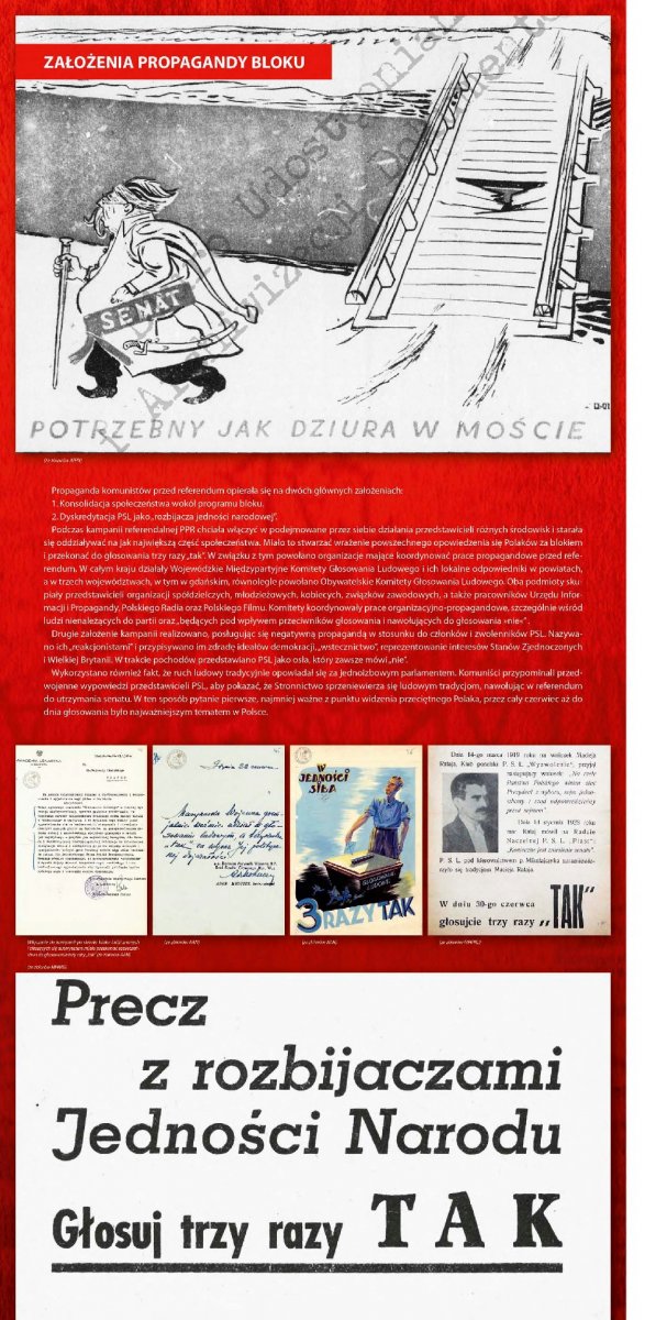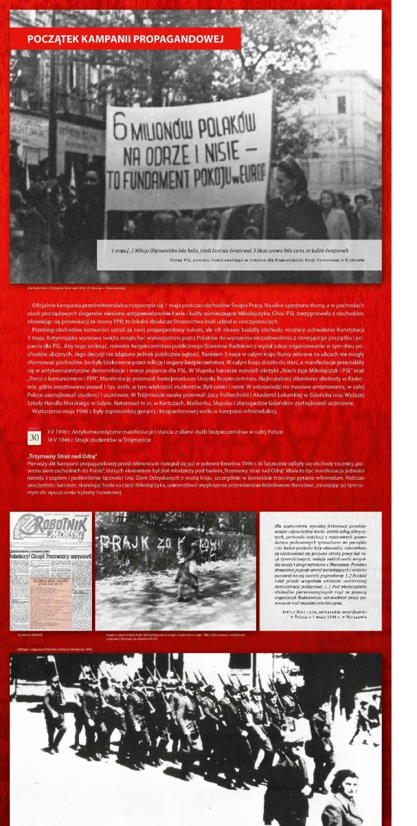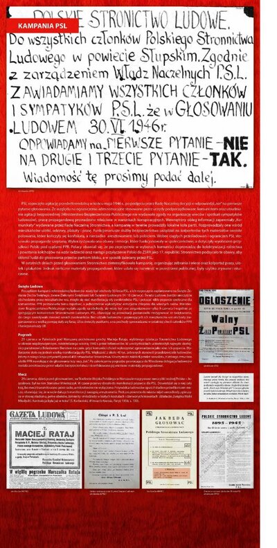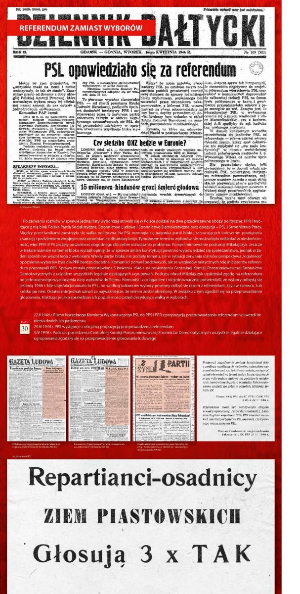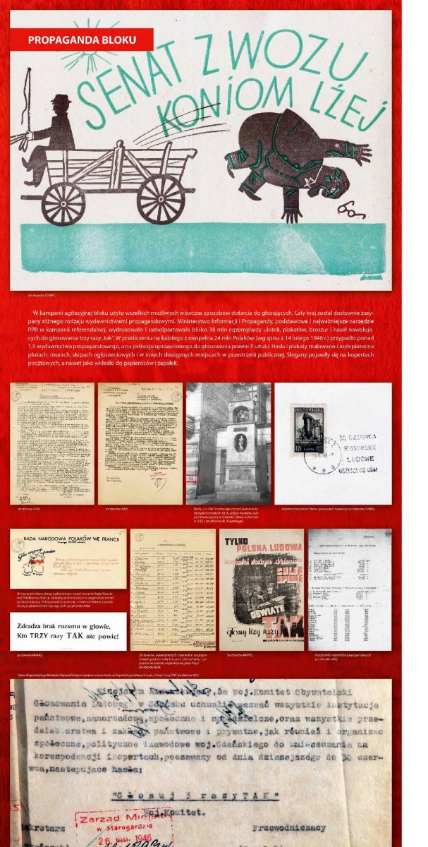 Wystawa została przygotowana 65 lat po referendum z 30 czerwca 1946 roku, które stało się mitem założycielskim komunizmu w Polsce. Ekspozycja odsłania kulisy i mechanizm fałszerstw wyborczych komunistów oraz wpływ propagandy na postawy wyborców. Przybliża również nastroje społeczeństwa oraz atmosferę życia w Polsce pierwszych lat powojennych na przykładzie ówczesnego województwa gdańskiego. Na wystawie zobaczyć można m.in. plakaty i hasła propagandowe z okresu tzw. kampanii przedreferendalnej, a także dowody fałszerstw dokonanych przez komunistów. Materiały do wystawy pochodzą z kilkunastu placówek naukowych i zbiorów prywatnych. Autorem wystawy jest Krzysztof Drażba, pracownik pionu edukacji Oddziału IPN w Gdańsku.