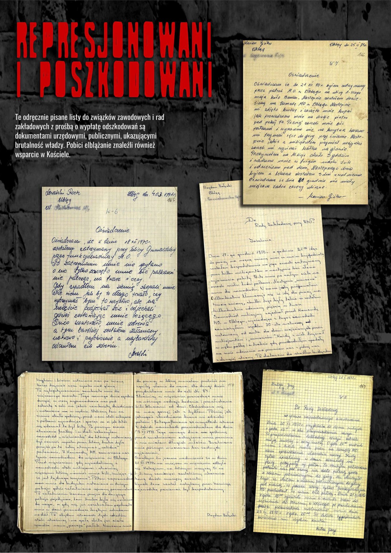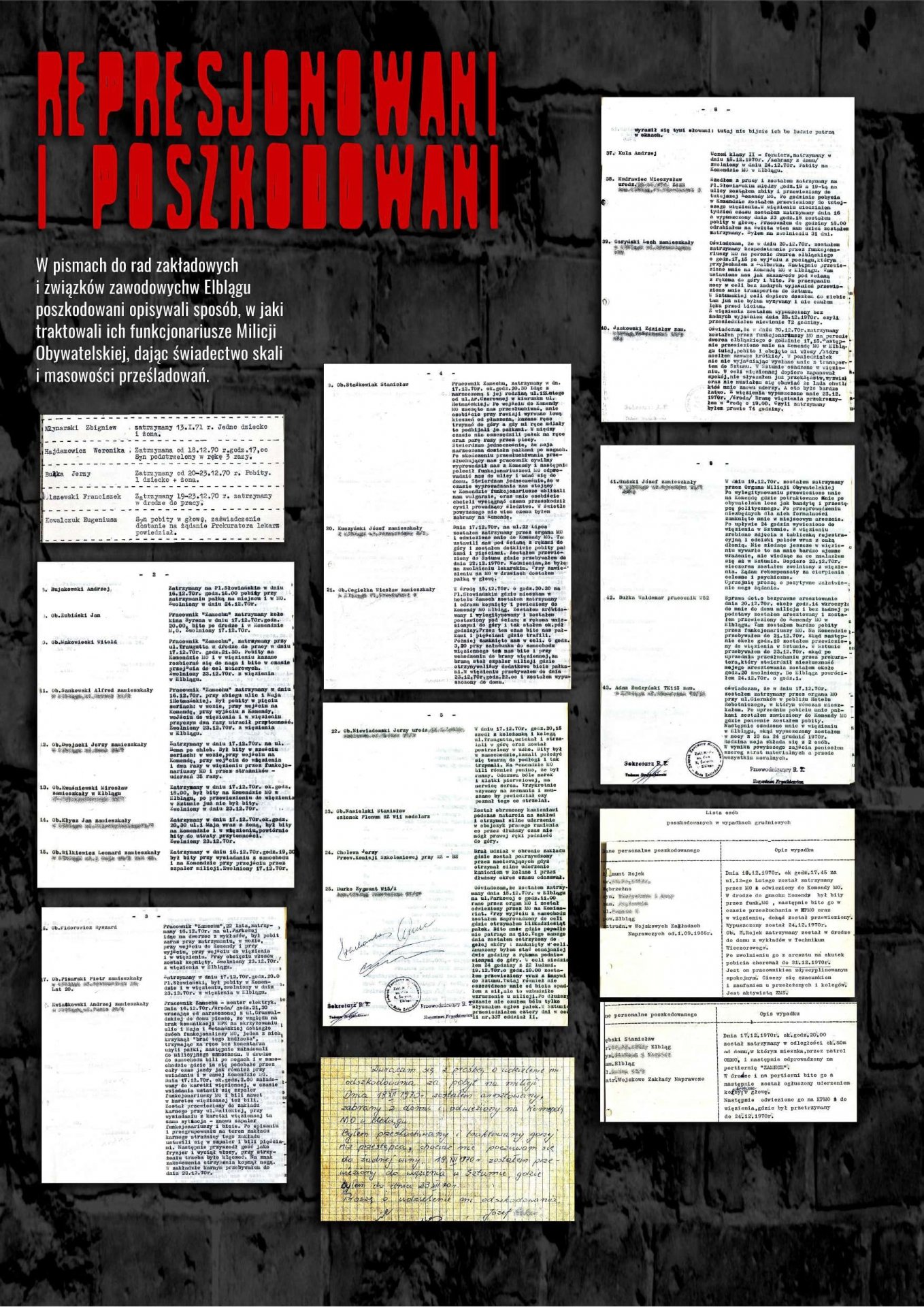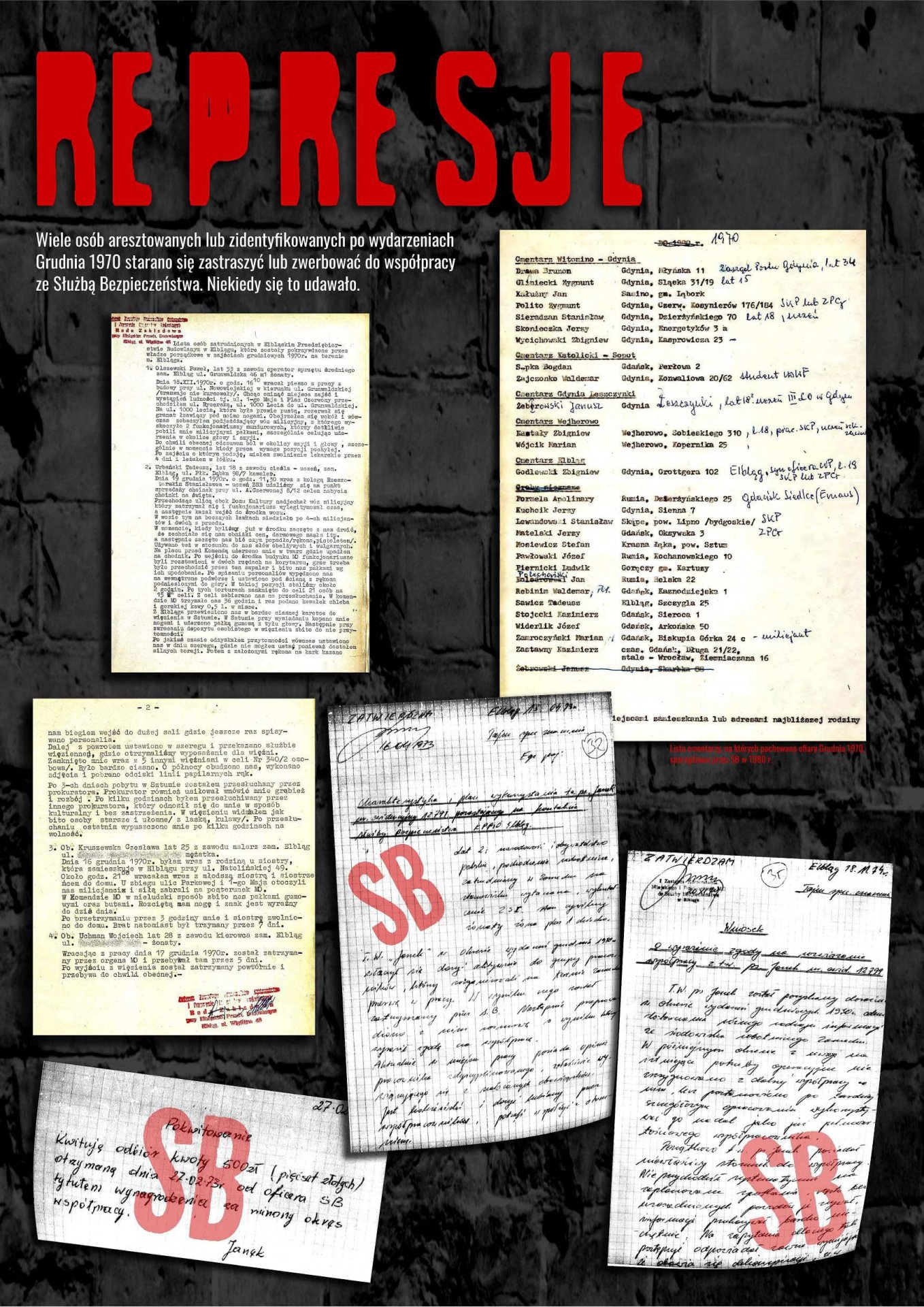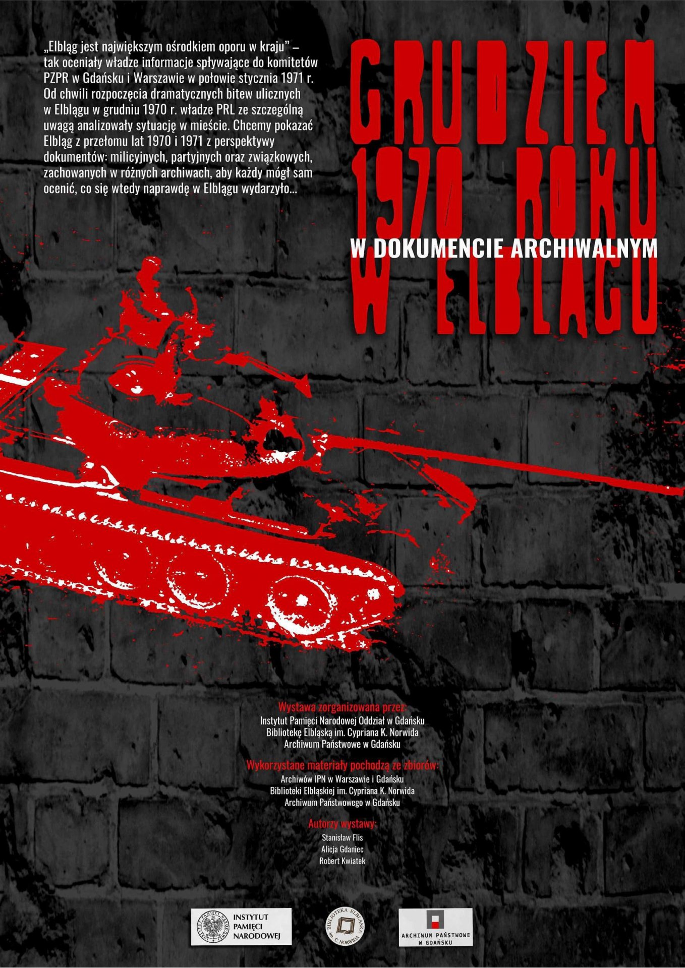 Publikowane na wystawie dokumenty pochodzą ze zbiorów IPN, AP w Gdańsku i Biblioteki Elbląskiej. Jej autorami są Stanisław Flis, Alicja Gdaniec i Robert Kwiatek.