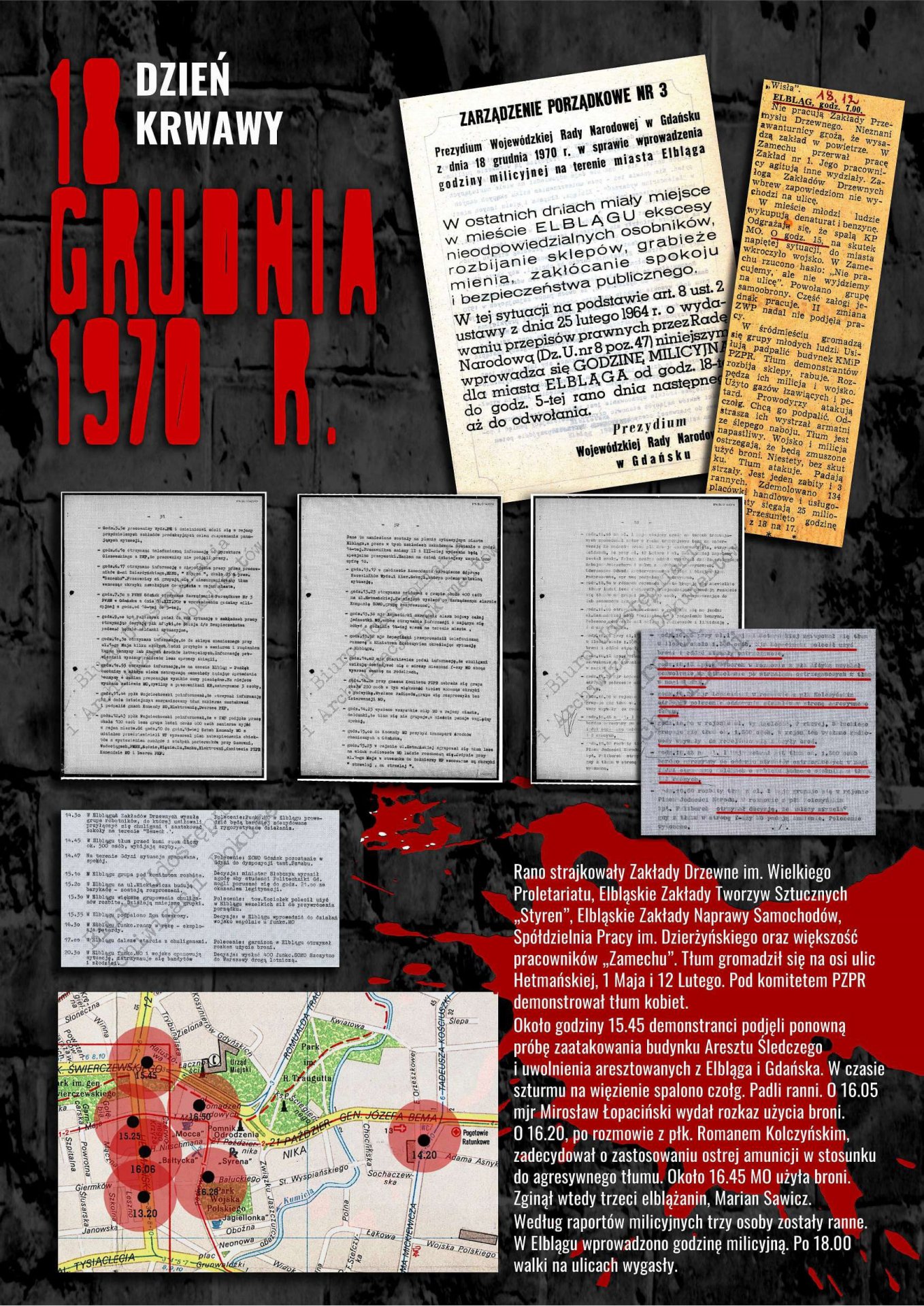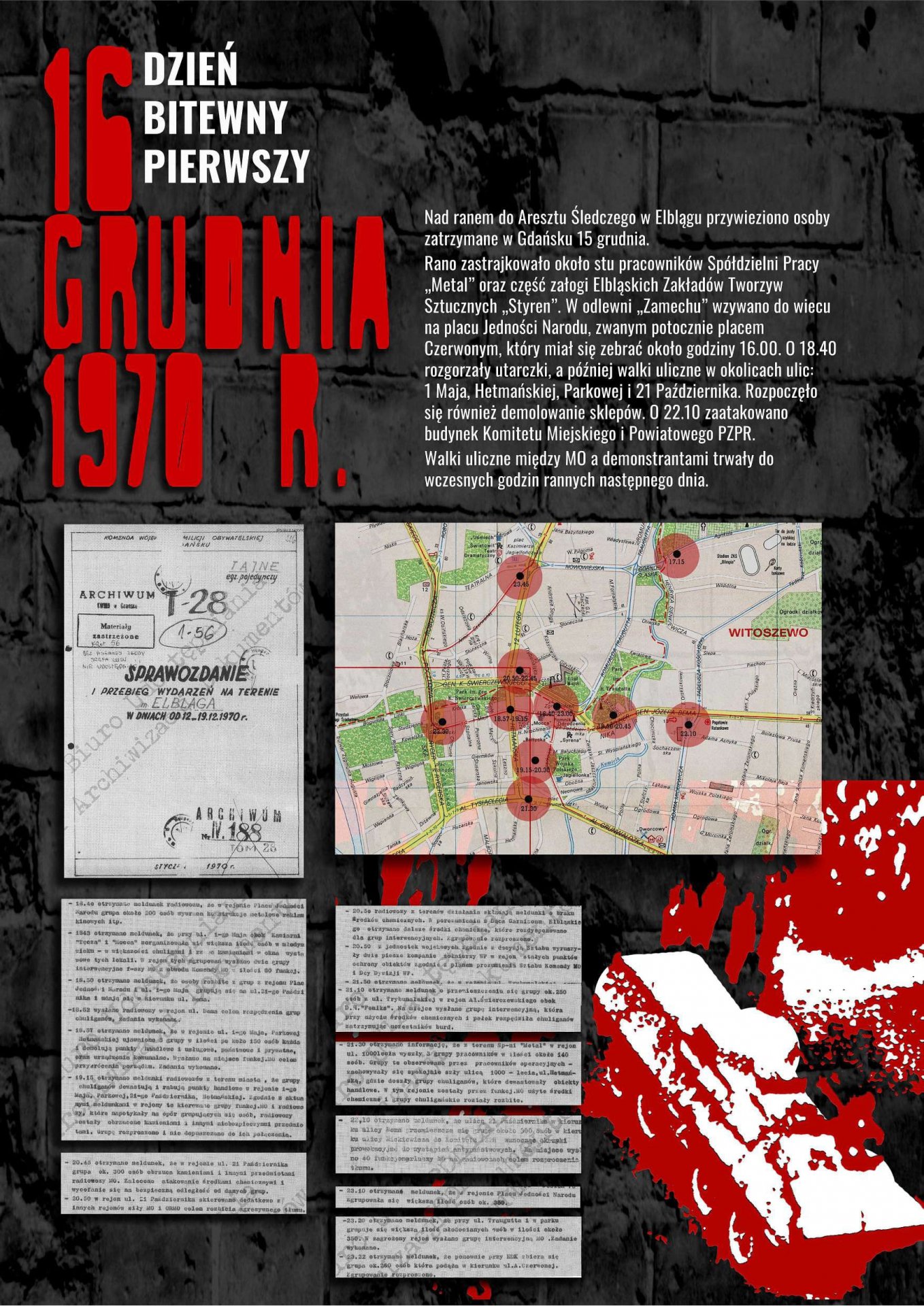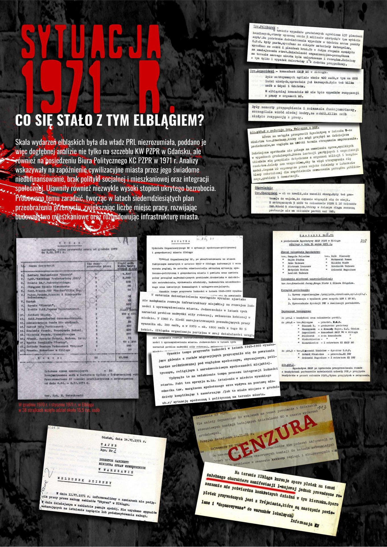 Wystawa została przygotowana przez Oddziałowe Biuro Edukacji Publicznej IPN w Gdańsku, Bibliotekę Elbląską im. C. Norwida oraz Archiwum Państwowe w Gdańsku jako odpowiedź na zapotrzebowanie społeczne związane z upowszechnianiem wiedzy dotyczącej najnowszej historii Elbląga lat 1970–1971. Ekspozycja przybliża przyczyny, przebieg i rozwój sytuacji w Elblągu w grudniu 1970 r. oraz styczniu 1971 r. poprzez wybrane fragmenty dokumentów archiwalnych i relacji prasowych. Znaczna część materiałów prezentowanych na wystawie dotyczy represji wobec zatrzymanych demonstrantów wraz z opisami tych zdarzeń, sporządzanymi wówczas i gromadzonymi przez związki zawodowe w celu wypłaty odszkodowań.