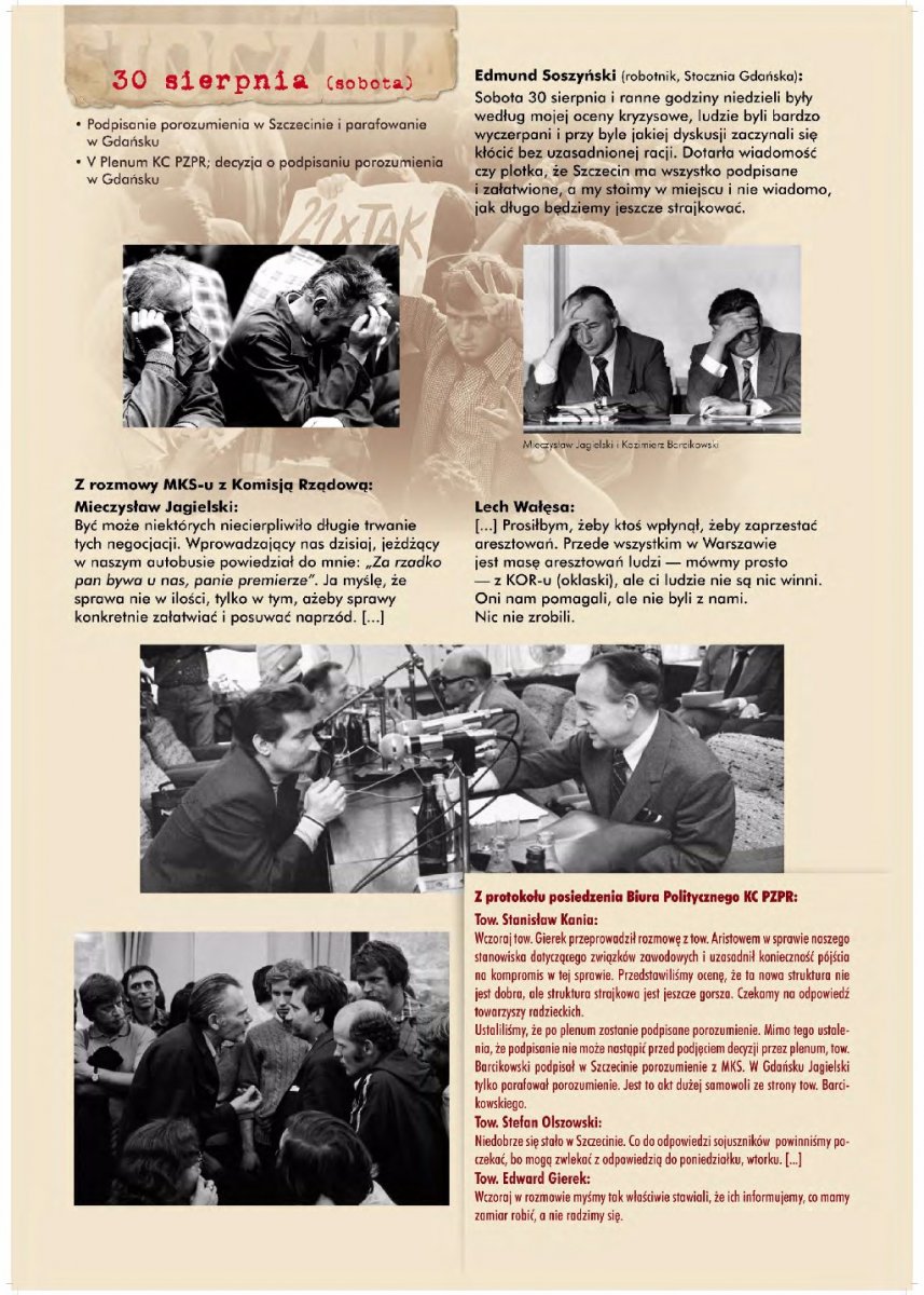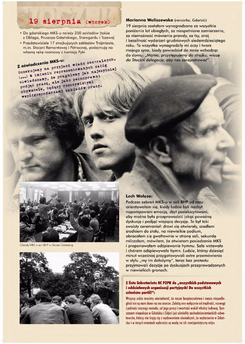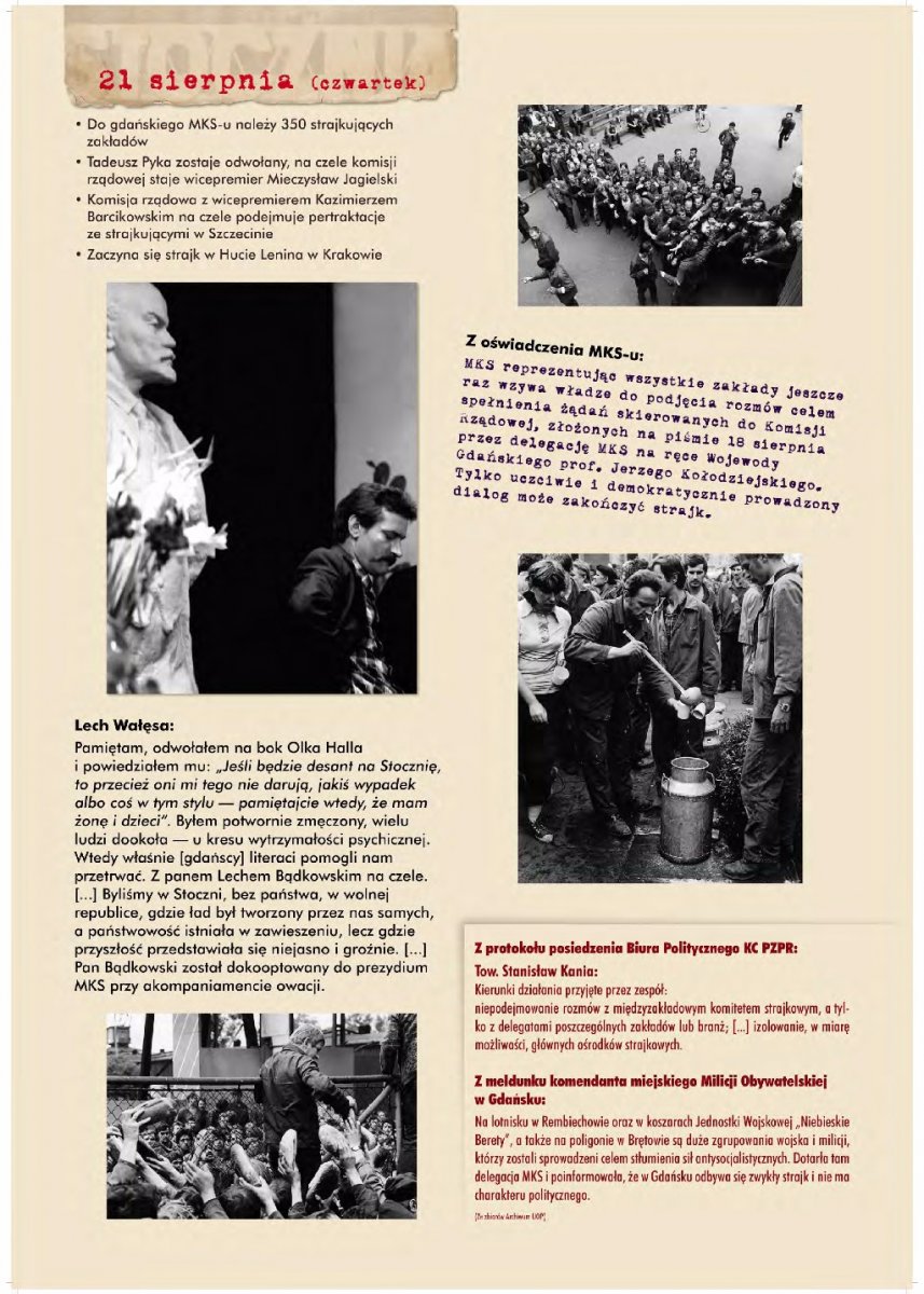Materiał zaprezentowany na wystawie obejmuje wspomnienia i wypowiedzi uczestników tamtych wydarzeń: przywódców i inicjatorów strajku jak Lech Wałęsa czy Bogdan Borusewicz, zwykłych robotników oraz postronnych obserwatorów. Nie brakuje także wypowiedzi osób stojących po drugiej stronie, czołowych członków KC PZPR – Mieczysława Jagielskiego czy Edwarda Gierka. Istotnym elementem wystawy są prezentowane teksty ulotek, wydawanych zarówno przez protestujących jak i stronę rządową. Na ekspozycji zobaczyć można także stenogramy oraz fragmenty przebiegu rozmów na forum MKS-u, jak i podczas posiedzeń Biura Politycznego KC PZPR. Całość wystawy okraszona jest bogatym materiałem fotograficznym, prezentującym w doskonały sposób wszystkie etapy wydarzeń, jakie miały miejsce w okresie Sierpnia ‘80.