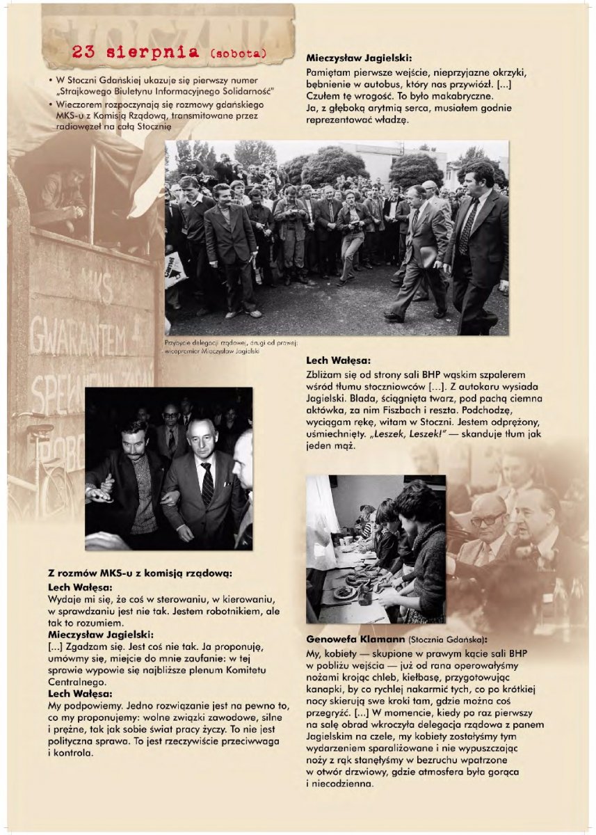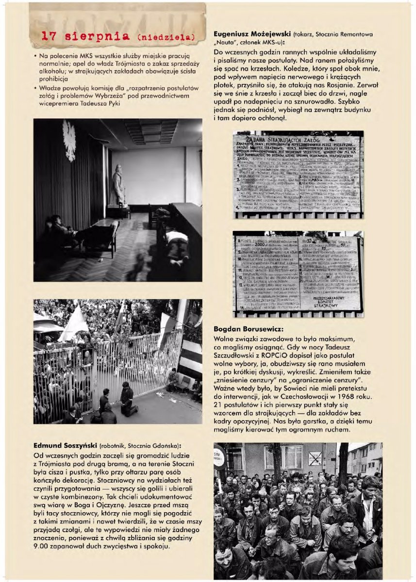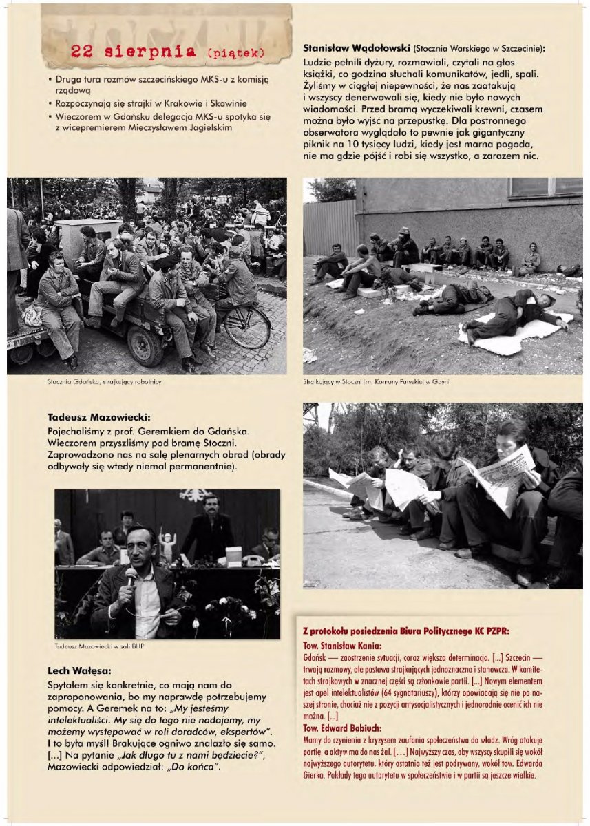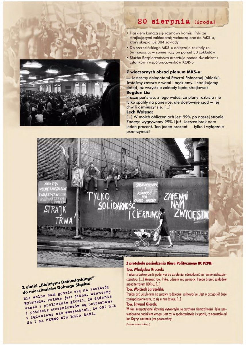 Materiał zaprezentowany na wystawie obejmuje wspomnienia i wypowiedzi uczestników tamtych wydarzeń: przywódców i inicjatorów strajku jak Lech Wałęsa czy Bogdan Borusewicz, zwykłych robotników oraz postronnych obserwatorów. Nie brakuje także wypowiedzi osób stojących po drugiej stronie, czołowych członków KC PZPR – Mieczysława Jagielskiego czy Edwarda Gierka. Istotnym elementem wystawy są prezentowane teksty ulotek, wydawanych zarówno przez protestujących jak i stronę rządową. Na ekspozycji zobaczyć można także stenogramy oraz fragmenty przebiegu rozmów na forum MKS-u, jak i podczas posiedzeń Biura Politycznego KC PZPR. Całość wystawy okraszona jest bogatym materiałem fotograficznym, prezentującym w doskonały sposób wszystkie etapy wydarzeń, jakie miały miejsce w okresie Sierpnia ‘80.