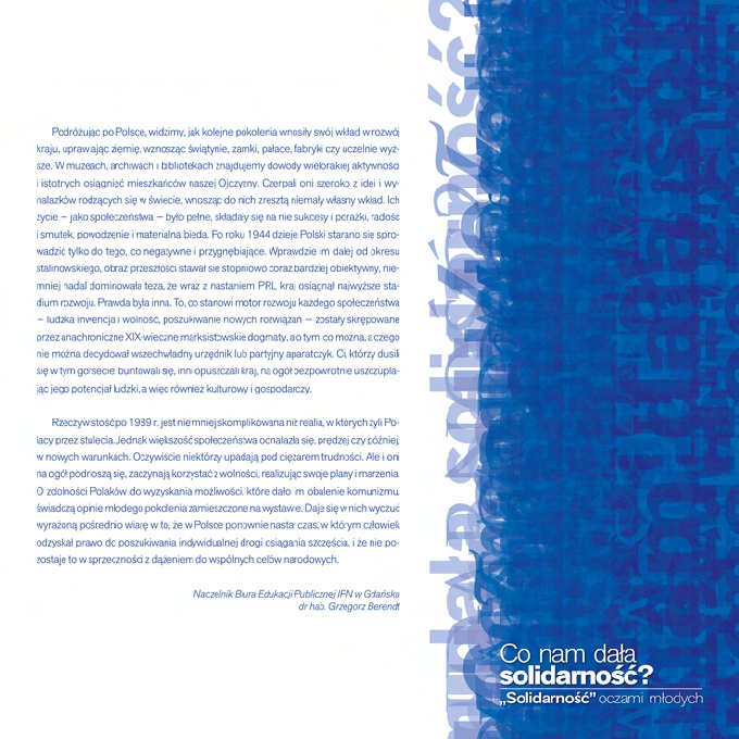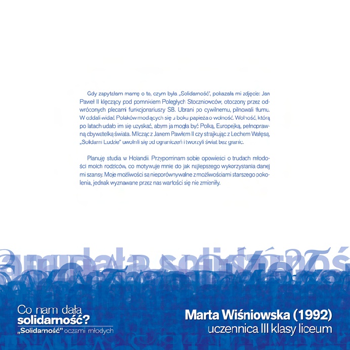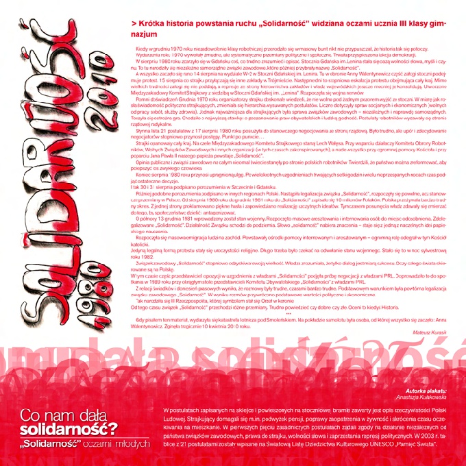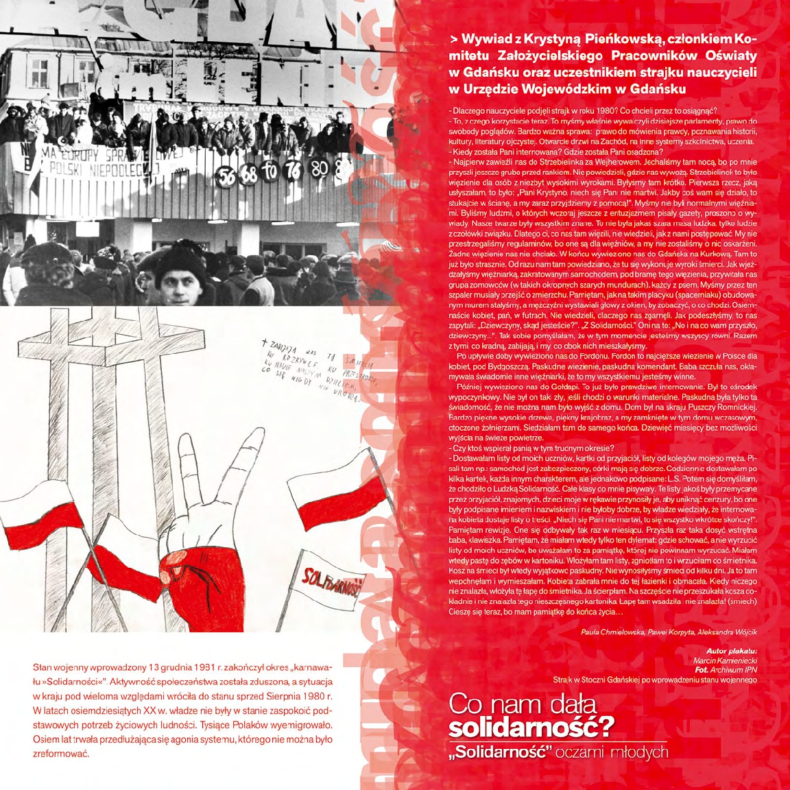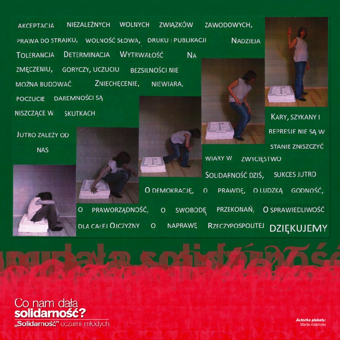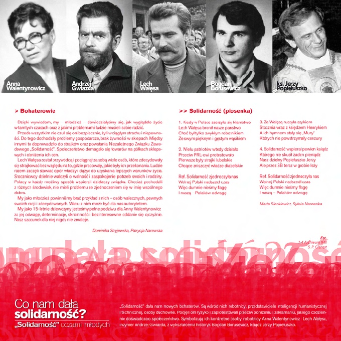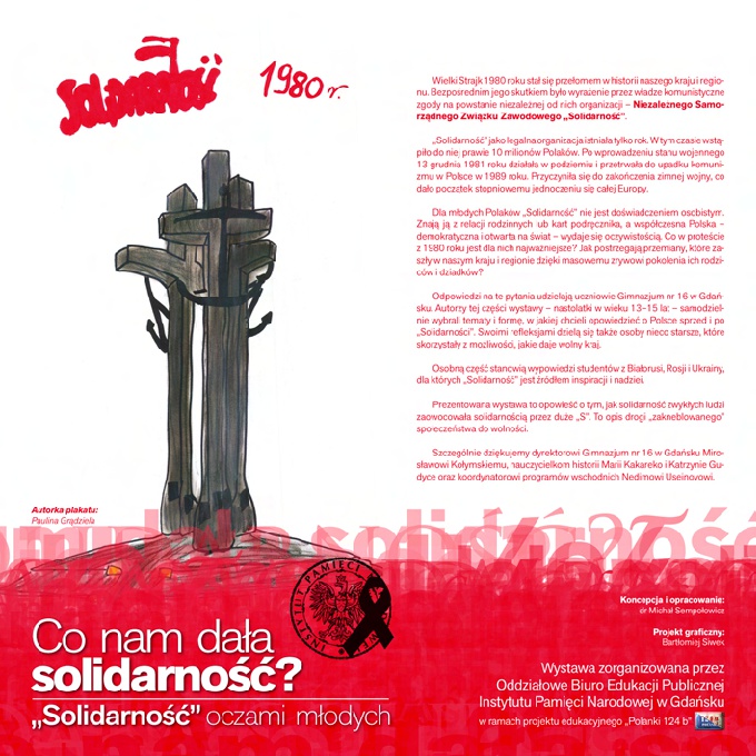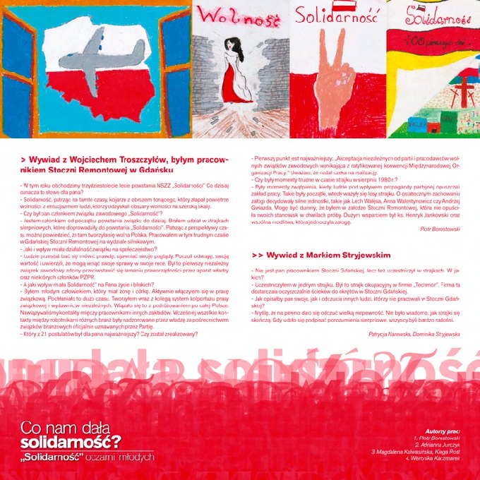 Wystawa została przygotowana w trzydziestą rocznicę powstania NSZZ „Solidarność” w ramach projektu edukacyjnego „Polanki 124 b”. Główną część wystawy stanowią prace uczniów Gimnazjum nr 16 w Gdańsku. Autorzy – poprzez plakaty, wywiady i wiersze – opowiadają o realiach Polski Ludowej, strajkach w 1980 roku oraz przemianach, do których przyczyniła się „Solidarność”. Na ekspozycję składają się także wypowiedzi absolwentów Uniwersytetu Gdańskiego oraz studentów z Białorusi, Rosji i Ukrainy. Młodzi ludzie dostrzegają, że mogą się cieszyć wolnością dzięki ryzyku i wysiłkowi podjętemu przez dziadków i rodziców. Opinie obcokrajowców pokazują, że chcą się oni od nas uczyć, i skłaniają do zastanowienia, na czym polega solidarność dziś.