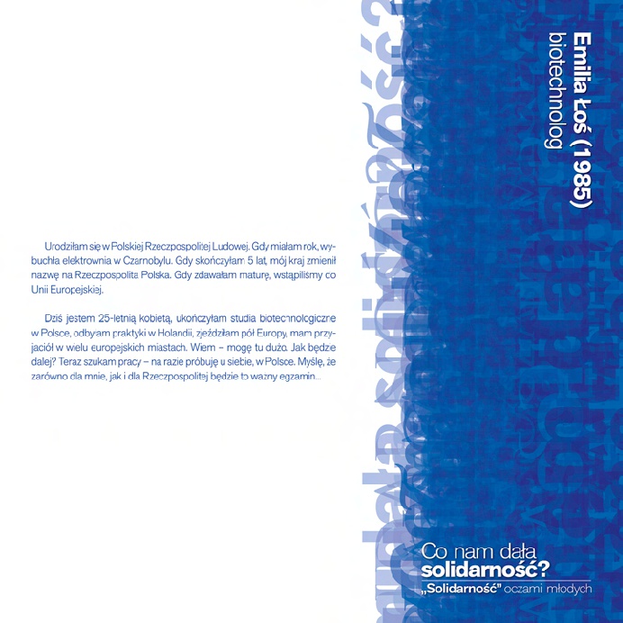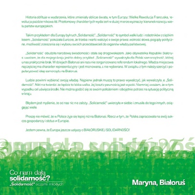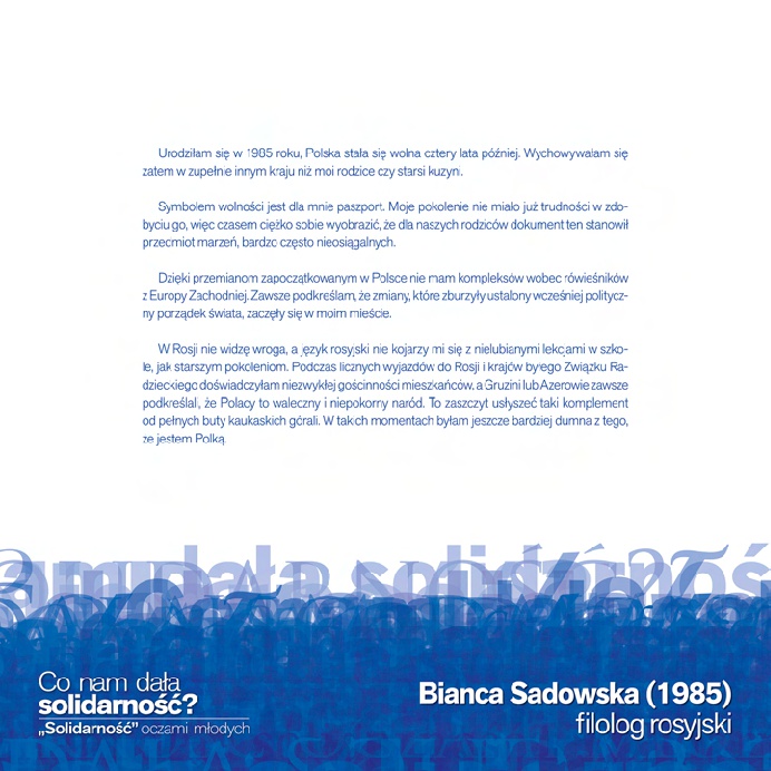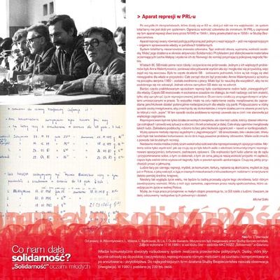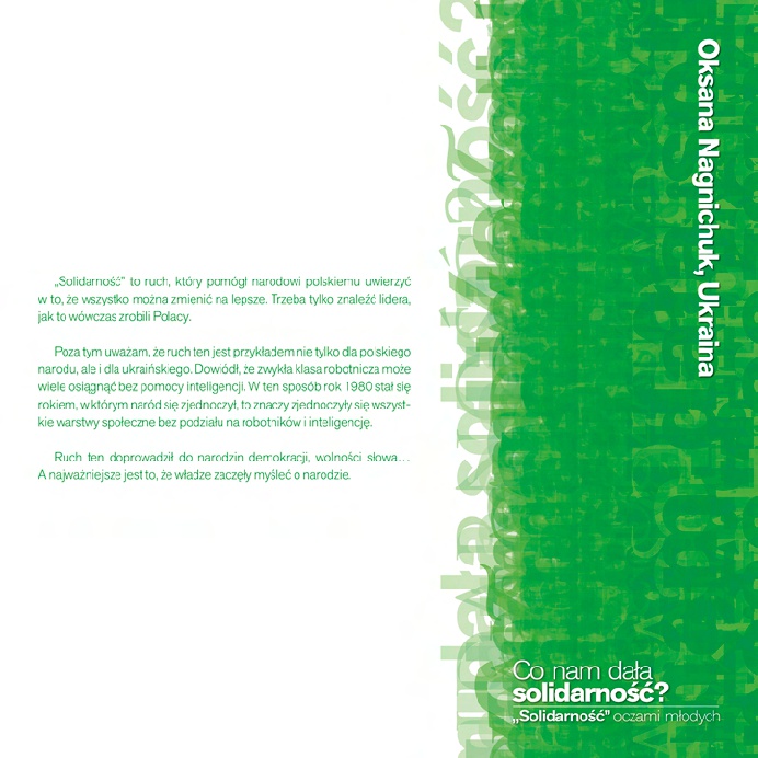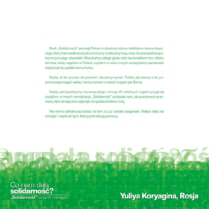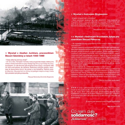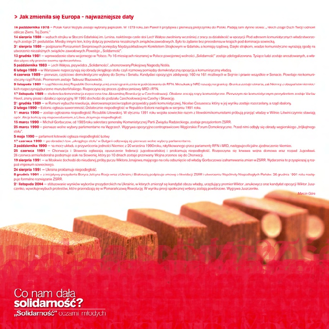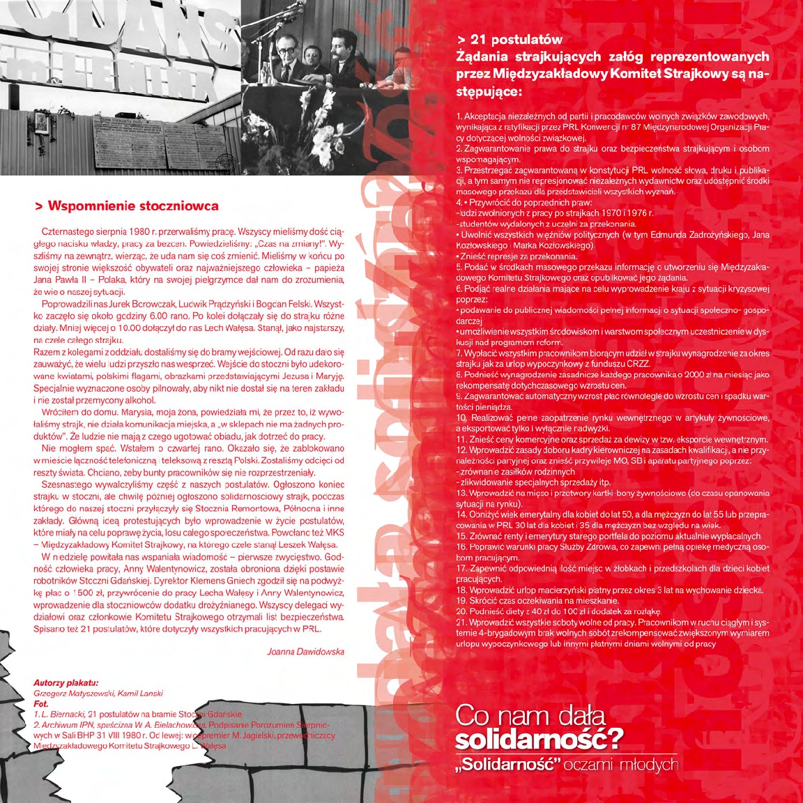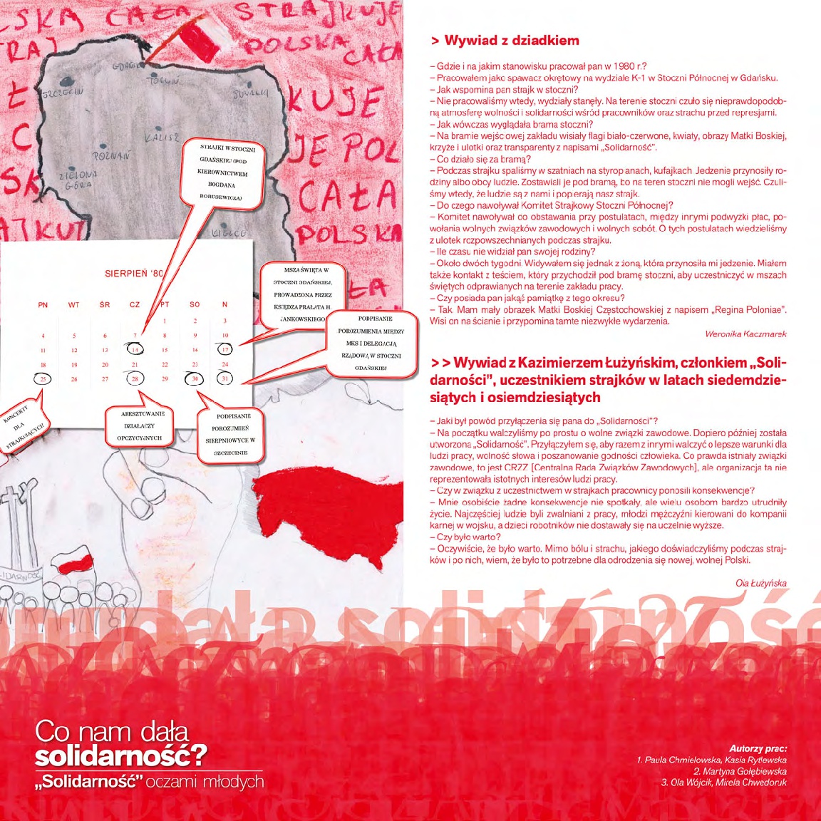 Wystawa została przygotowana w trzydziestą rocznicę powstania NSZZ „Solidarność” w ramach projektu edukacyjnego „Polanki 124 b”. Główną część wystawy stanowią prace uczniów Gimnazjum nr 16 w Gdańsku. Autorzy – poprzez plakaty, wywiady i wiersze – opowiadają o realiach Polski Ludowej, strajkach w 1980 roku oraz przemianach, do których przyczyniła się „Solidarność”. Na ekspozycję składają się także wypowiedzi absolwentów Uniwersytetu Gdańskiego oraz studentów z Białorusi, Rosji i Ukrainy. Młodzi ludzie dostrzegają, że mogą się cieszyć wolnością dzięki ryzyku i wysiłkowi podjętemu przez dziadków i rodziców. Opinie obcokrajowców pokazują, że chcą się oni od nas uczyć, i skłaniają do zastanowienia, na czym polega solidarność dziś.