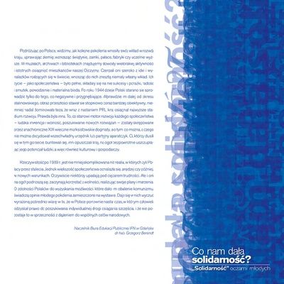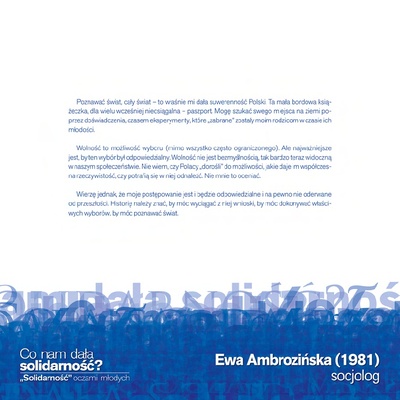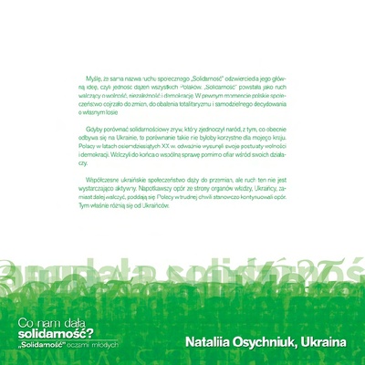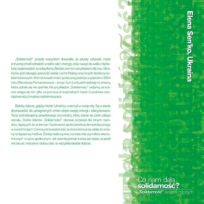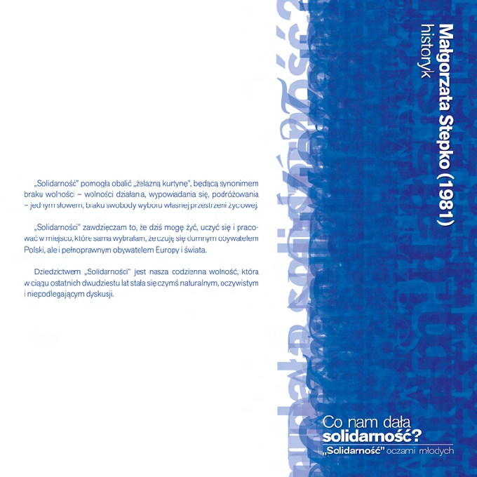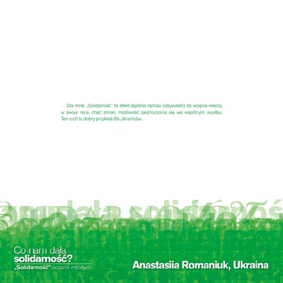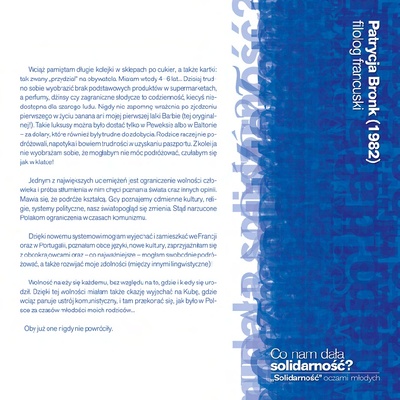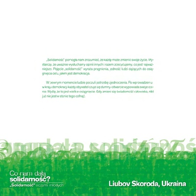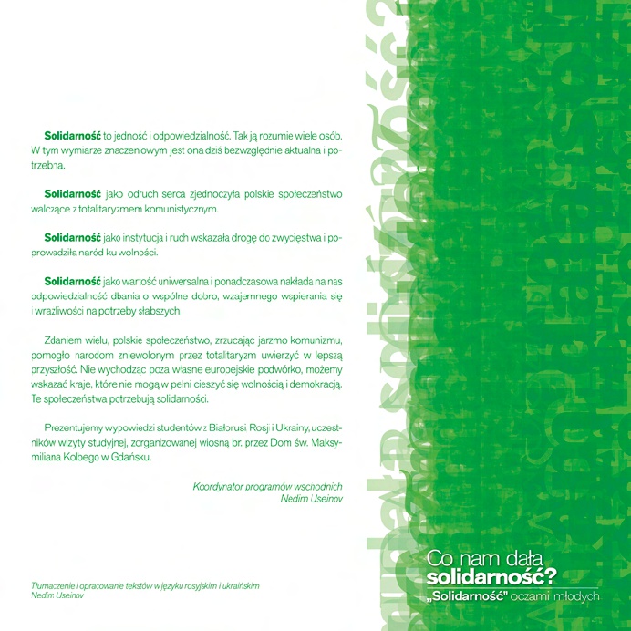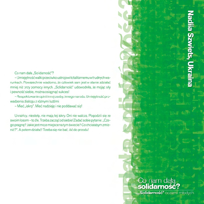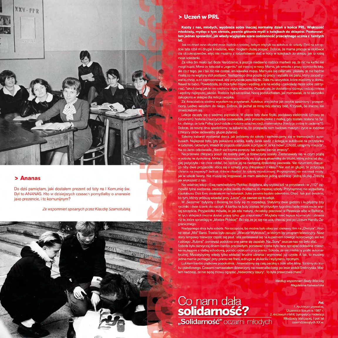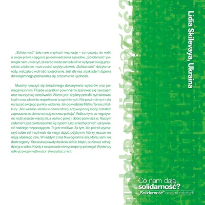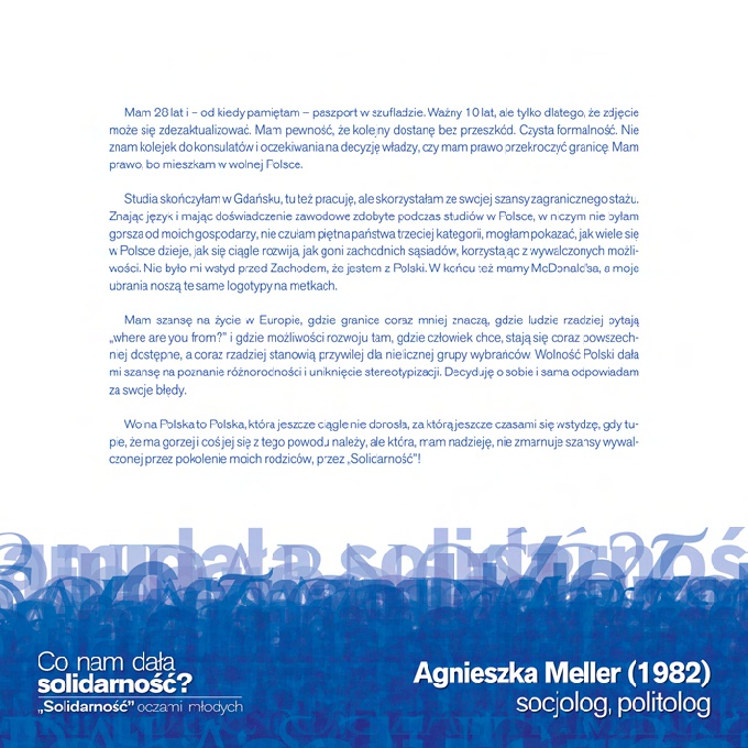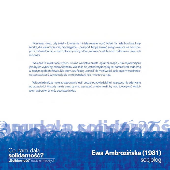 Wystawa została przygotowana w trzydziestą rocznicę powstania NSZZ „Solidarność” w ramach projektu edukacyjnego „Polanki 124 b”. Główną część wystawy stanowią prace uczniów Gimnazjum nr 16 w Gdańsku. Autorzy – poprzez plakaty, wywiady i wiersze – opowiadają o realiach Polski Ludowej, strajkach w 1980 roku oraz przemianach, do których przyczyniła się „Solidarność”. Na ekspozycję składają się także wypowiedzi absolwentów Uniwersytetu Gdańskiego oraz studentów z Białorusi, Rosji i Ukrainy. Młodzi ludzie dostrzegają, że mogą się cieszyć wolnością dzięki ryzyku i wysiłkowi podjętemu przez dziadków i rodziców. Opinie obcokrajowców pokazują, że chcą się oni od nas uczyć, i skłaniają do zastanowienia, na czym polega solidarność dziś.