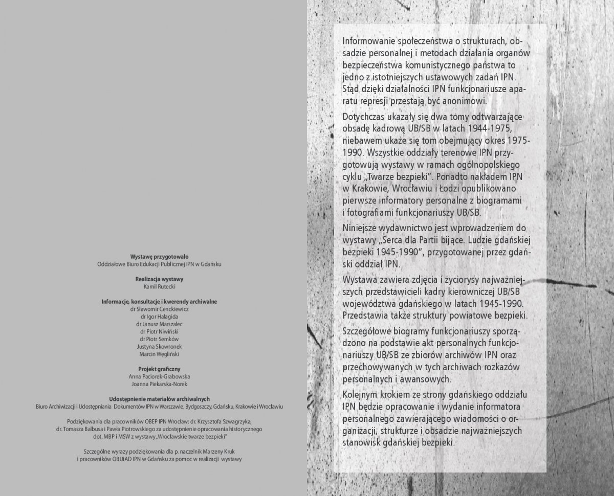Wystawa „Serca dla Partii bijące. Ludzie gdańskiej bezpieki 1945-1990” jest częścią ogólnopolskiego projektu wystawienniczego IPN, mającego na celu przybliżenie społeczeństwu historii bezpieki i sylwetek kadry kierowniczej UB/SB, w pierwszym rzędzie odpowiedzialnej za represje wobec Polaków, sprzeciwiających się utrzymywaniu w kraju reżimu komunistycznego.